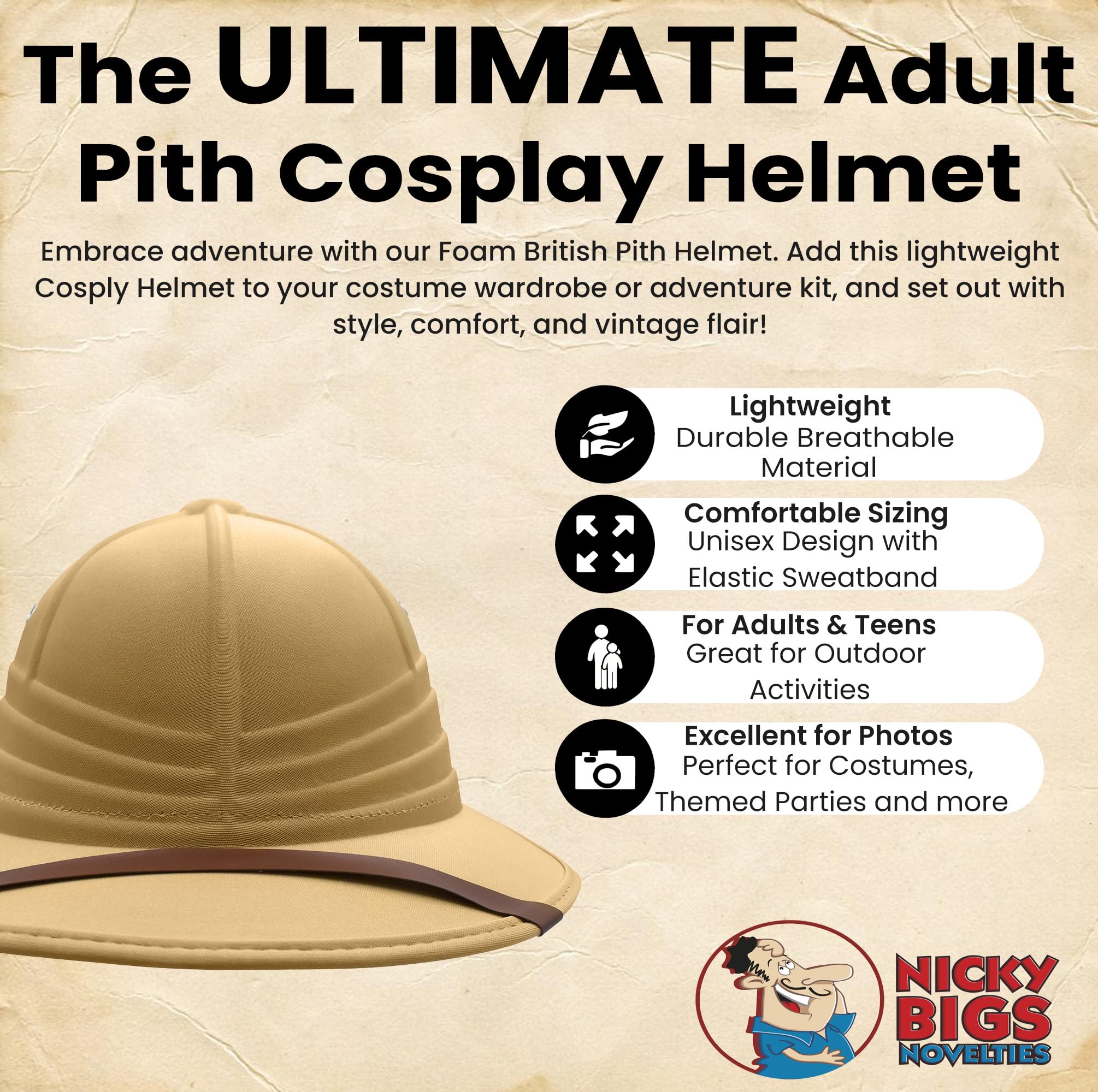 LIGHTWEIGHT & COMFORTABLE Made with durable materials and a lightweight foam core, this pith helmet features breathability and comfort. The built-in sweatband ensures a snug fit, making it ideal for extended use. Whether you're out in the sun or dressing up for a costume event, this safari hat keeps you cool and stylish.