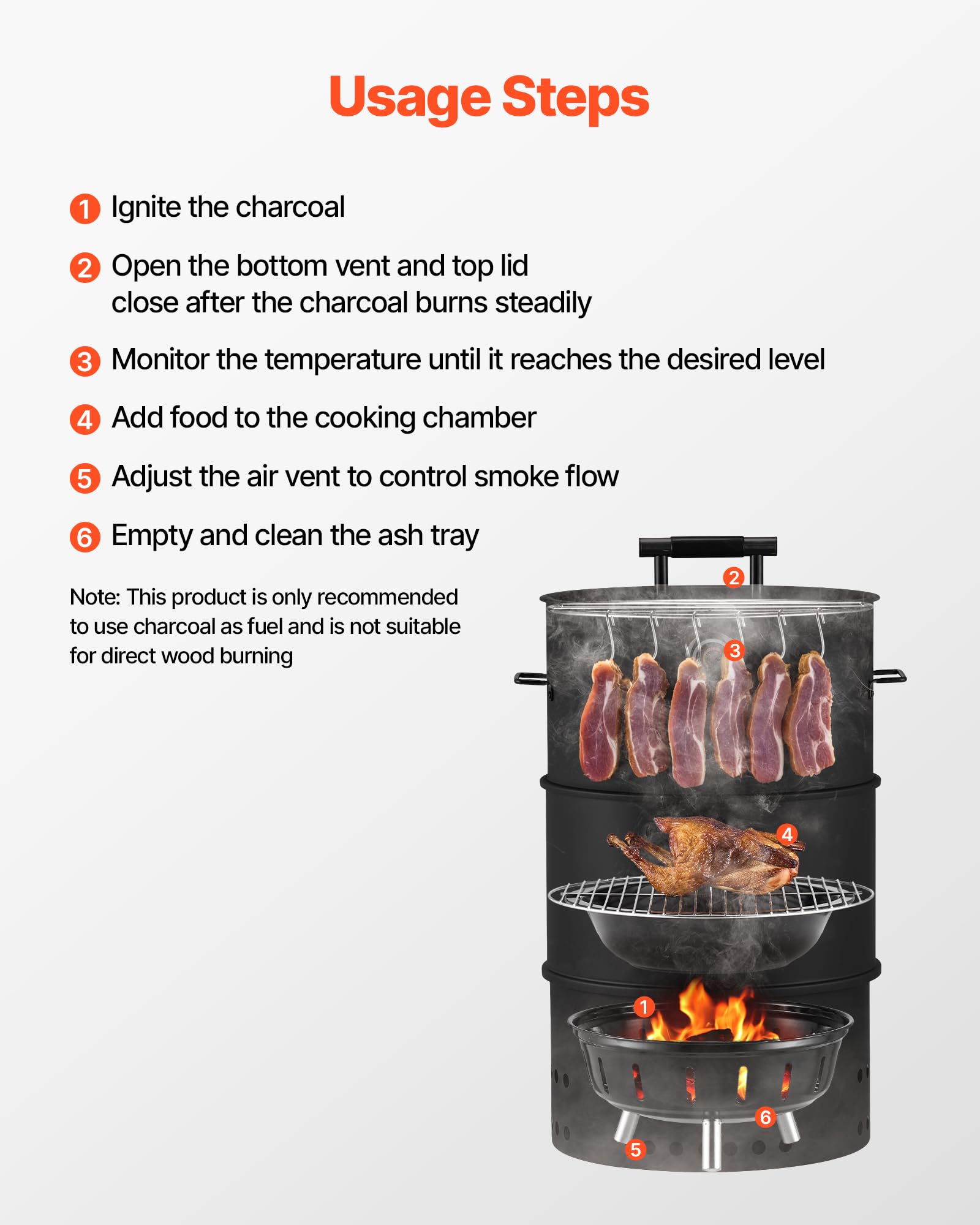 4-in-1 Versatile Use: VEVOR charcoal smoker includes 2 cooking grates and a hanging rod for multiple cooking options.. Open the lid for single- or double-layer grilling, close it for dual-layer smoking, or hang meat on the rod for a rich, flavorful smoking