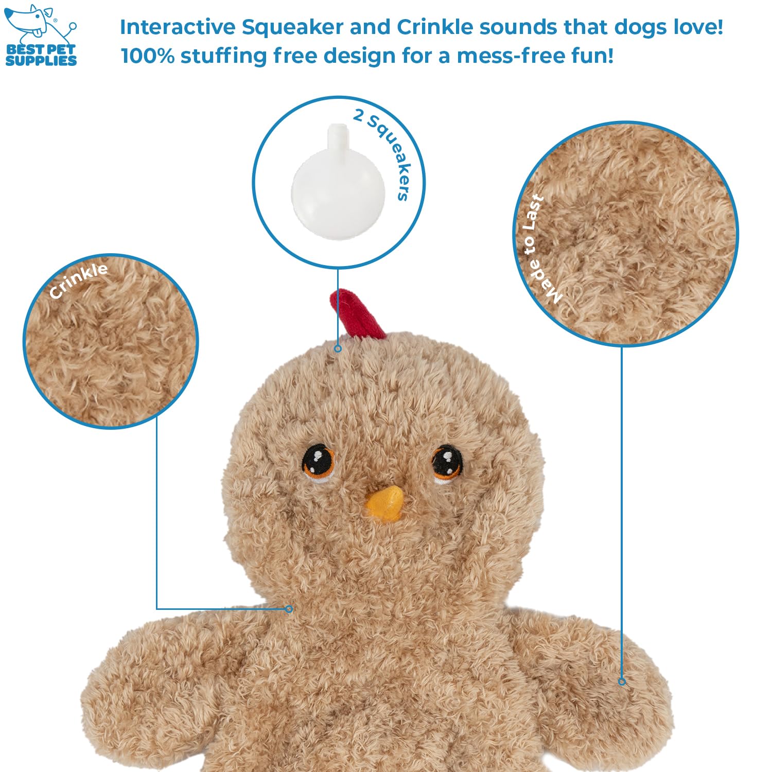 Squeaks and Crinkles – These dog chew toys feature crinkle material in the legs and stuffing in the head that squeaks to give them multiple stimulation points for a more interactive play. And they come in exciting colors, too!