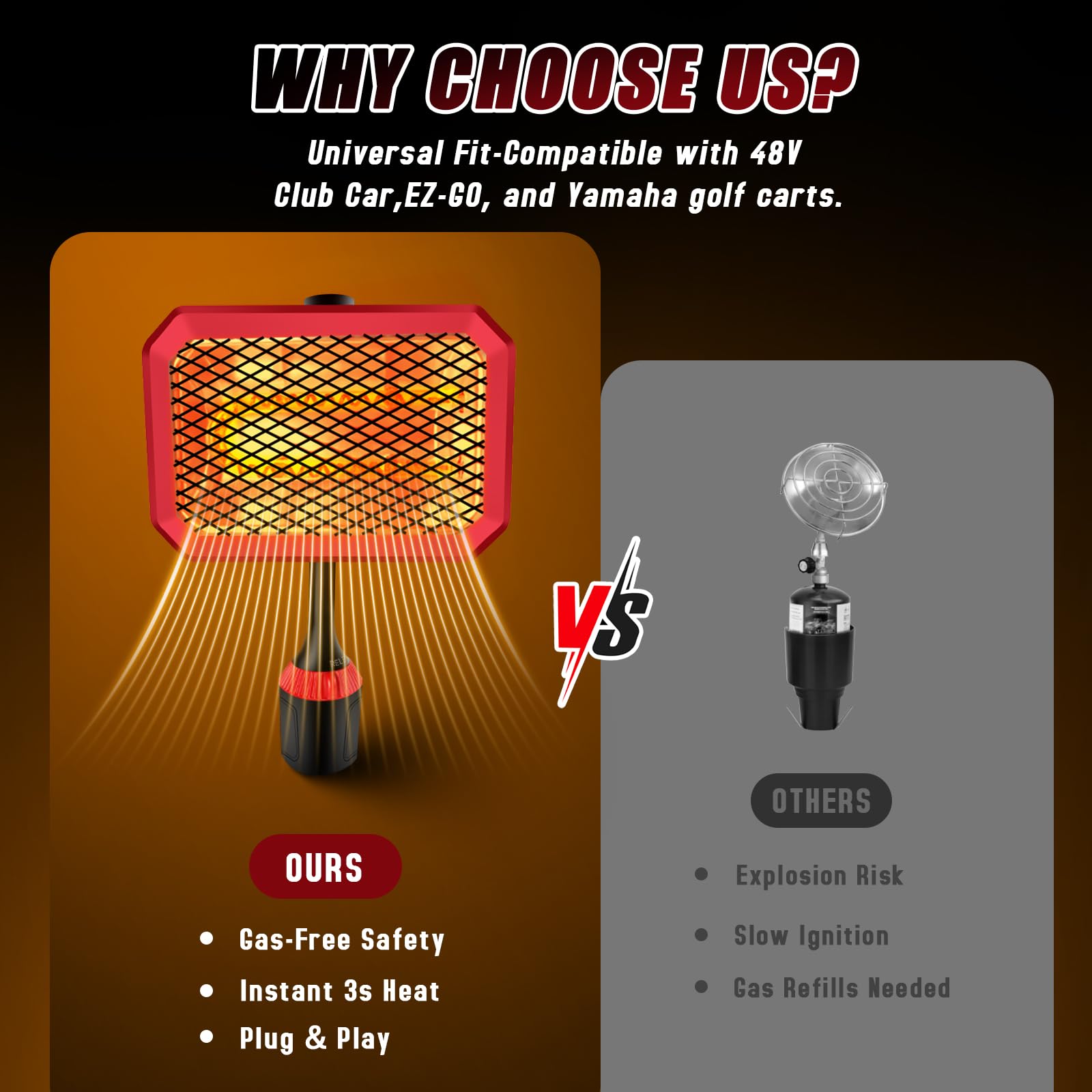 No Propane Needed – Carbon fiber heating saves you the cost of propane refills, offers 100% safe use with a waterproof inline fuse, and eliminates carbon monoxide risks—perfect for golf carts in cold weather