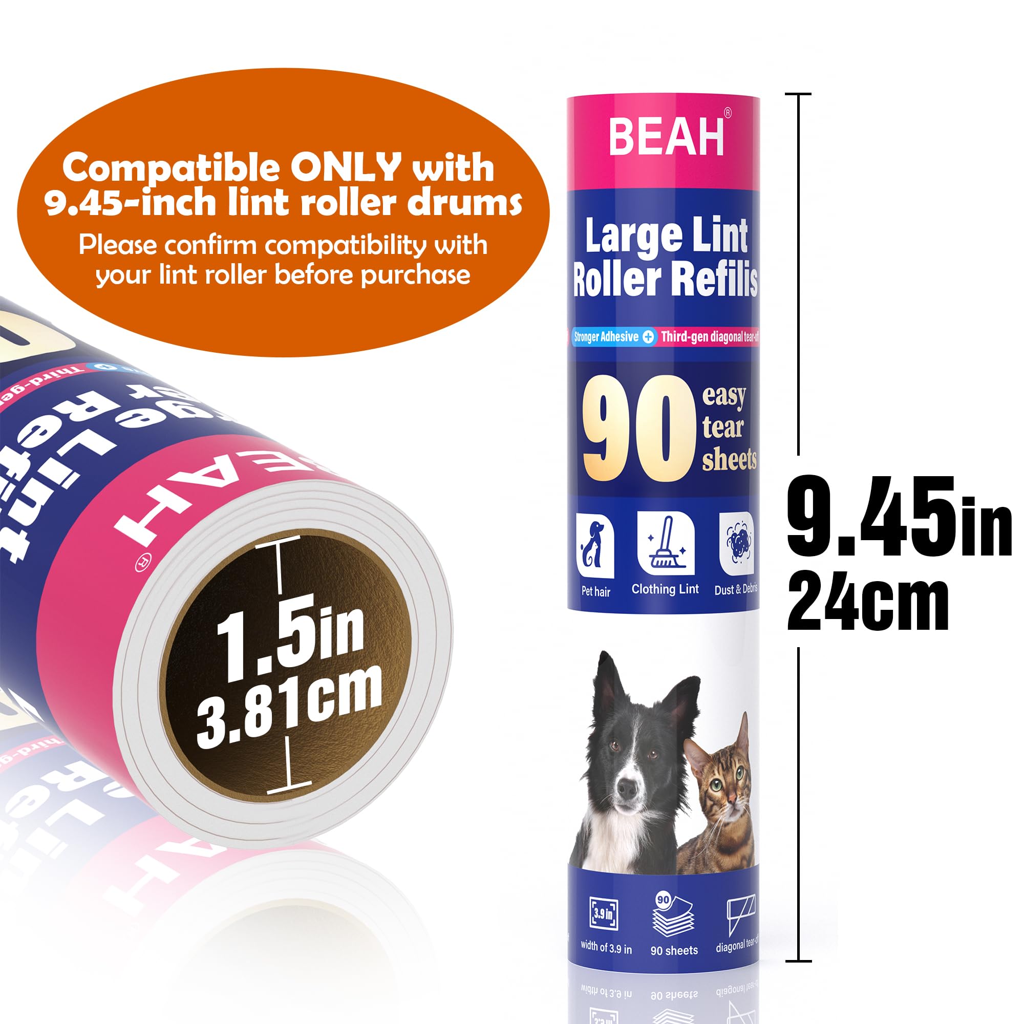 SPIRAL EASY-TEAR DESIGN & EASY REPLACEMENT: The unique spiral structure prevents interlayer sticking. With clear tear lines, each sheet tears off cleanly. The 1.5-inch core ensures perfect compatibility with BEAH and most 9.45-inch floor lint rollers, making replacement quick and simple.