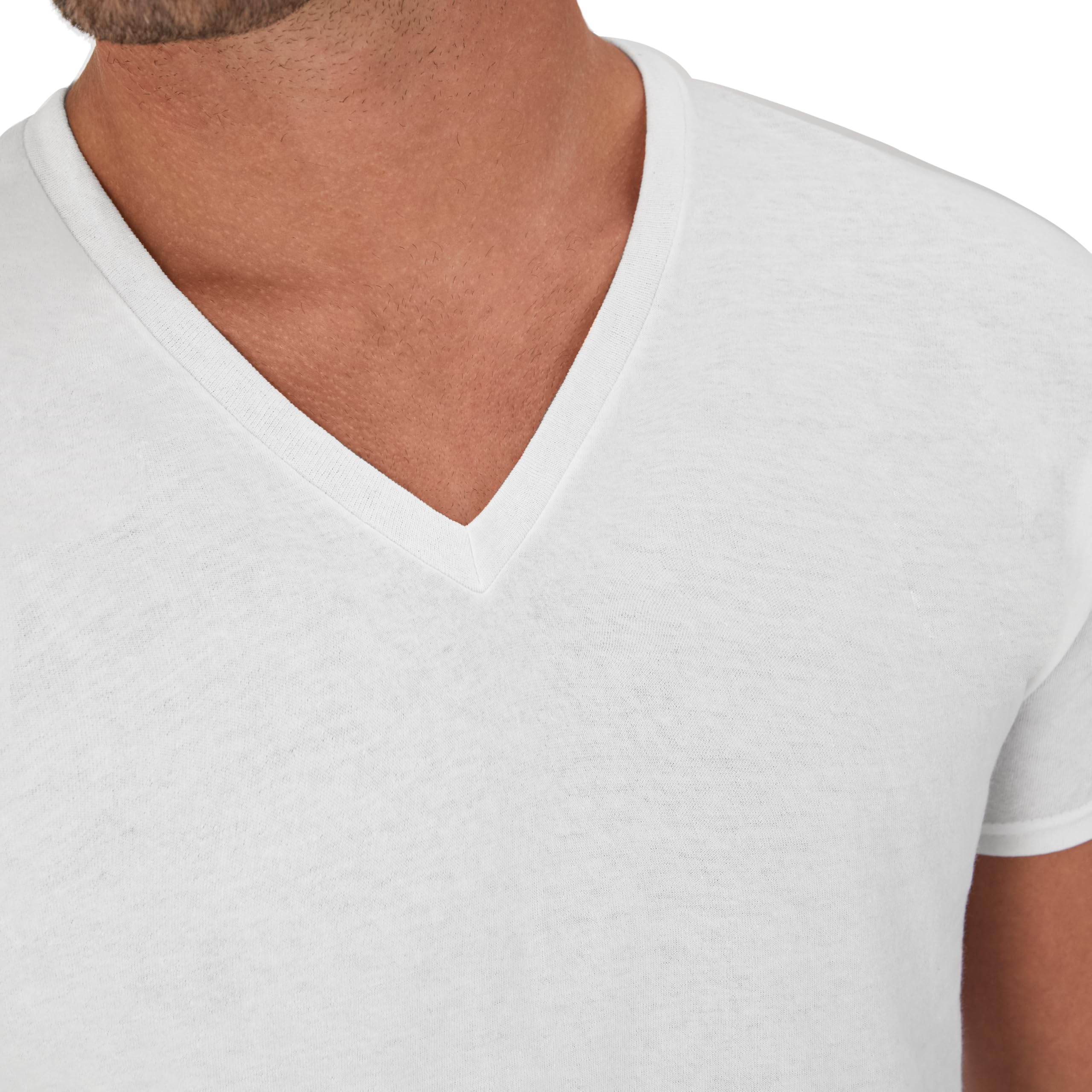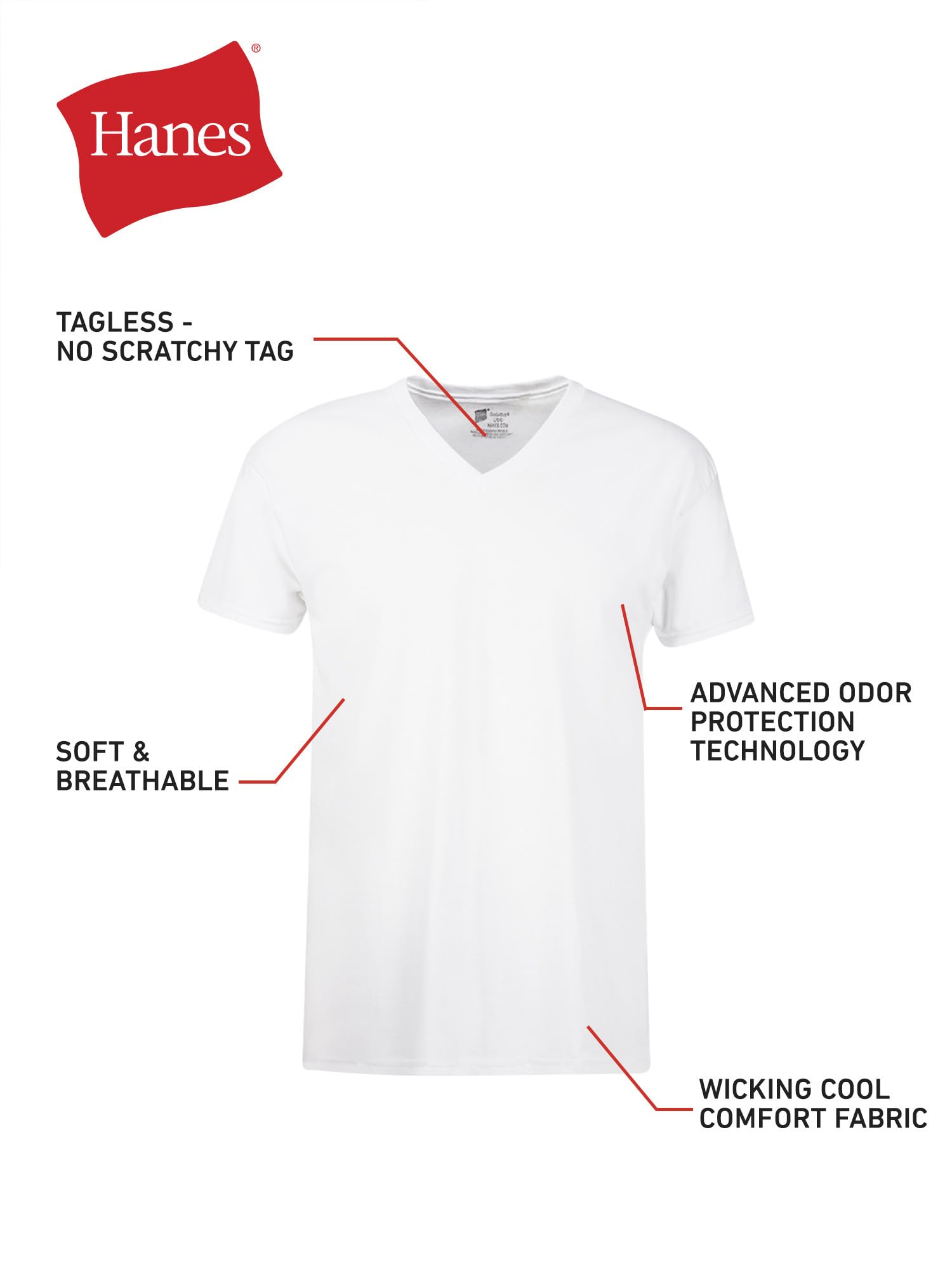 Description Here's a quality basic from the experts at Hanes®, the folks who know a lot about essential comfort. Whether you wear this cotton V-neck T-shirt as an undershirt or as a tee, you'll appreciate how Hanes® has taken a basic style and made it even better. These ComfortSoft® cotton tees are made with Hanes® FreshIQ™ advanced odor protection technology that fights odor-causing bacteria for all-day freshness and with Cool Comfort® cotton that wicks away moisture to keep you cool and dry. And because the cotton is preshrunk, these men's V-neck undershirts will keep their size and shape through many washings. You'll also appreciate the roomy armholes and relaxed fit for total comfort and ease of movement. Stock up on these Hanes®-best cotton V-neck tees in a convenient multi-pack and start wearing a better-than-basic undershirt.