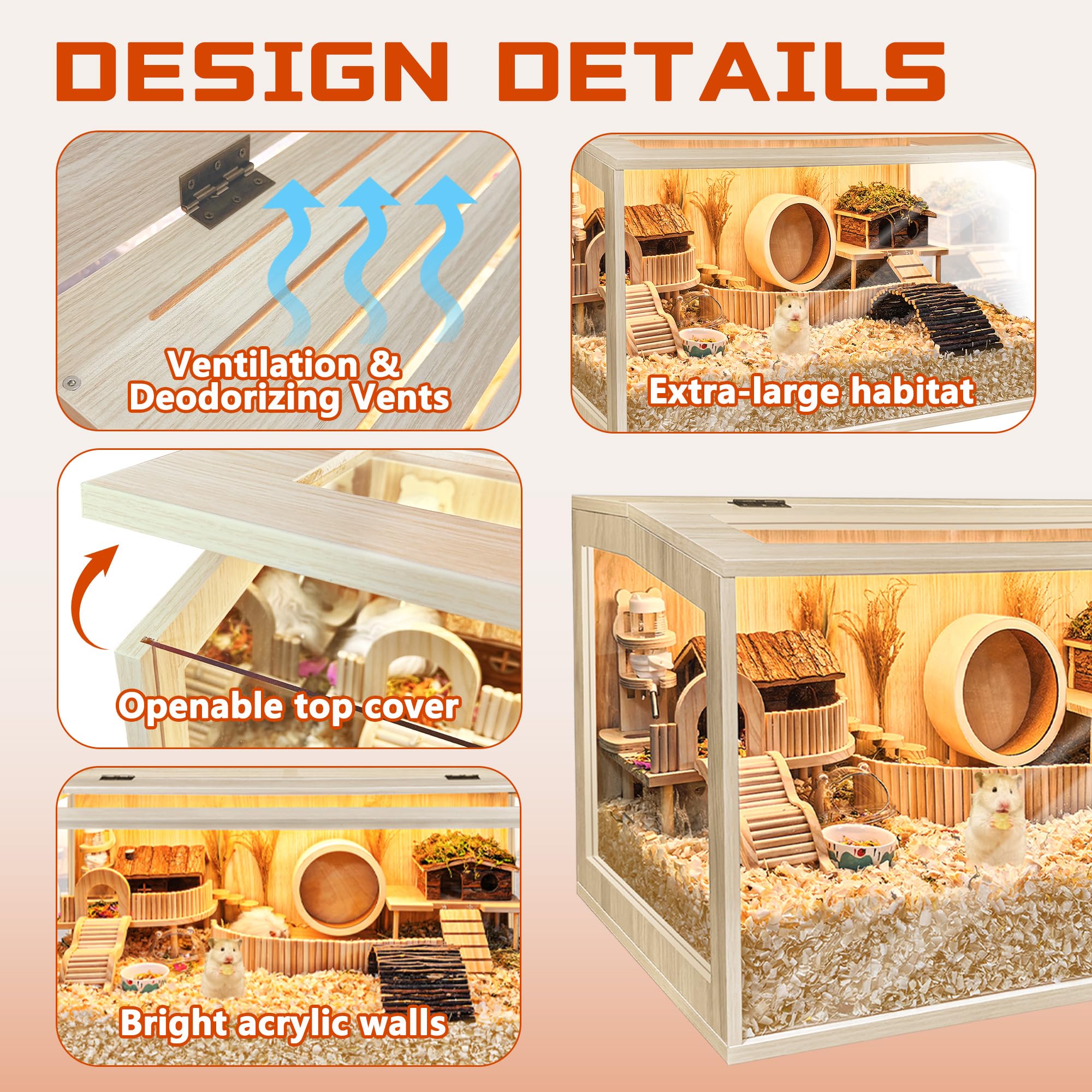 【Thick Bedding Matters】Research shows it’s best to have plenty of bedding so your hamsters can make a burrow just like they would in the wild. The extreme large interactive space of our cage is able to hold thick bedding and toy system for your pets to dig and explore. It's easy to arrange their hideout, sand bath area, hamster wheel, or exploring scene in the cage, which results in a far happier and less stressed hamster compare to the wire cage. We offer 4 different sizes, feel free to choose from 24-48in length. Note: The inner decoration is not included in the package