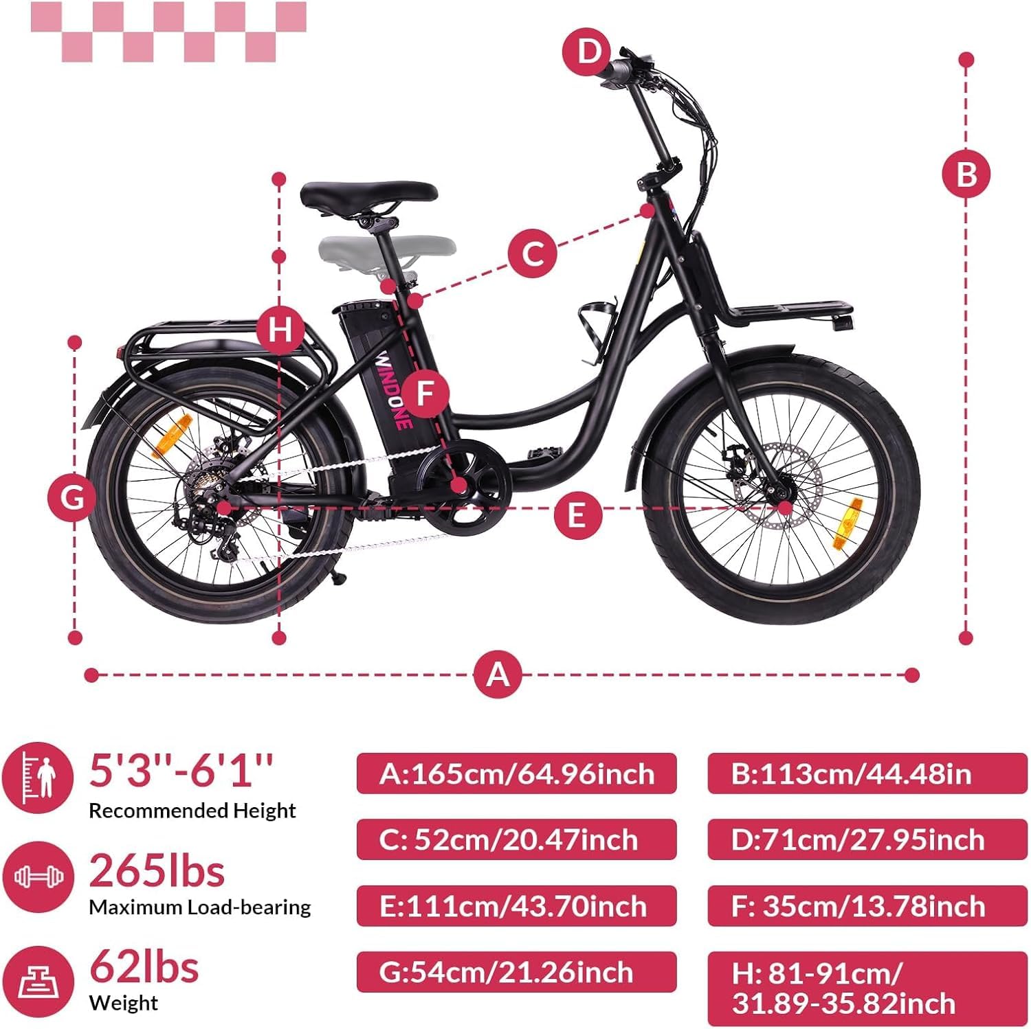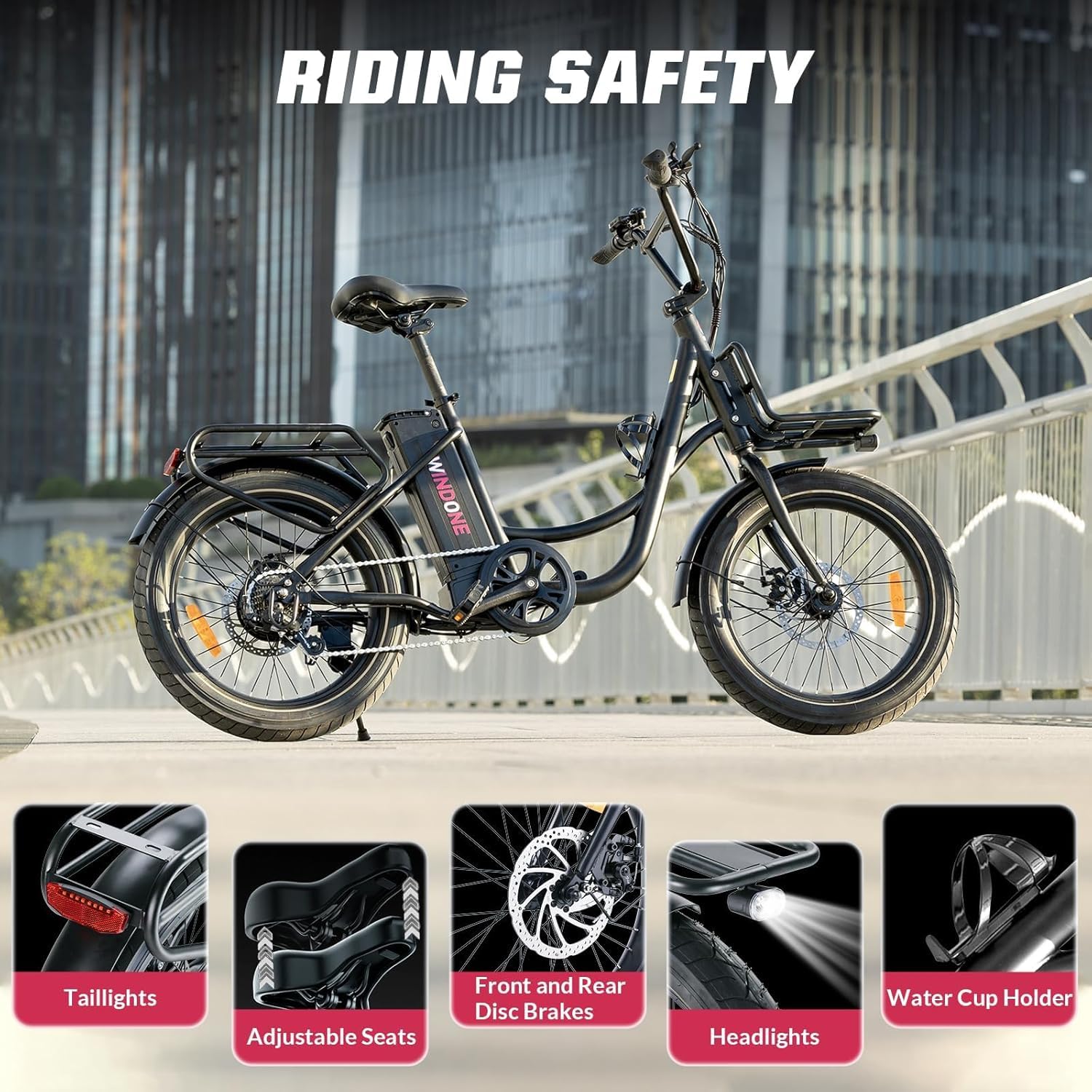 【Comfortable Ride for Everyone】The 20x3" wide tires and step-thru frame make the E20 e-bike easy to mount and ride, even for shorter riders or those wearing skirts or dresses. The road-friendly tires deliver excellent grip and stability, while the adjustable seat and handlebar angle help relieve pressure on your shoulders, hands, and back—for a smoother, more ergonomic ride.