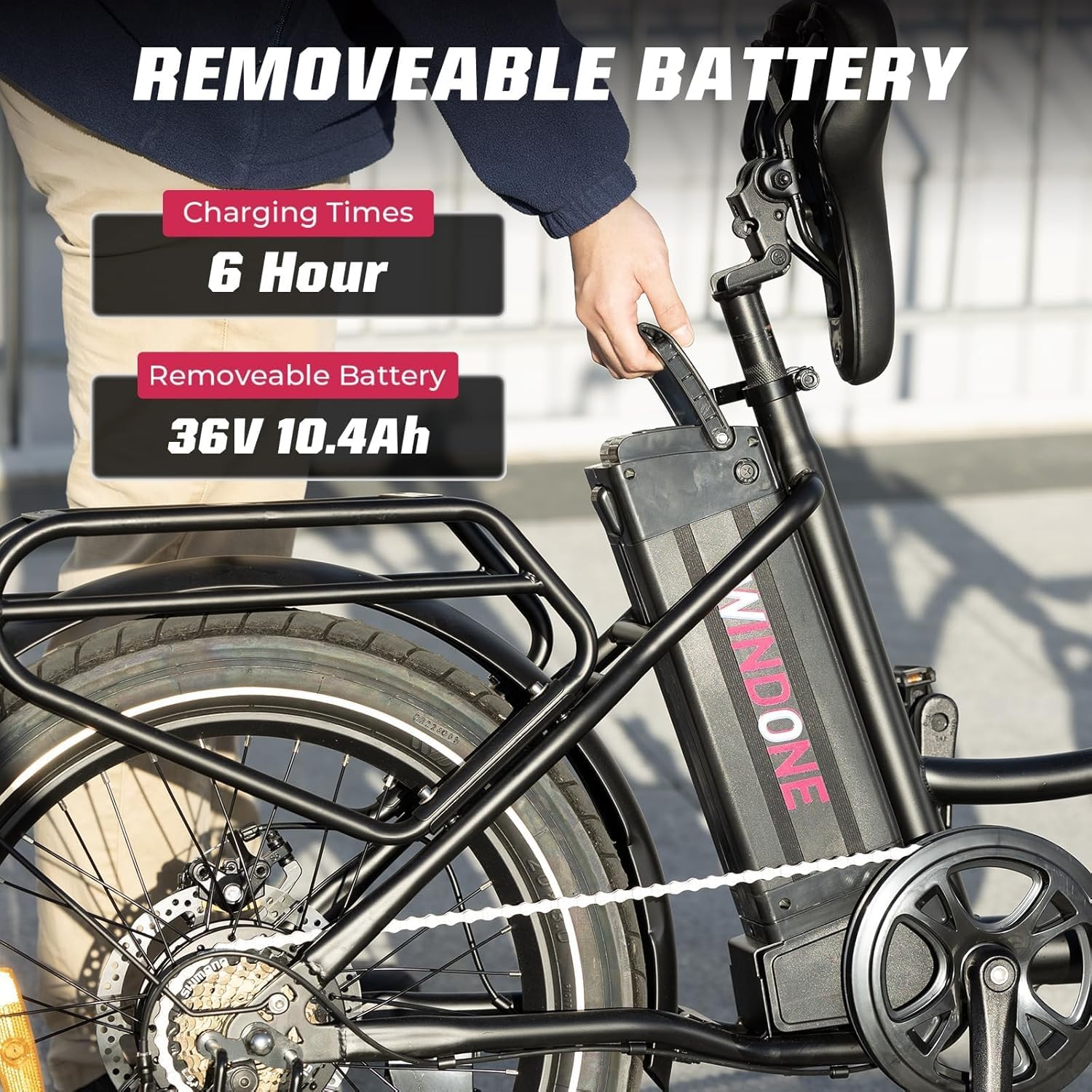 【Long-Lasting & Convenient Battery】Go farther with the 36V 10.4Ah (374.4Wh) removable battery, offering up to 40 miles in pedal assist mode and 23 miles in pure electric mode. Fully recharges in about 6 hours—perfect for overnight charging or topping up while you work.