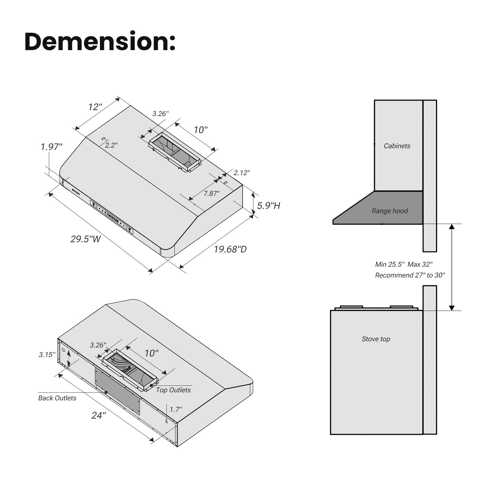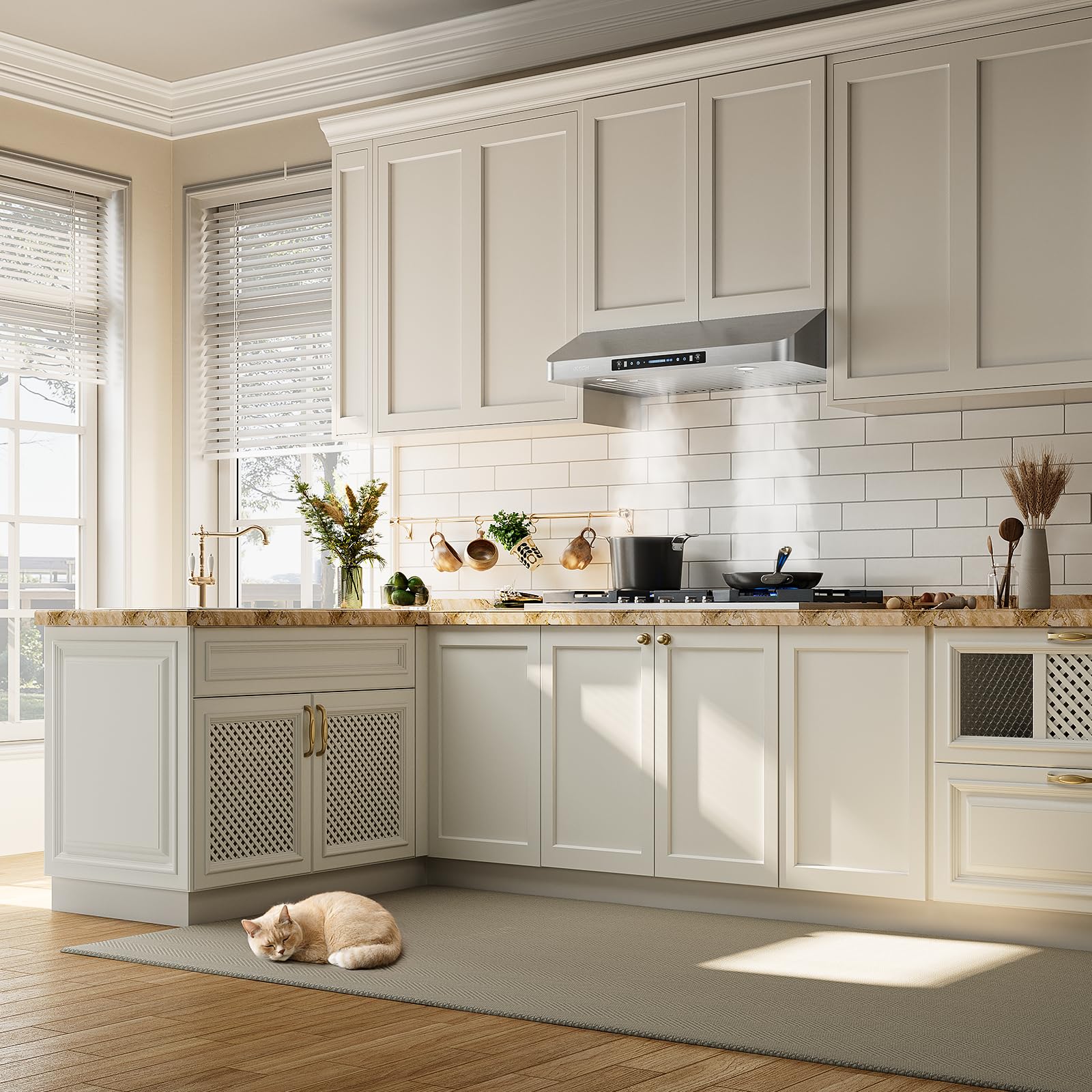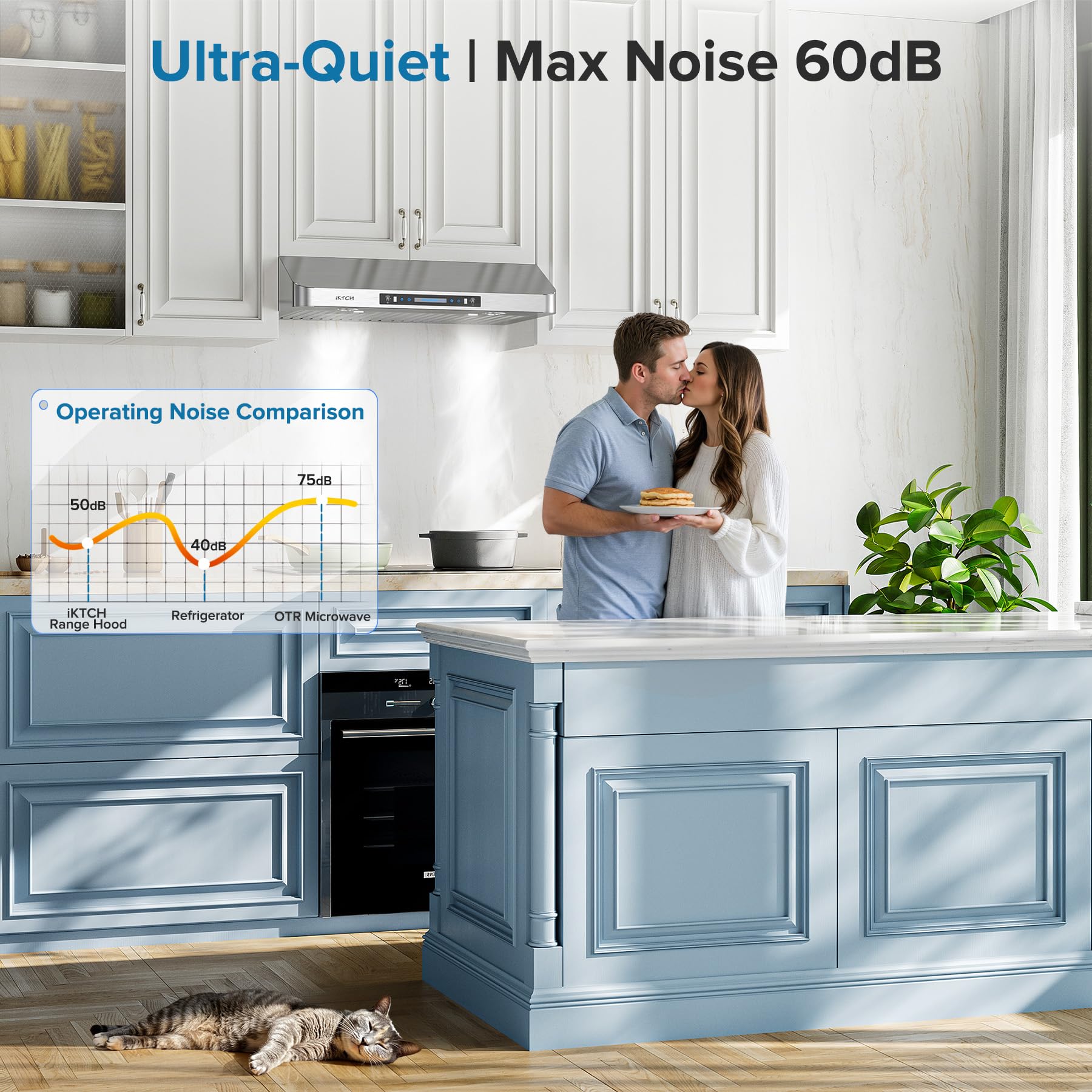 【Ultra-Quiet Operation】Customize your kitchen stove vent with the 4-speed setting to play with the suction and noise level. The noise level is at 35 decibels on the lowest setting and only 60 dB max noise level. Delivering a powerful yet quiet performance ideal for busy kitchens