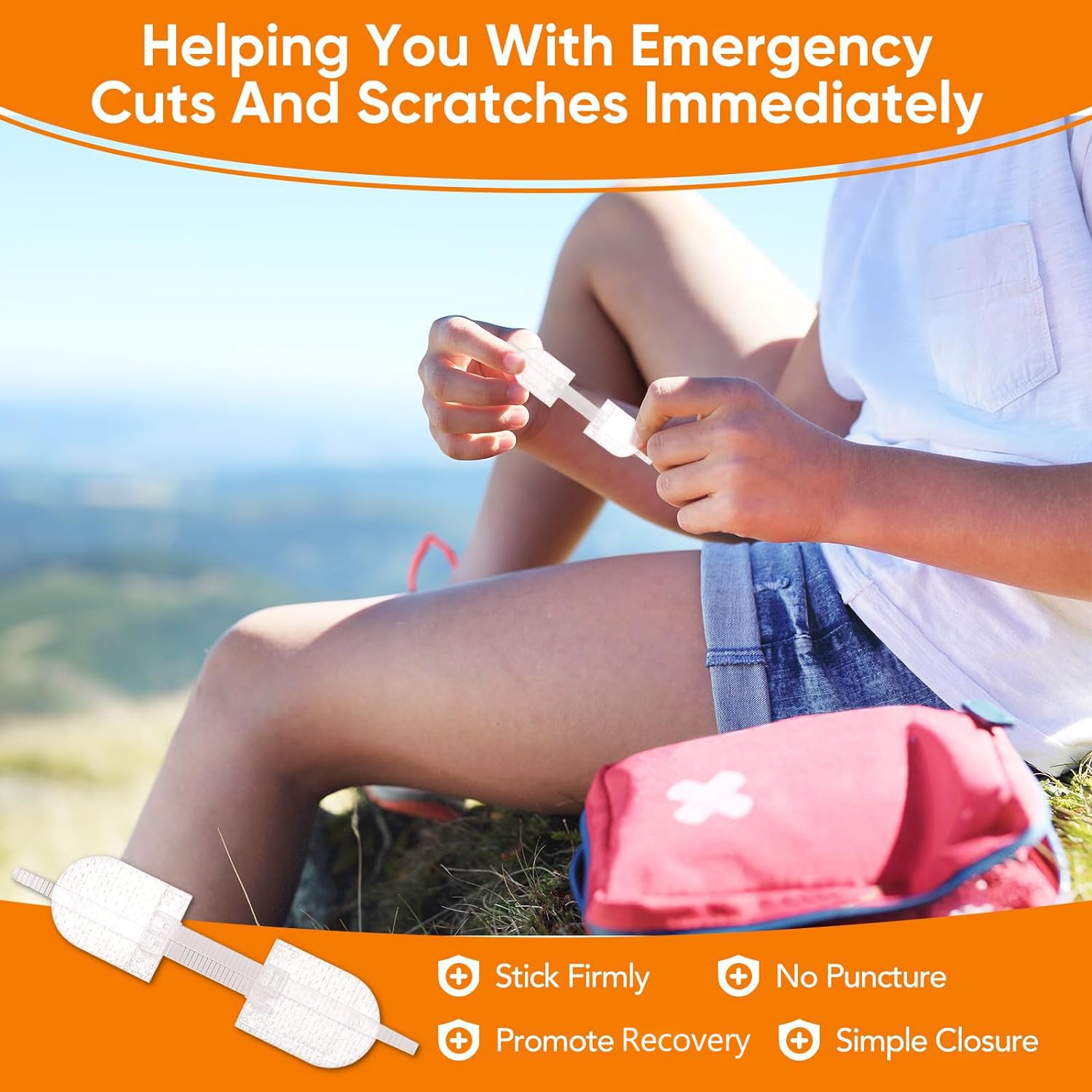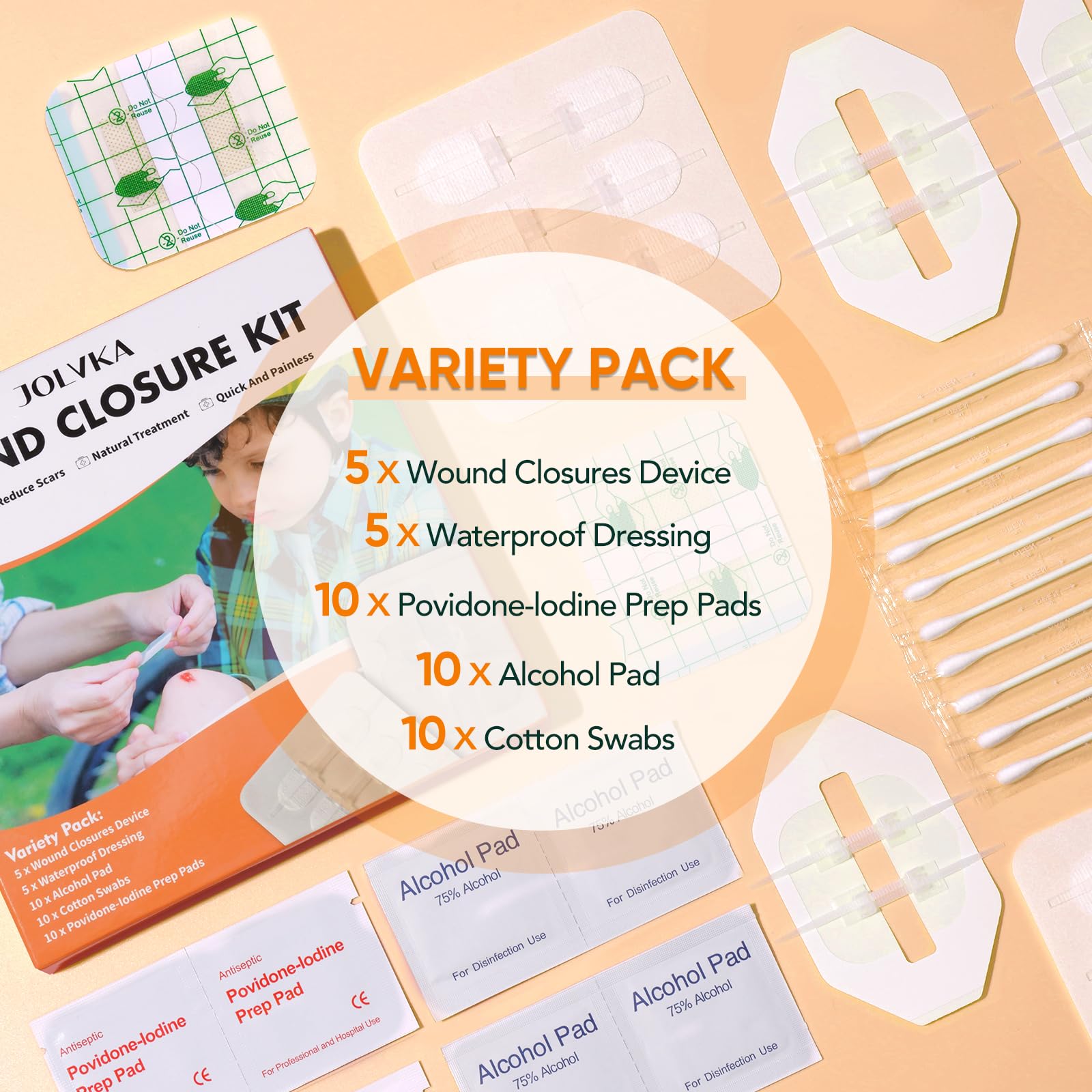 FIRST AID KIT: The package contains all necessary tools (5 emergency wound closures, 5 waterproof dressings, 10 iodophor cotton pads, 10 sterile pads, 10 cotton swabs). The instrument is made of hypoallergenic materials.