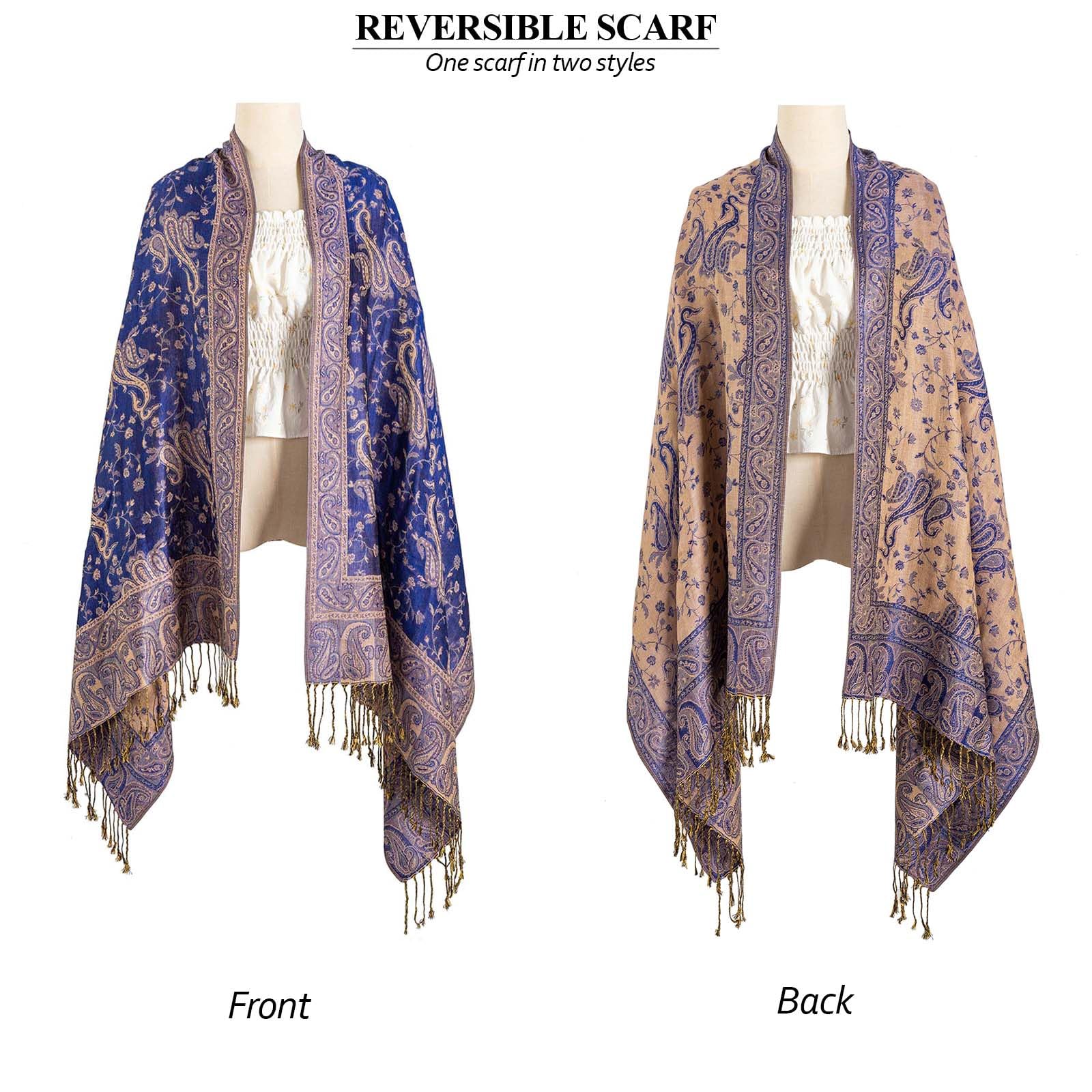 VERSATILE SCRAF FIT ANY OCCASION AND SEASON TO BRIGHTEN YOU OVERALL LOOK: Long & wide pretty pashmina feel scarf is very practical, you can use it as a warm winter scarf, formal shawl wraps for evening or wedding dresses, hijab, skirt, even as curtain, table cover, etc. brighten your outfit or room. It keep you cool under the sun and keep you warm at summer night, air conditioned rooms and cold winter. Reversible scraf is one scarf for two style, versatile, lightweigt, portable for travel.