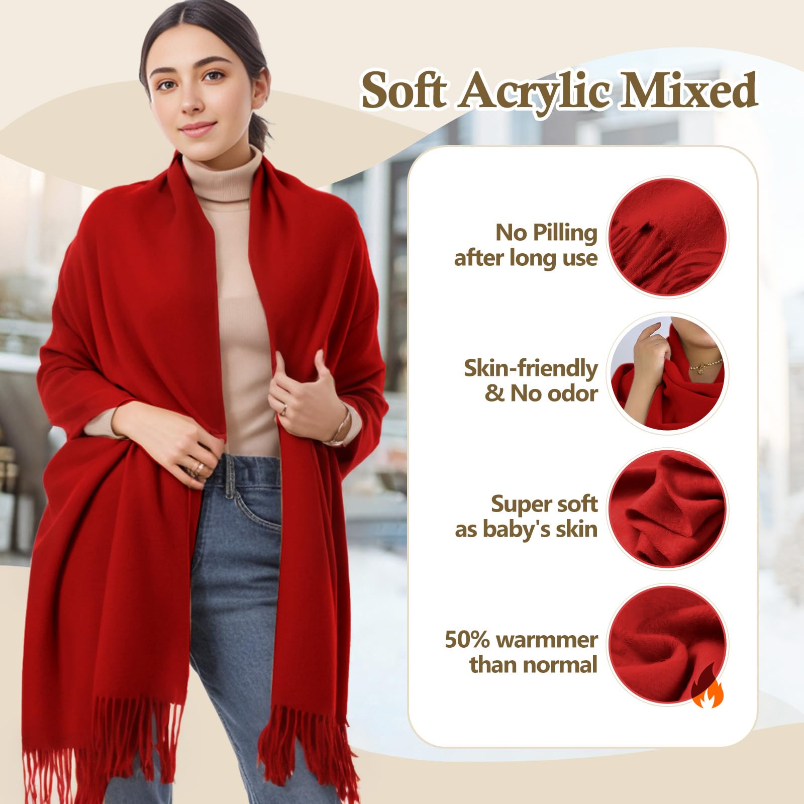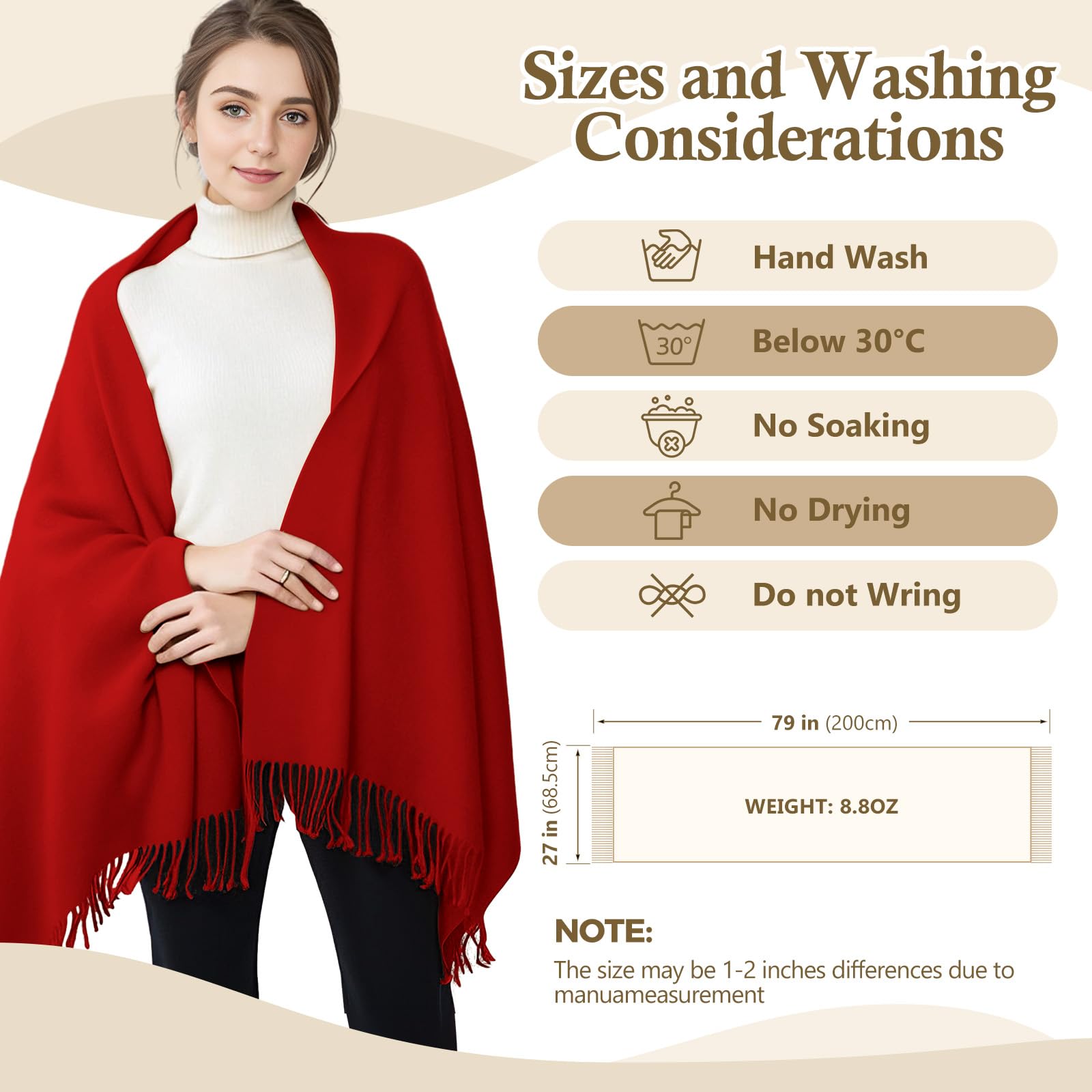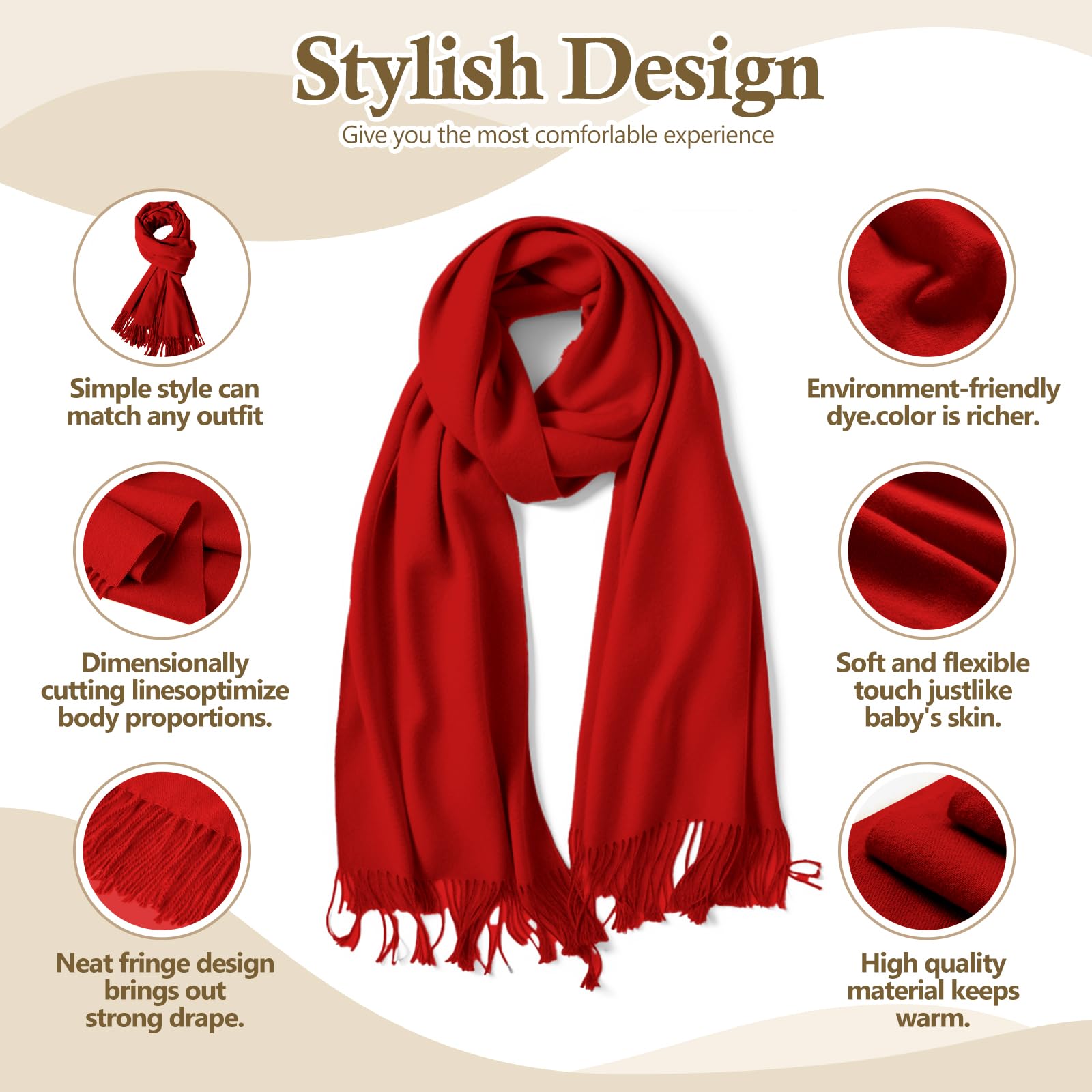 Standard Size & Medium Thickness: Approx 70×200cm (27×78in), ±3cm error for manual measurement. Medium weight, temperature-resistant 14°F-41°F, all-season use. Twice softer than cotton—warm, breathable, multi-use as scarf, head wrap, shawl, blanket, etc.