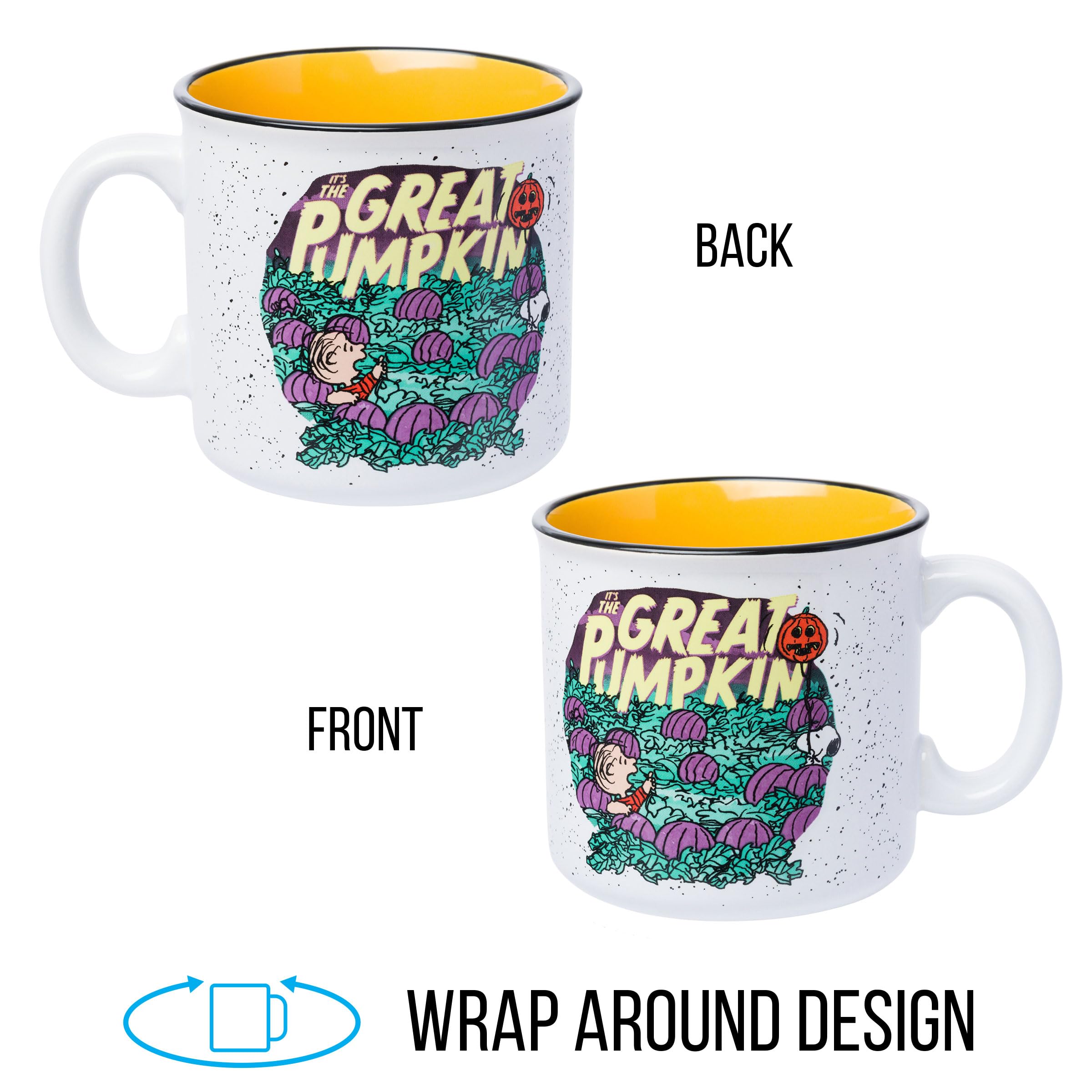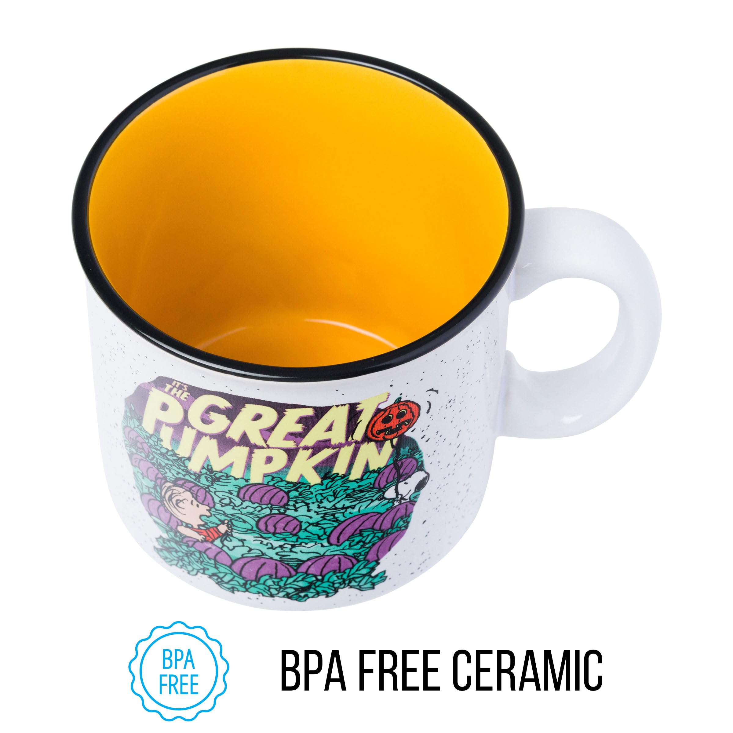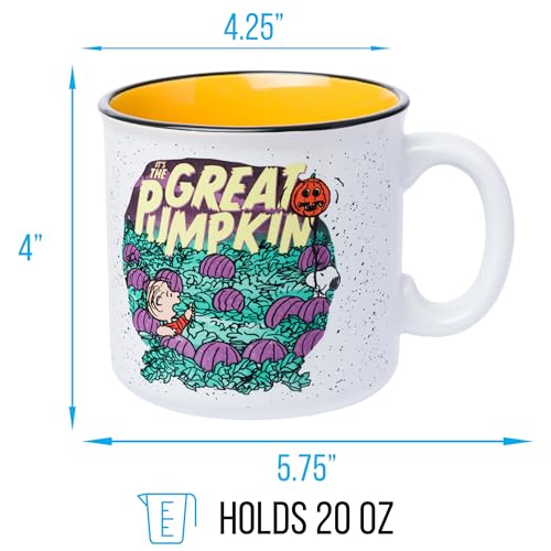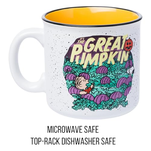 SPOOKY-CUTE DESIGN: Features Linus and Snoopy waiting for The Great Pumpkin under a starry sky on a 20oz ceramic camper-style mug with a speckled orange finish and wide handle.