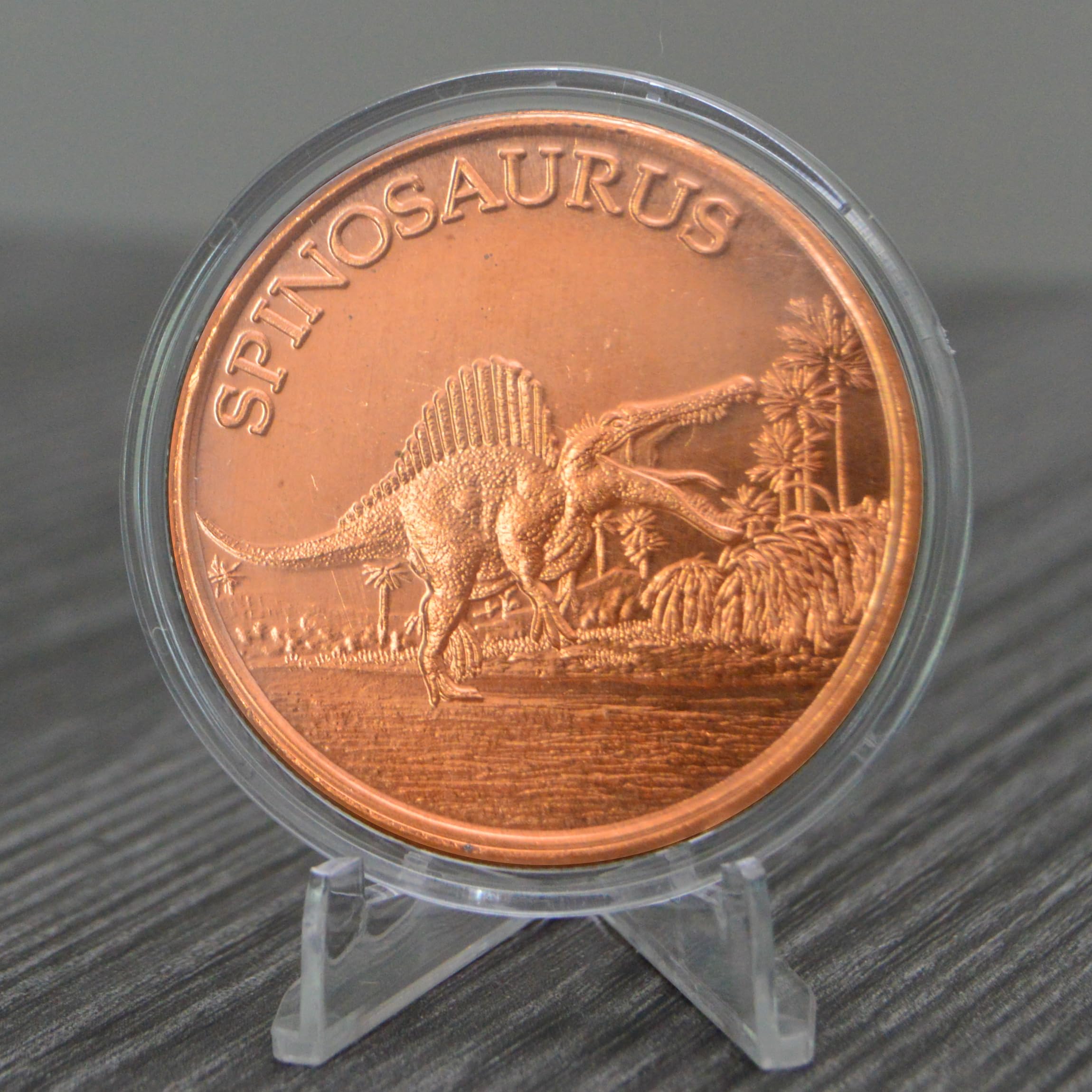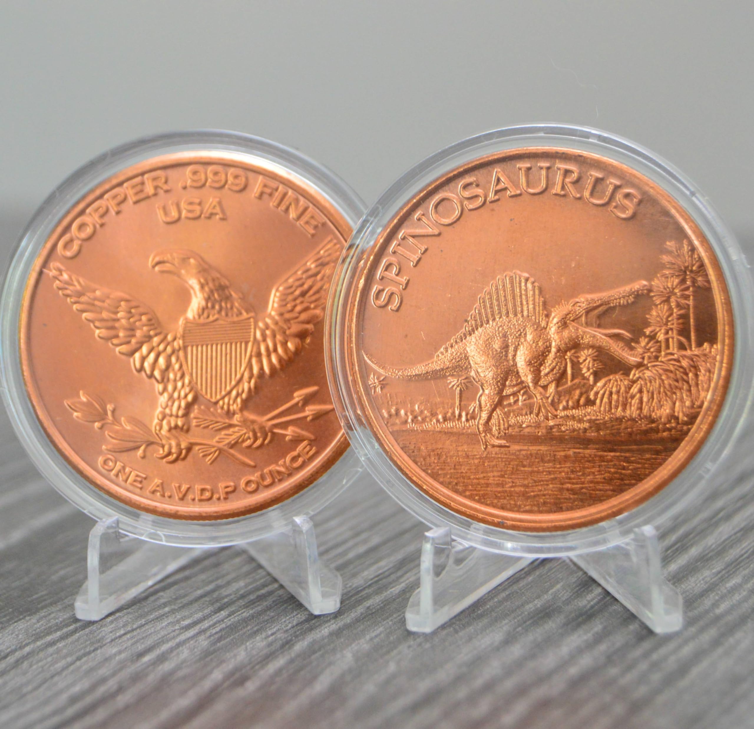 "Step back in time with the Spinosaurus Dinosaur 1 oz Pure .999 Copper Round Bullion Coin. Expertly crafted from 99.9% pure copper, this coin makes a fascinating addition to any copper collector's or investor's portfolio. The obverse of the coin features the intriguing Spinosaurus, one of the most fearsome dinosaurs that walked the Earth millions of years ago. The reverse displays a majestic USA eagle emblem, adding to the coin's appeal and value. Weighing 1 oz and measuring 39mm in diameter, this coin offers a substantial piece of pure copper bullion. Each coin comes encapsulated in a protective capsule, ensuring its condition and luster for years to come and making it an excellent investment. Included with your purchase is a Certificate of Authenticity (COA) by Heavenly Metals. This COA confirms the coin's 99.9% copper purity and origin, providing you with confidence in the authenticity and value of your investment. The Spinosaurus Dinosaur 1 oz Pure .999 Copper Round Bullion Coin makes an engaging gift for coin collectors, dinosaur enthusiasts, or history buffs. Unearth a piece of prehistoric life today."