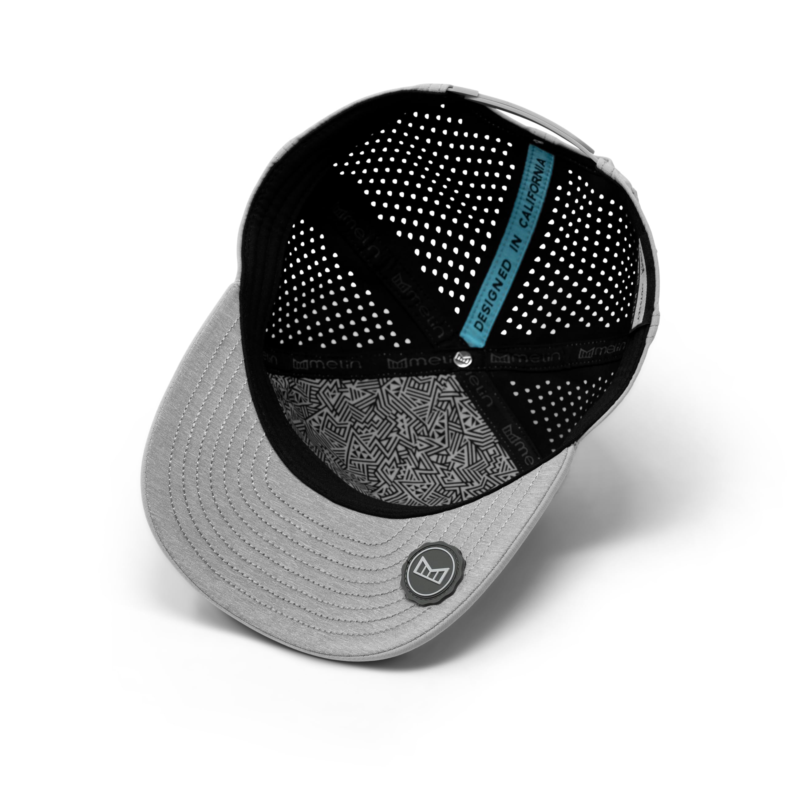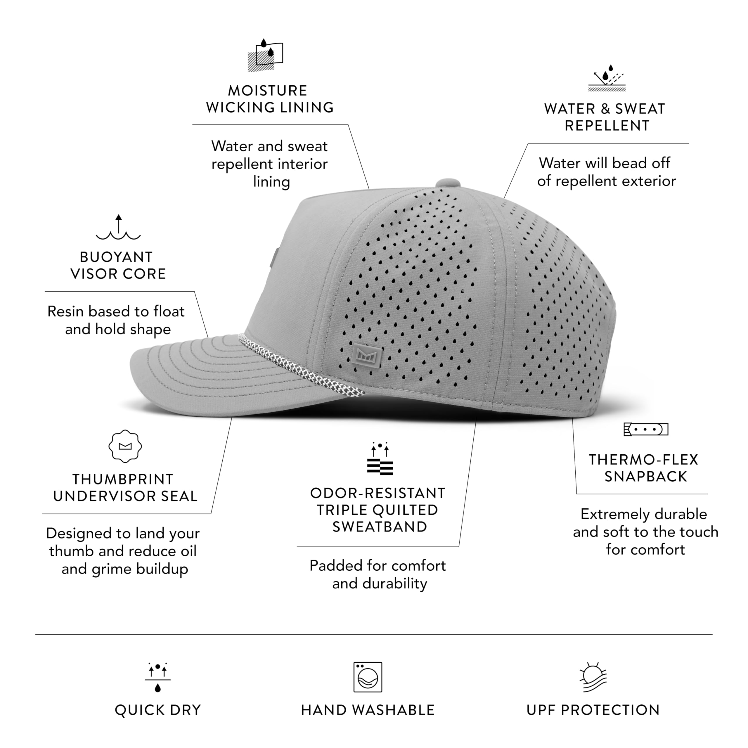 PERFORMANCE SNAPBACK HAT: Exterior crown has hydrophobic crown panels, laser-perforated side & rear panels for breathability, and adjustable snapback closure. Visor has rope feature, hydrophobic exterior, water capable core, and signature under visor seal