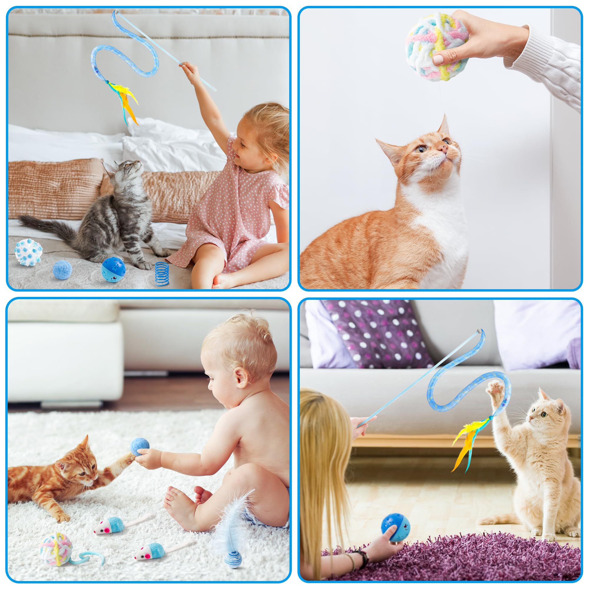 [You Can Get] Our product is a blue-themed pet toy designed and made for indoor cats. There are 10Pcs cat toys in total, including feather wand,blue fluffy ball, blue mice, bell balls, cat springs, crinkle balls etc, which can meet the different needs of cats and unleash their natural instincts.