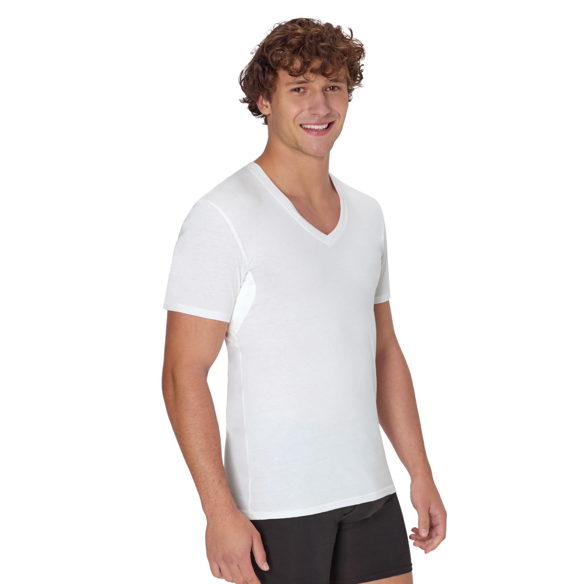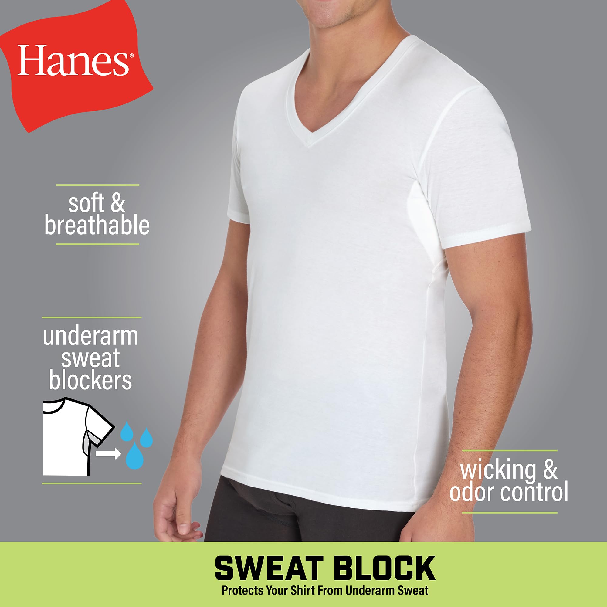 Description Keep your cool and your confidence intact - the Hanes Sweat Block Tee is designed to stop underarm sweat in its tracks. Innovative sweat block zones located beneath the arms capture sweat, helping you remain dry while shielding your outerwear from those embarrassing underarm stains no one likes. Crafted from quality fabric, this men’s t-shirt is both soft and breathable - making it ideal for all-day wear. Built-in moisture-wicking technology and odor control help you stay fresh and comfortable, and you’ll appreciate the Tagless® interior. This V-neck undershirt stays neatly tucked for a clean appearance under your favorite dress shirt or polo. Whether you're powering through a stressful workday or simply hanging out, it will keep you looking sharp and feeling your best, all at a price point that won’t break your budget.