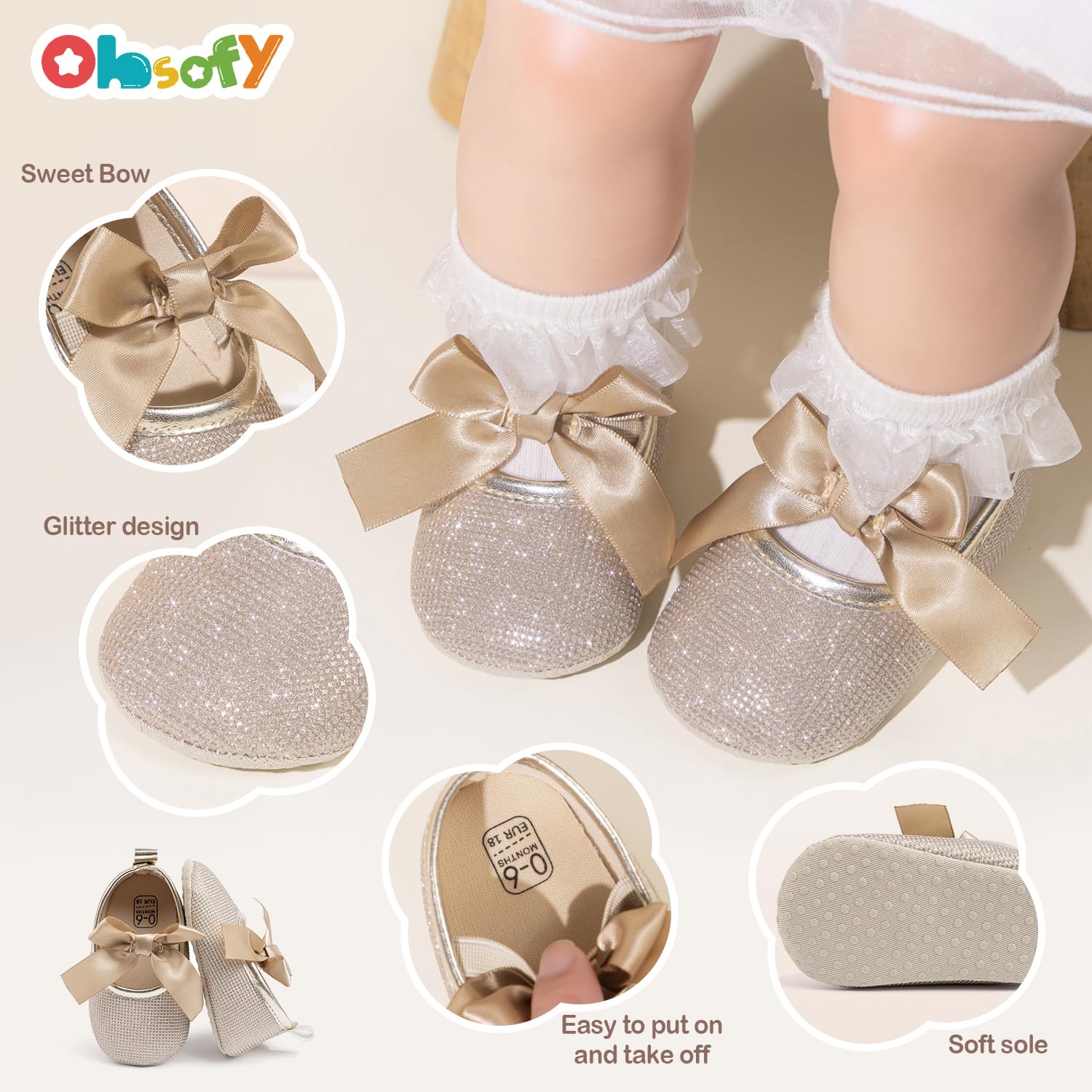 Fashion Design: Sparkling princess dress shoes with ribbon bowknot design makes baby unique, and draw much Attention and Compliment. The baby crib shoes suit for different Occasions like Crawling, Walking, Playing,photography and party. It would be a Great Baby Newborn Baptism, Shower, First Birthday Gift