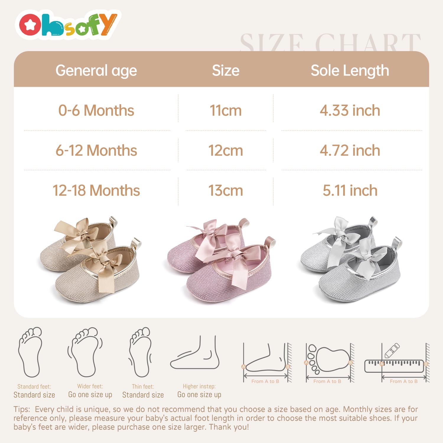 Size Tips: Every baby is the unique; so we don't suggest you just going by the age; please measure baby's actual foot length and refer to our size chart to choose the best fit shoe; if your little baby have a wider feet; please buy it size larger