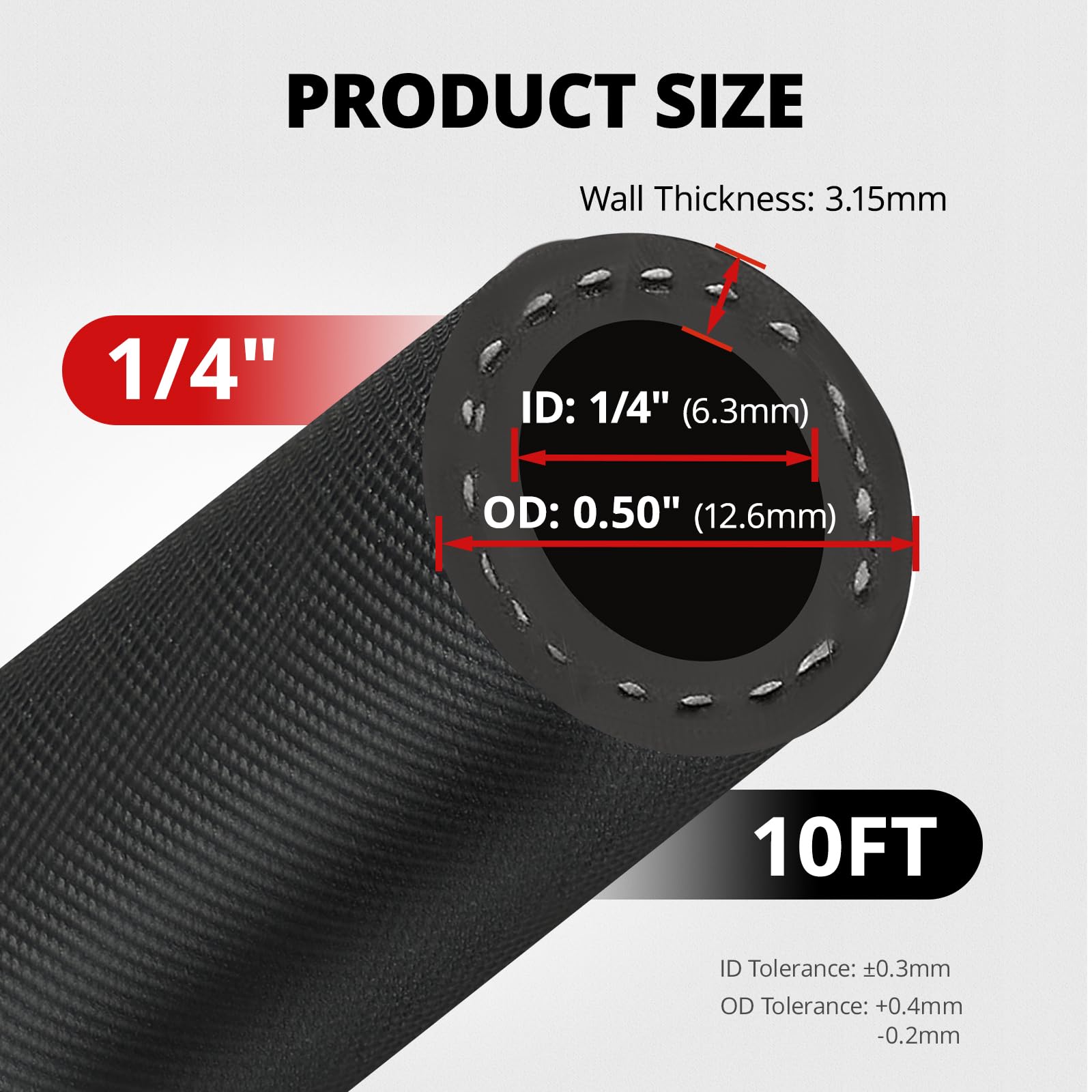 Specifications: ID: 1/4 inch (6.3 mm). OD: 0.5inch (12.6mm). Length: 10 ft.