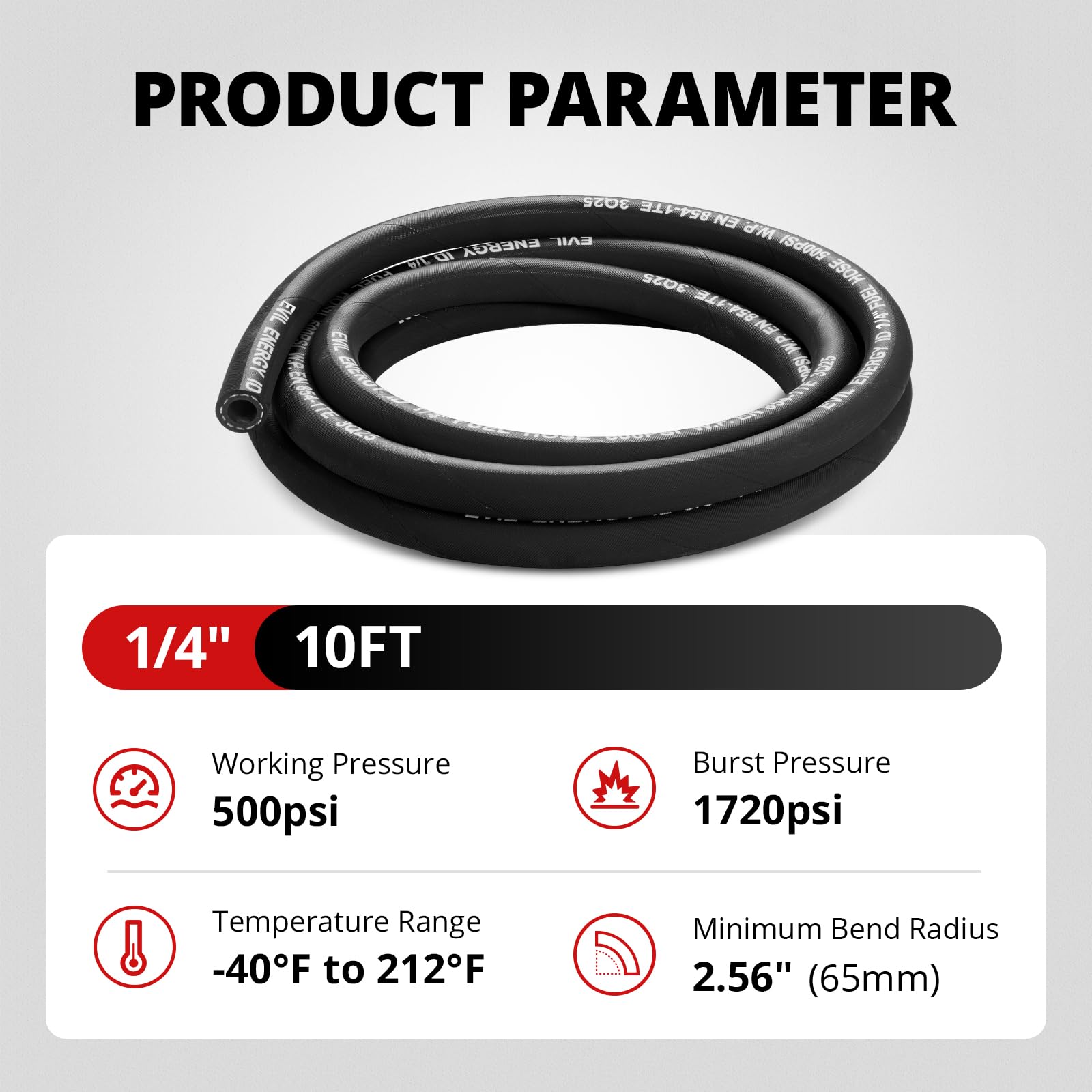 Parameter: Maximum working pressure: 500 PSI. Burst pressure: 1720 PSI. The temperature range: -40°F to 212°F. The minimum bend radius: 65 mm.
