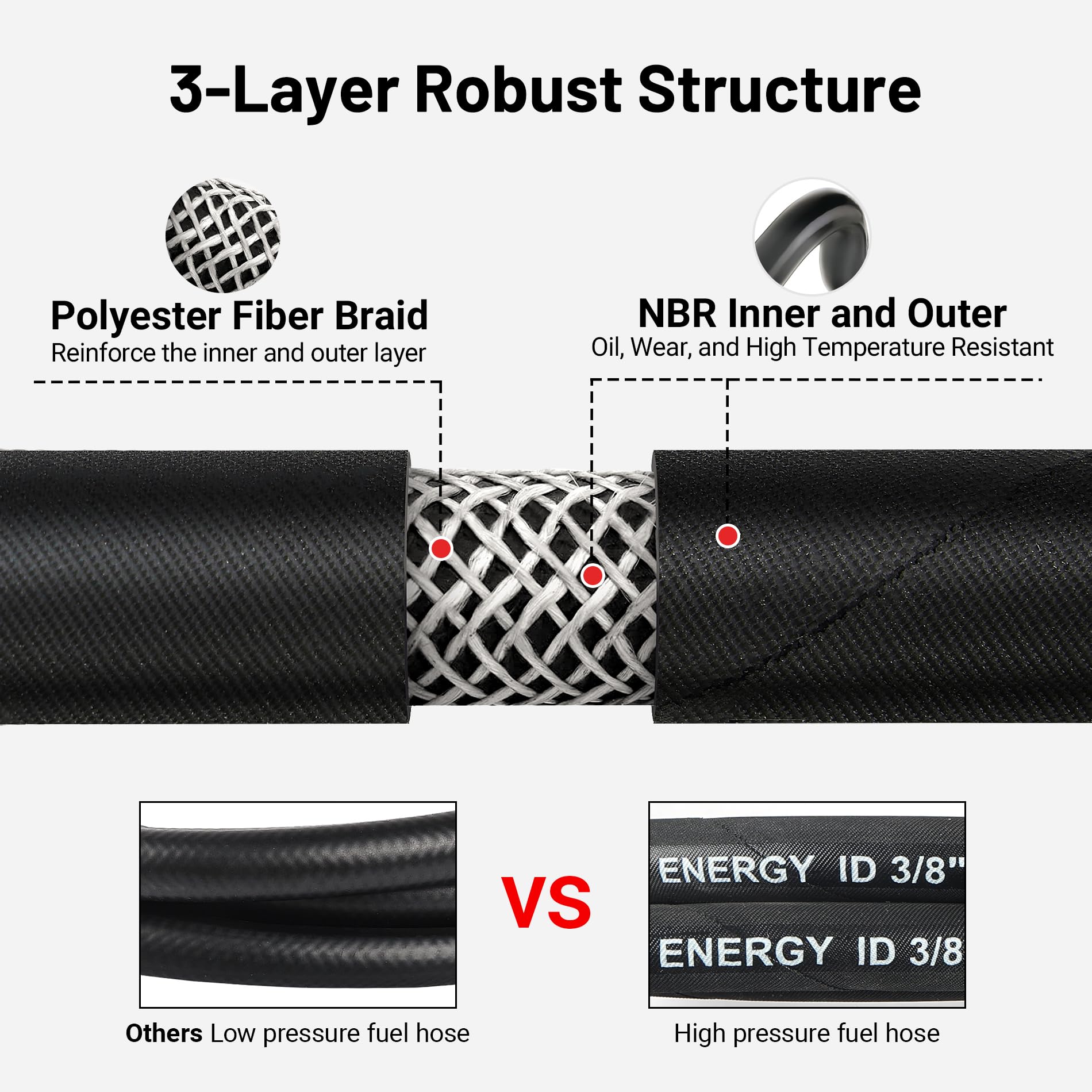 Material: The E85 fuel hose is made of double-layer NBR and is reinforced with a polyester fiber braid, providing excellent resistance to oil and wear.