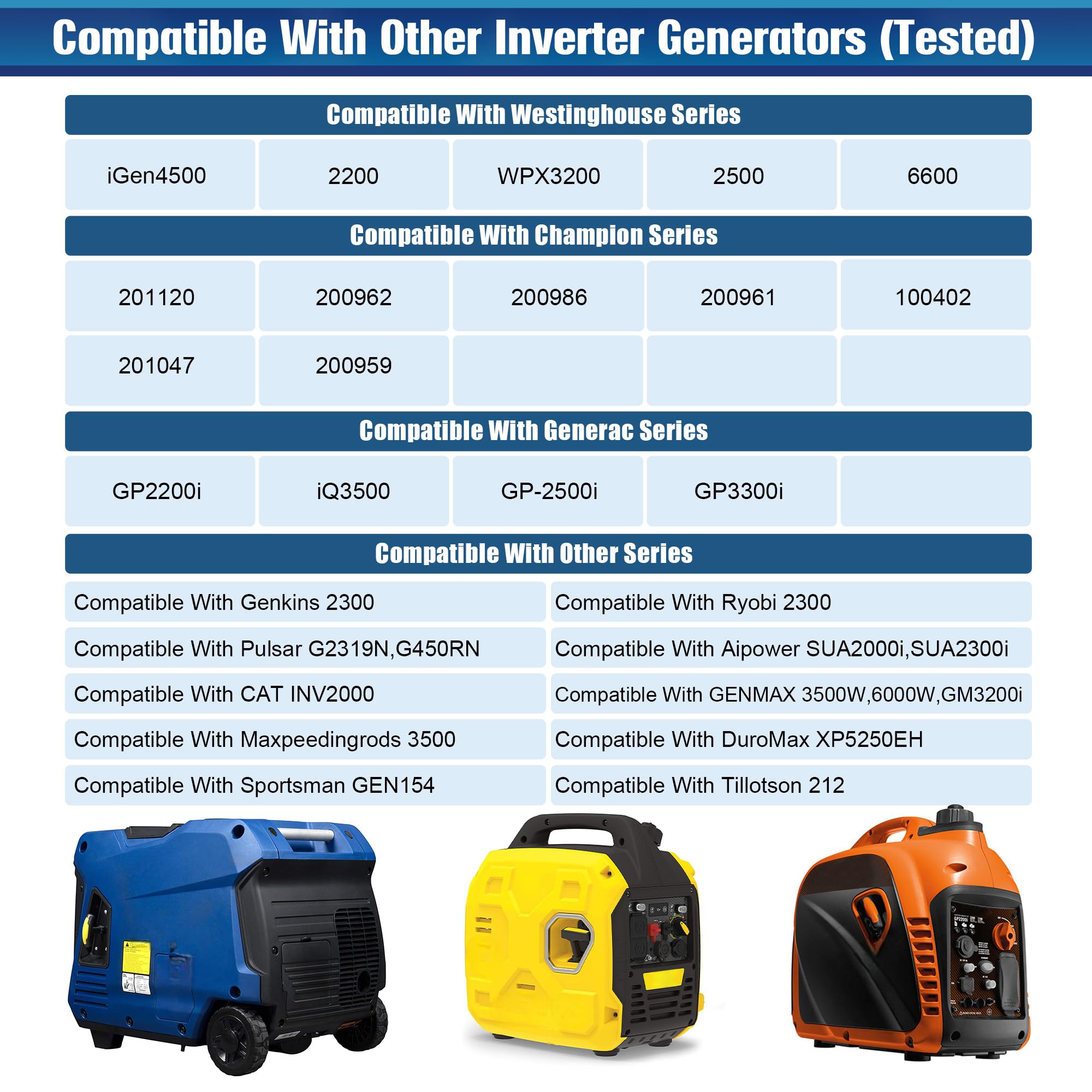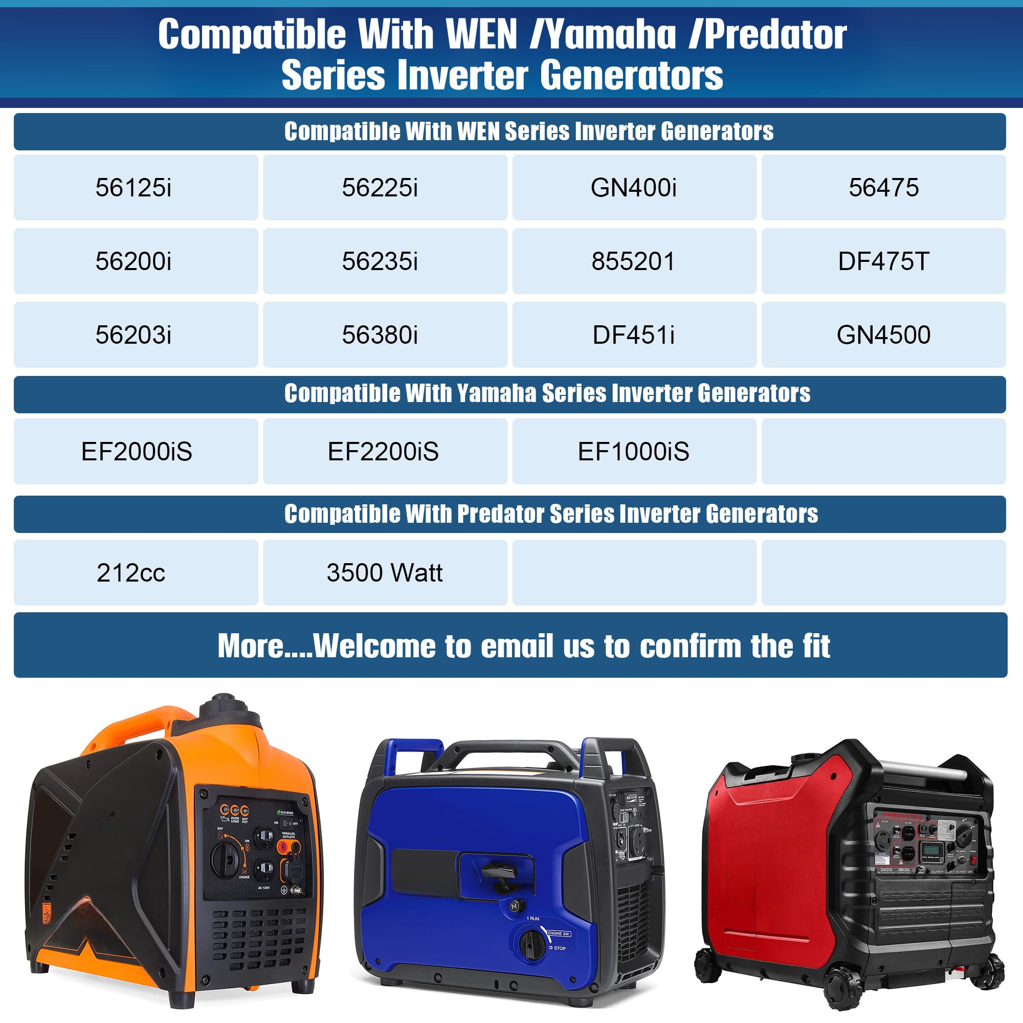 Compatibility: compatible with WEN Series 56125i/ 56200i/ 56202i 56203i/ 56225i/ 56235i/ 56310i RV/ 56380i/ GN400i RV Ready/ DF400i/ GNA273/ 855201/ DF451i/ 55201/ 56475, etc., and compatible with Yam aha EF2000iS/ Yam aha EF1000iS/ Predator 2000 and more
