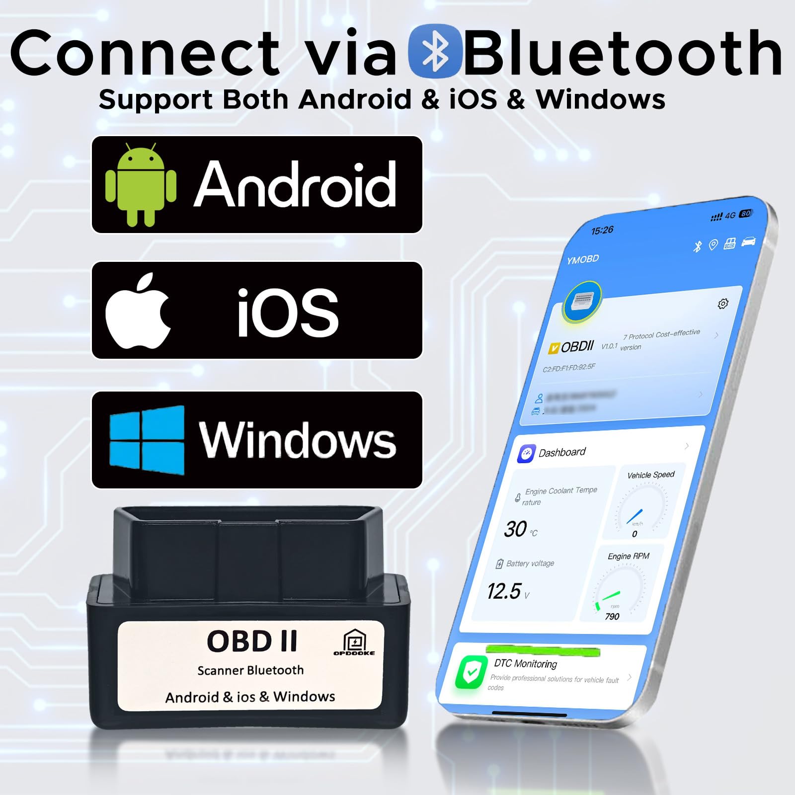 【Bluetooth Enabled and User-Friendly App】-This Opdooke OBD2 Scanner Bluetooth connects with Bluetooth via your cellphone/ notebook to a sensor that plugs into your car's OBDII port. just download our app on Google Play, iOS Store or Windows to get all of the capabilities of other's expensive code reader & scan tool without any annoying wires for free and Say goodbye to wires