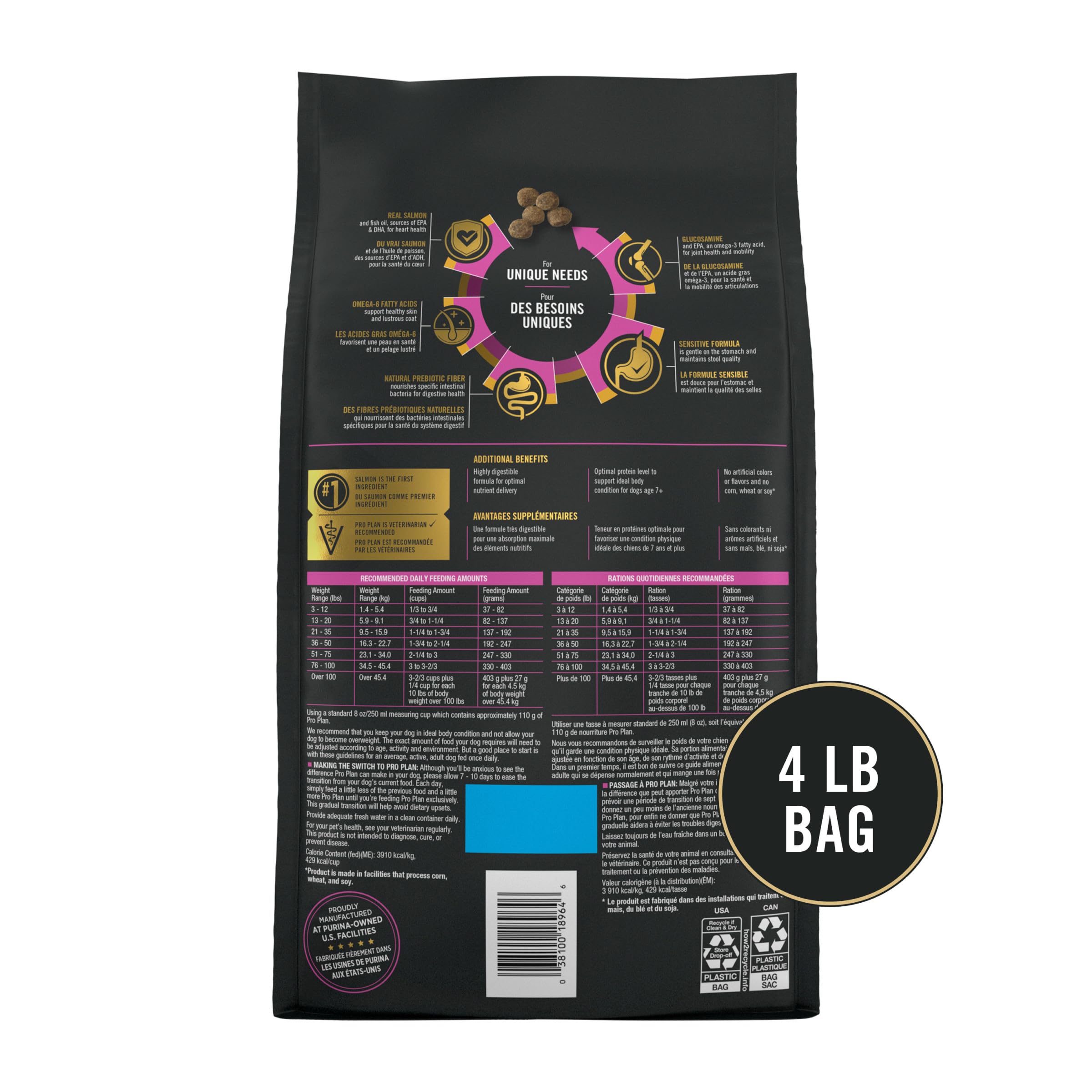 Support the unique needs of your senior dog with Purina Pro Plan Senior dry dog food for Sensitive Skin and Stomach Salmon and Rice Formula Adult 7+. This high protein dog food features targeted nutrition, including salmon as the #1 ingredient. Featured in this wholesome dog food for sensitive stomachs is an easily digestible combination of oat meal and rice. Plus, Glucosamine and EPA to promote joint support and mobility. This formula also includes natural prebiotic fiber to nourish specific intestinal bacteria for healthy digestion. We fortify this senior dry dog food with antioxidants for immune support to allow your dog to flourish. To help nourish your dog’s sensitive skin, this salmon dry dog food also includes omega-6 fatty acid-rich sunflower oil for skin health. This Purina Pro Plan adult dog food formula is made with no eggs, corn, wheat, soy, poultry by-product meal, or additional colors or flavors. Try this Purina Pro Plan Adult Dog Food 4 lb. bag risk-free.