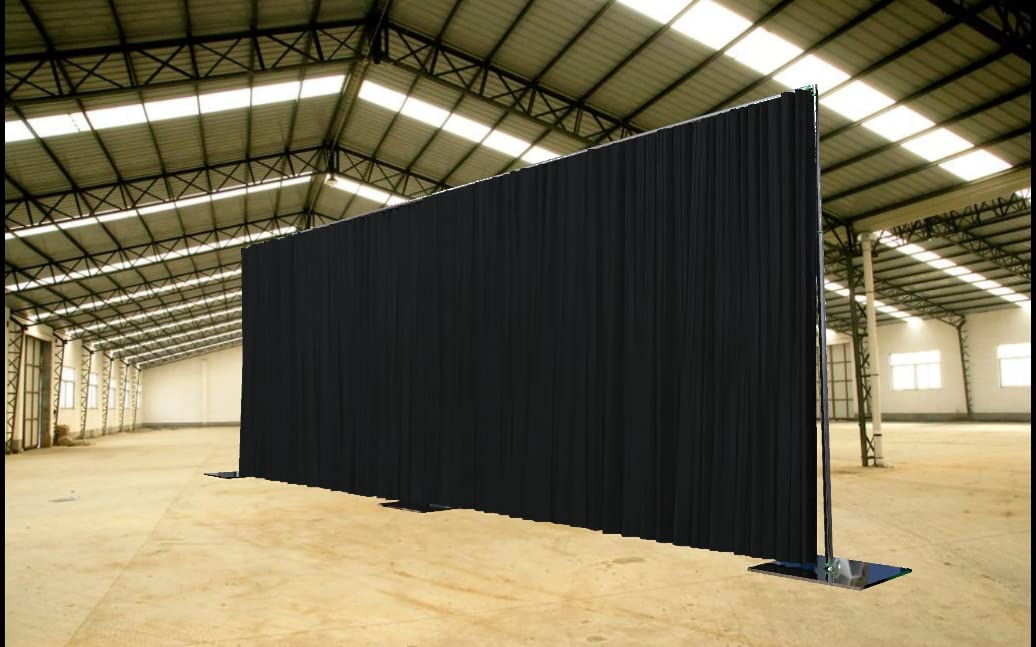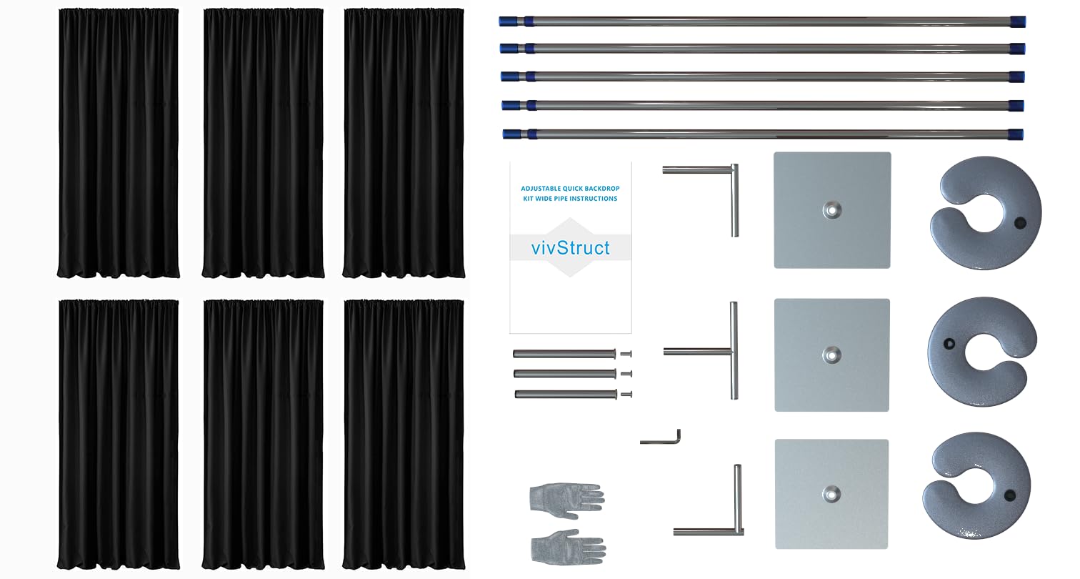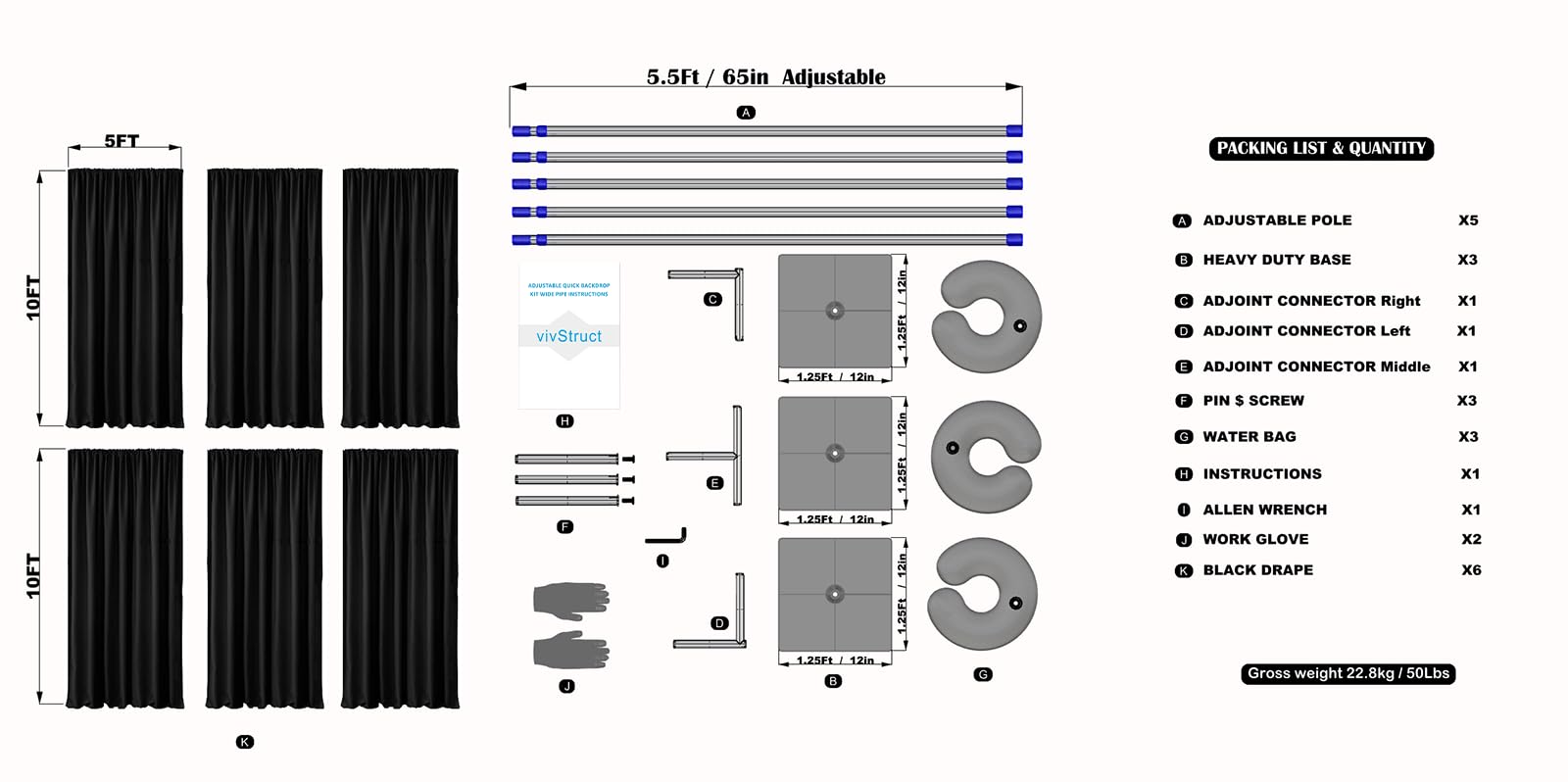 【Package includes】Wonderful item includes 2 crossbars(diameter 1.26"/3.2cm) are made of stainless steel with plastic nylon sleeve, 3 vertical poles(diameter 1.26"/3.2cm), 3 zinc plated steel base plates(1.25'x1.25', 7lbs), 6 pics black drapes(5'x10'H with rod pocket), 3 waterbags, 3 sleeves&screws, 3 corner connectors, 1 instructions ,1 allen key&gloves ,Pack size 65"x16"x6.8", Gross weight 50lbs. which easy to transport and store .