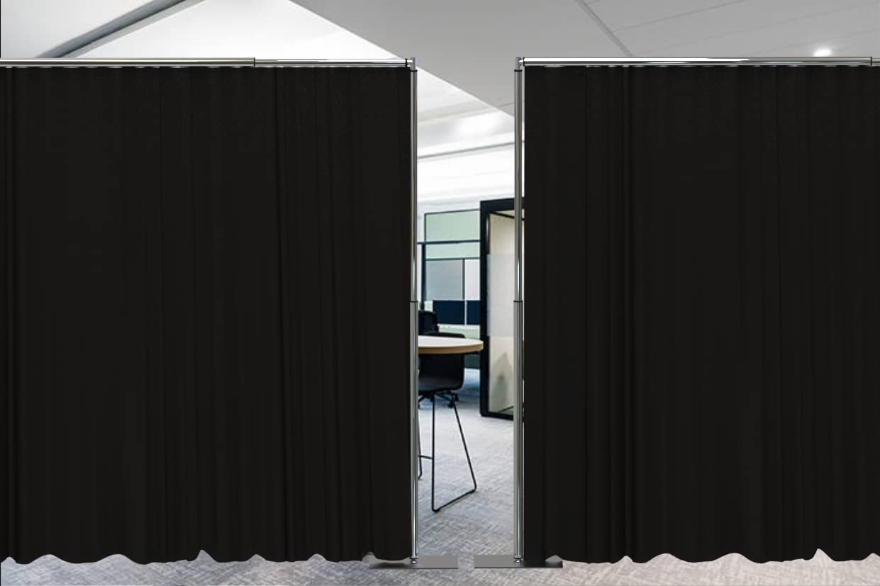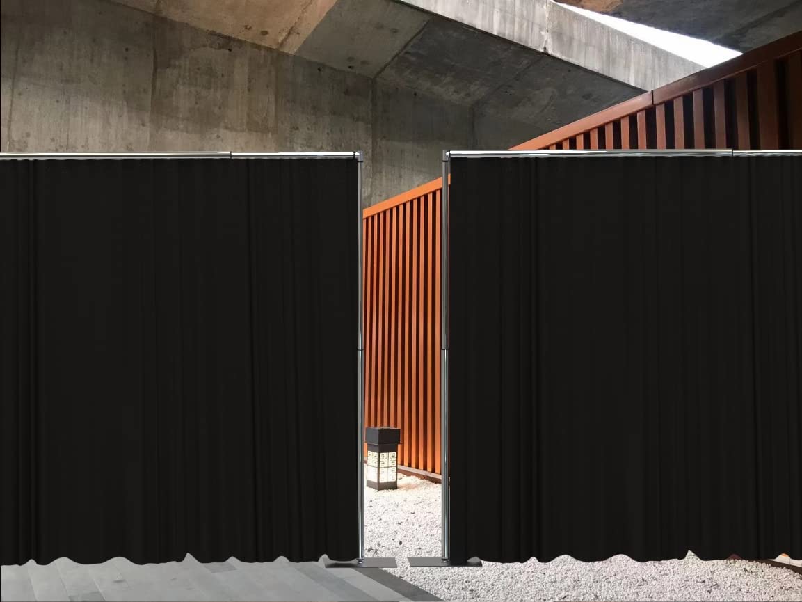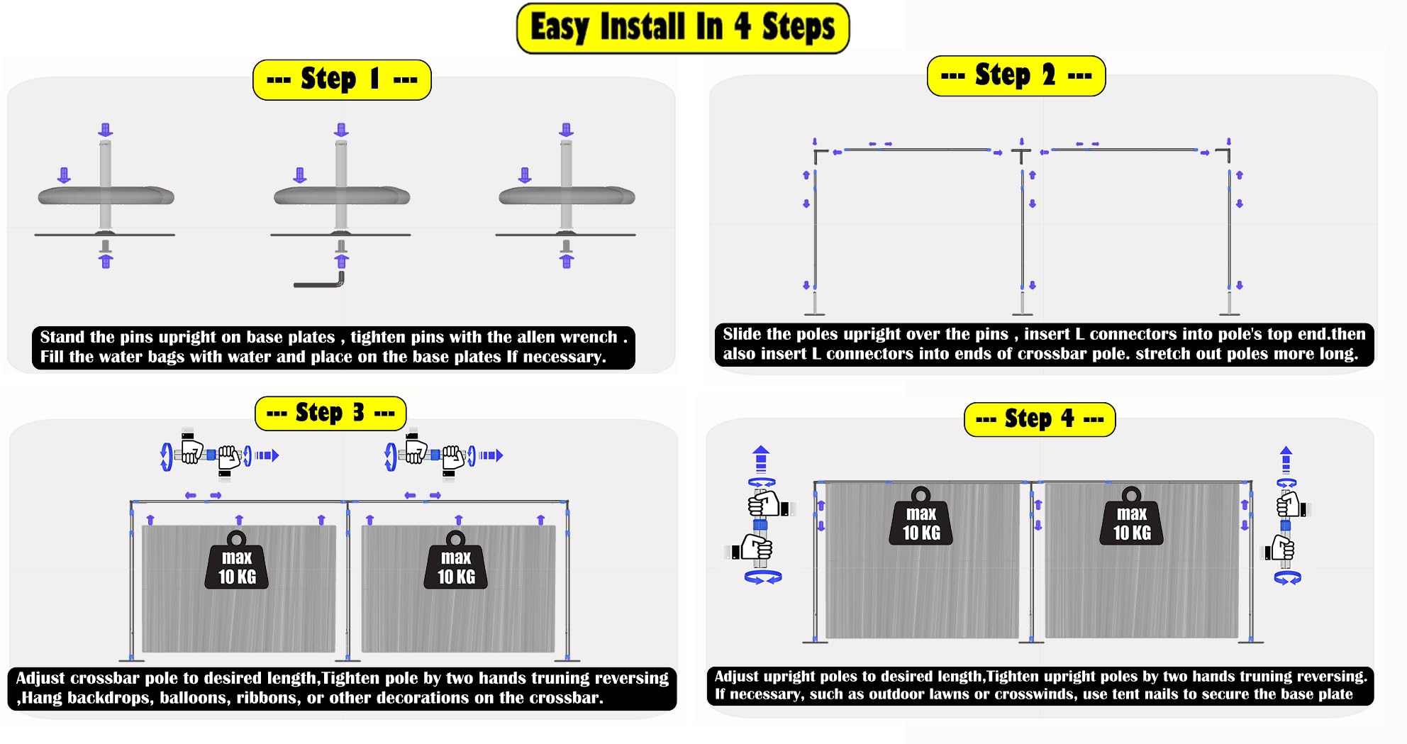 【Package includes】Wonderful item includes 2 crossbars(diameter 1.26"/3.2cm) are made of stainless steel with plastic nylon sleeve, 3 vertical poles(diameter 1.26"/3.2cm), 3 zinc plated steel base plates(1.25'x1.25', 7lbs), 6 pics black drapes(5'x10'H with rod pocket), 3 waterbags, 3 sleeves&screws, 3 corner connectors, 1 instructions ,1 allen key&gloves ,Pack size 65"x16"x6.8", Gross weight 50lbs. which easy to transport and store .