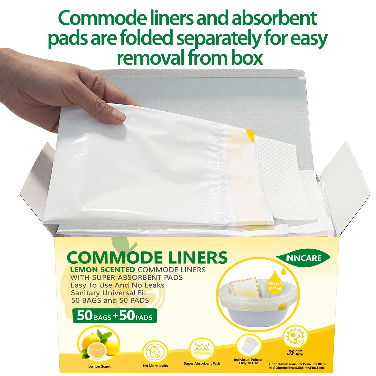 Value Pack - This set comes in a sturdy box and includes 50 commode liners and 50 super absorbent pads.These 50 commode liners disposable are much easier to get out of the box as they are individually folded instead of a roll.