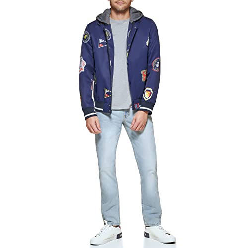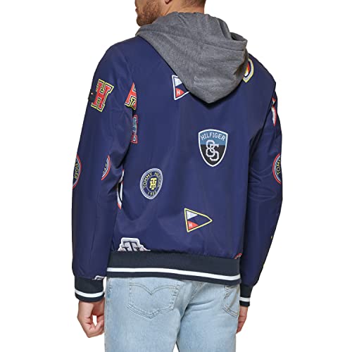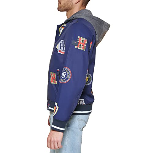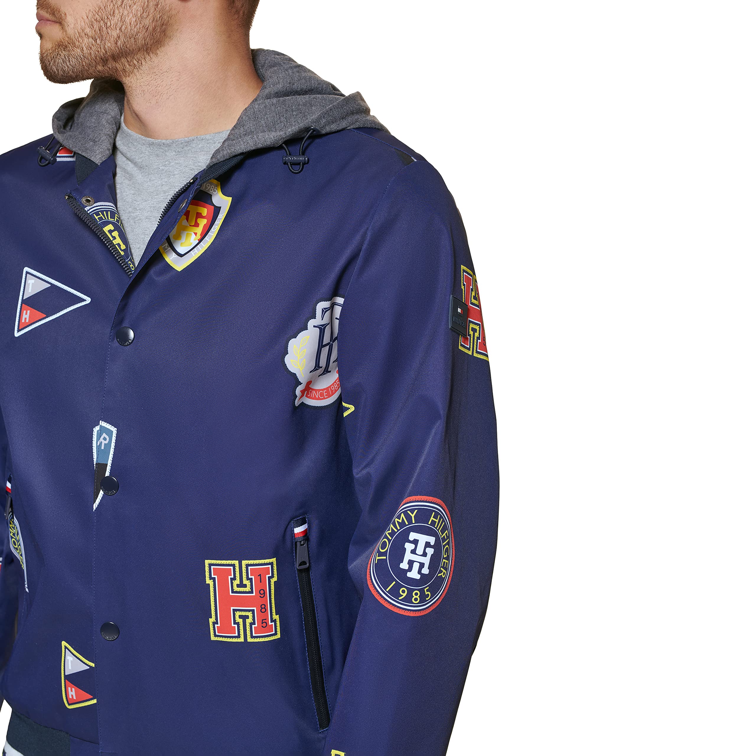 Description Add a touch of iconic style to your look with Tommy Hilfiger's classic softshell hoody bomber. Complete with a soft, jersey knit hood that's attached and adjustable, you'll stay warm and comfortable all day long.
