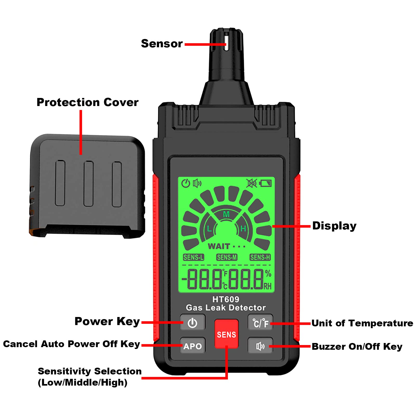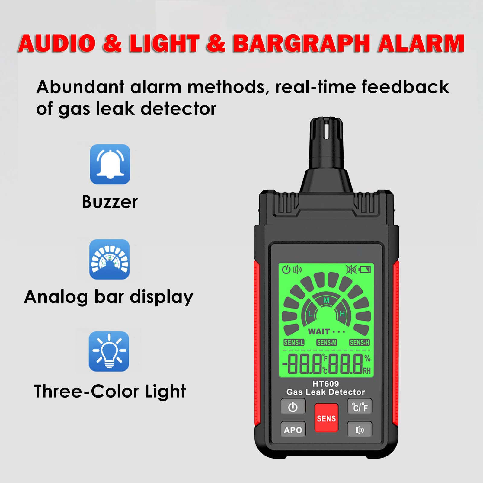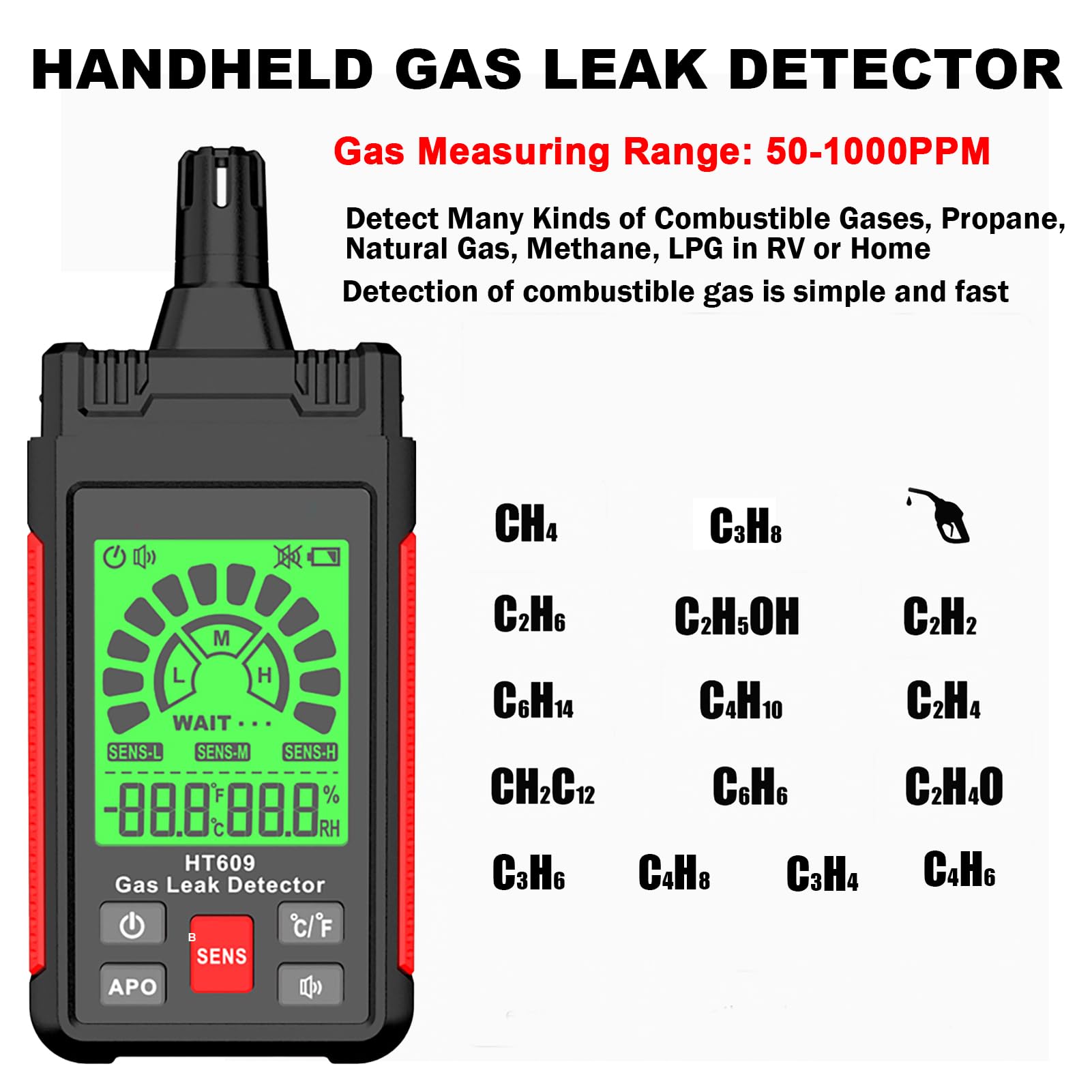 【3 in1 Portable Gas Leak Detector】This 3 in 1 gas leak detector is designed to combine the functions of gas leak detector, humidity meter and temperature meter, great for daily use. It can detect a large number of flammable gases, like methane, natural gas, propane, butane, ethane, coal gas, gas oil, gasoline, toluene, sewer gas, alcohol, ketones and more. Check appliances and piping in your house to pinpoint the precise source of a potential gas leak with the practical mini gas detector.