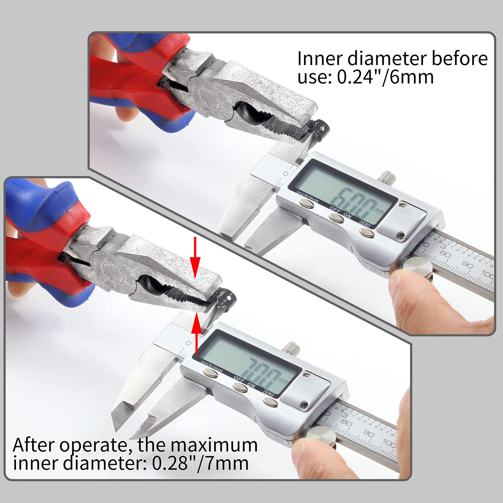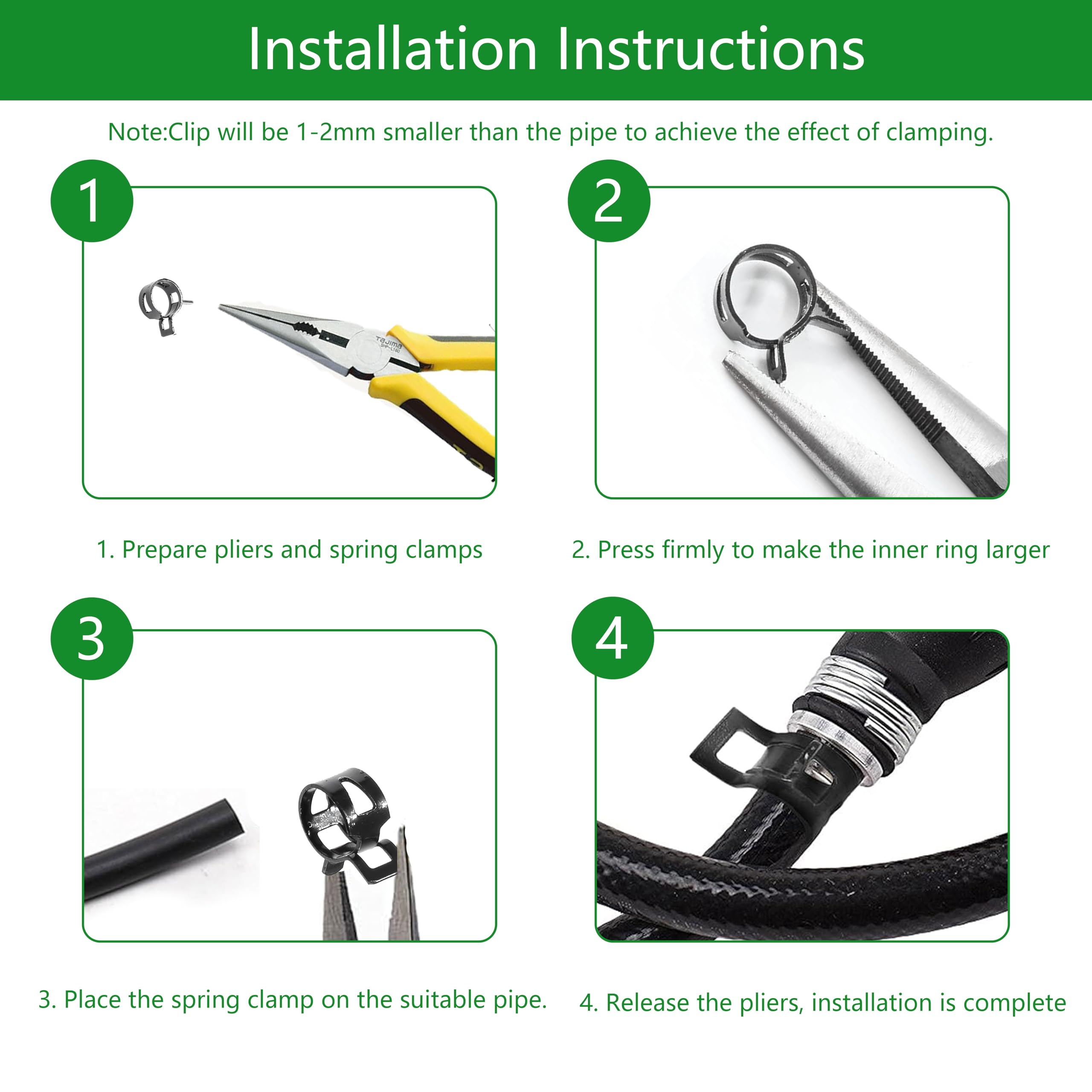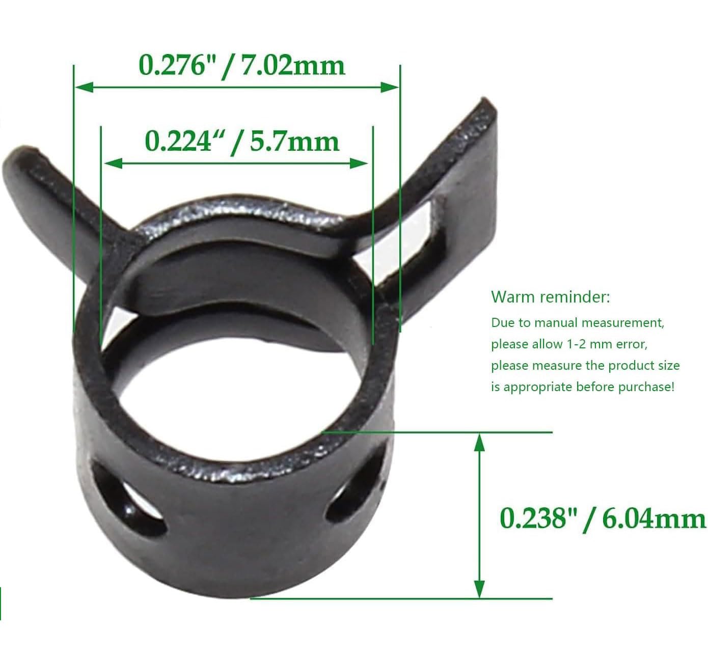 [ Product Size ] Inner Diameter: 1/4 inch / 6 mm; Band Width: 0.24 inch / 6 mm. WARM PROMPT: Before using pliers to open, the inner diameter of the pipe clamp is: 1/4"/6mm. After using pliers to open, the maximum diameter of the pipe clamps can reach 0.28"/7mm. Suitable for hoses with an outer diameter of 6.5-7.2mm.
