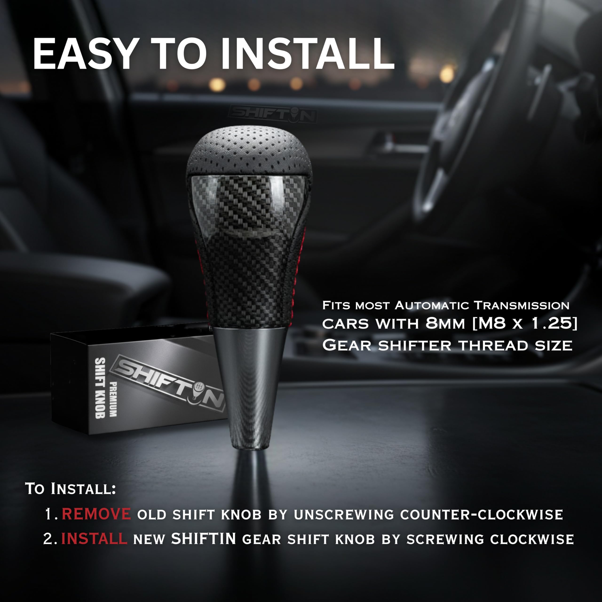 【EASY & QUICK INSTALLATION】- Install by twisting shift knob clockwise to screw-in, no tools or modification needed, fits most Automatic Transmission AT gearbox shifter lever rods with 8mm thread diameter size (M8 x 1.25)