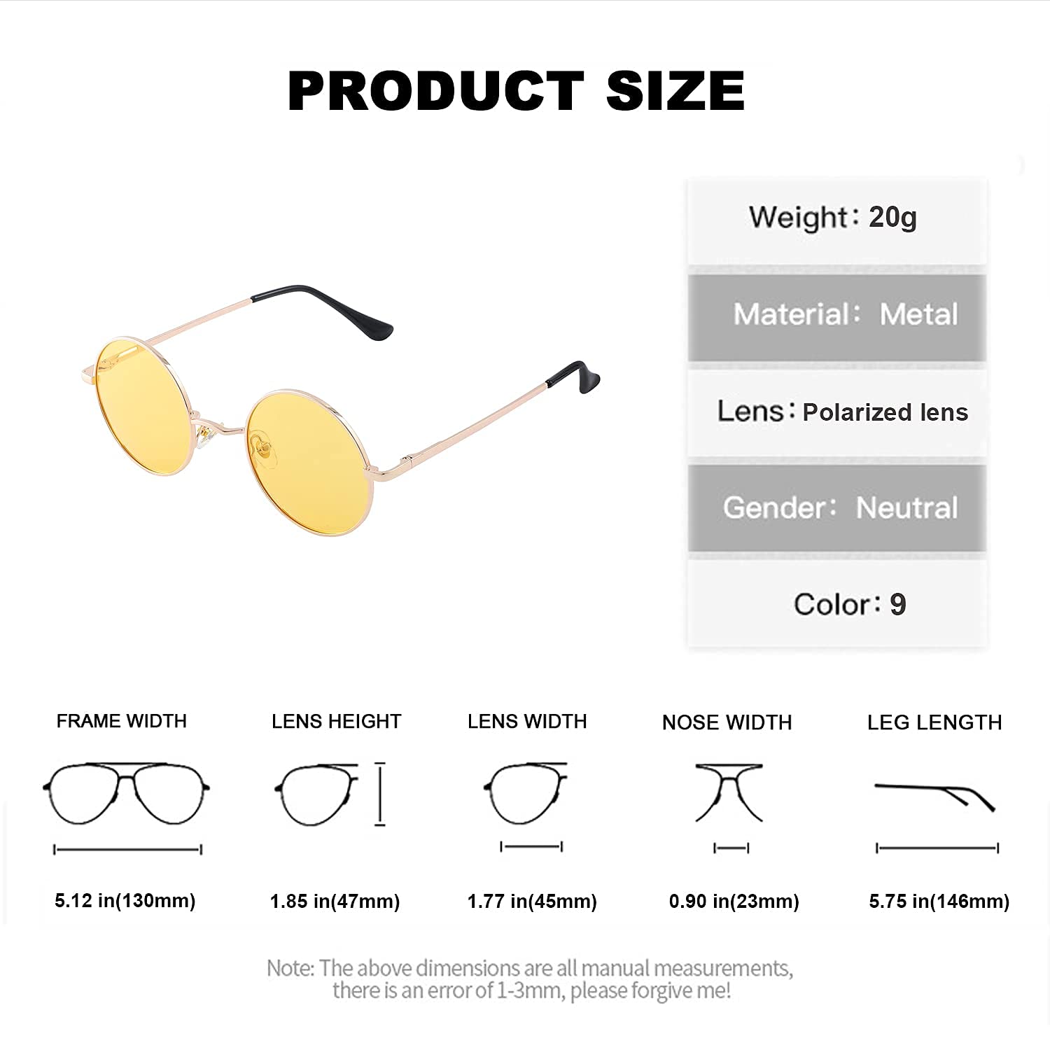 ☀PRODUCT SIZE: Lens Width: 45mm, Frame Height: 47mm, Nose Bridge: 23mm, Frame Width: 130mm, Temple Length: 146mm, Net Weight: 20g.