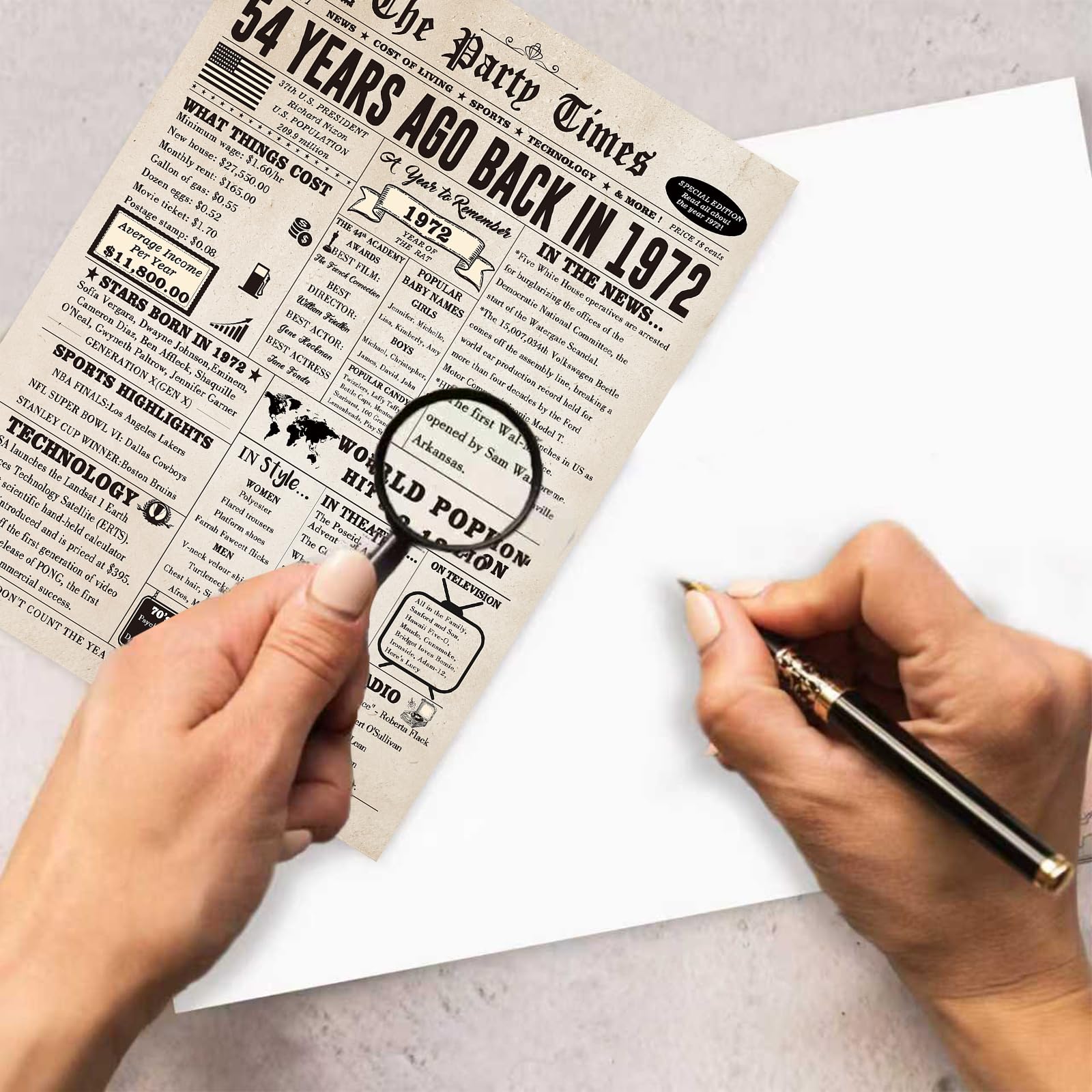 In a world where every year is a chapter in the story of life, It's more than just a card; it's a cherished keepsake and a testament to the joy of celebrating life's milestones! When it comes to celebrating a remarkable 54 years of life, 54th birthday card is the ultimate tribute to a journey well-lived. Whether you're celebrating your best friend, parents, siblings, or spouse, this card is the perfect gift that encapsulates a lifetime of memories. Perfect option to recognize a milestone birthday. Size is large enough to easily read all the interesting fun facts. Plenty of room inside to personalize, well wishes/messages. Great option when you want a little more than a typical birthday card. Funny card with lots of good facts about the year you choose eg: median house prices, incomes, gasoline, historical events, movies, ect many of the events depicted on the card. The size was great to pass around for all to read, and made it handy to insert my own text.