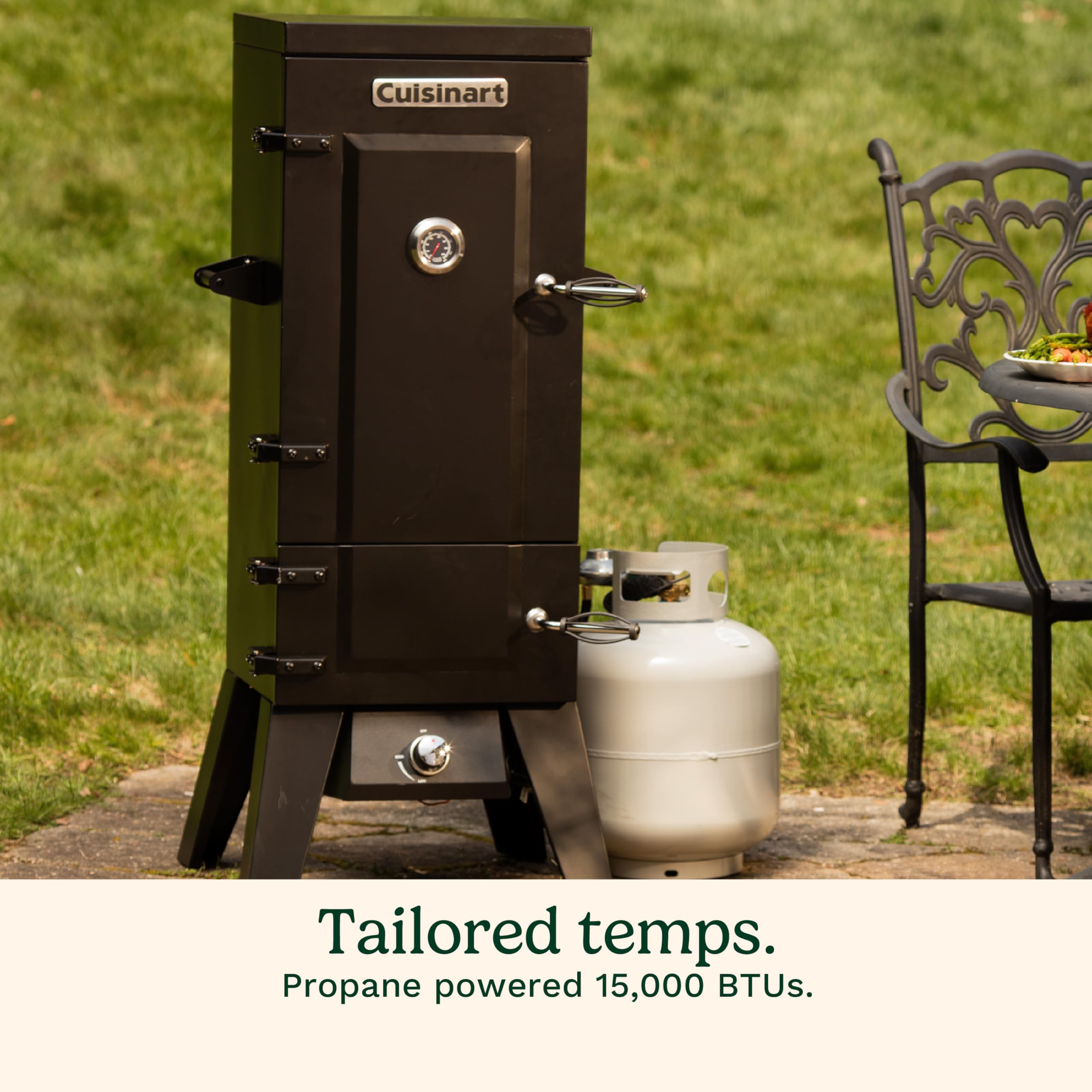 Elevate your outdoor cooking game with the Cuisinart Vertical 36” Propane Smoker, the ultimate tool for creating mouthwatering barbecue. With a spacious 785 square inches of cooking space across four chrome-steel racks, this smoker is perfect for smoking meats, fish, and vegetables. The powerful 15,000 BTU propane heating element makes it easy to achieve the ideal smoking temperature, while the rear vent allows precise control of heat and smoke levels. Whether you're smoking brisket for a weekend cookout or preparing jerky for a snack, this propane smoker delivers unmatched versatility and flavor. Easy to use and clean, it’s the perfect companion for barbecue lovers of any skill level.