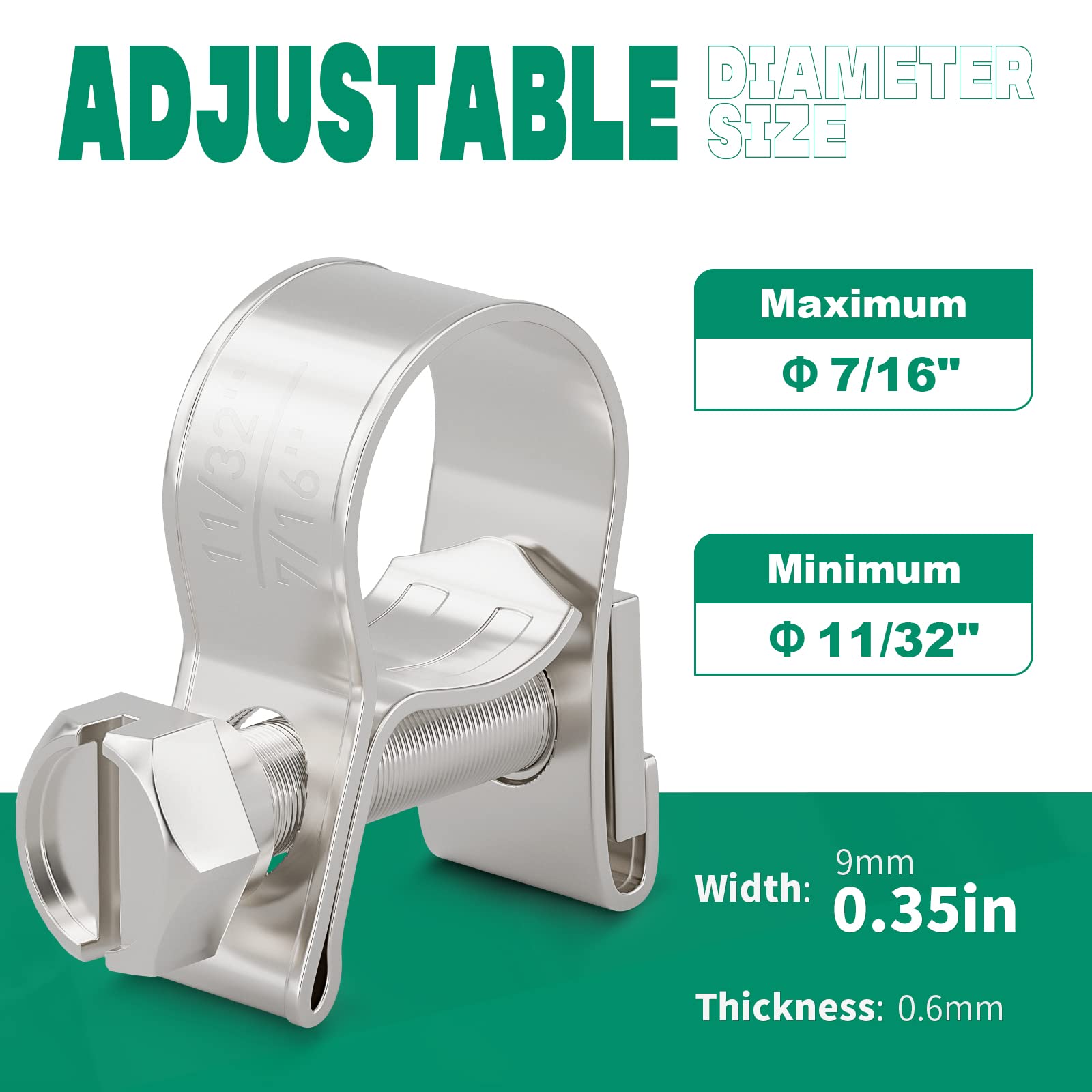 OURU Fuel Line Hose Clamp:Our 20pcs gas line clamps with adjustable screws,features flexible adjustability,freely adjustable size range is 11/32"-7/16" (9-11mm). The size standard has no deviation,which can meet your daily needs for products of different sizes