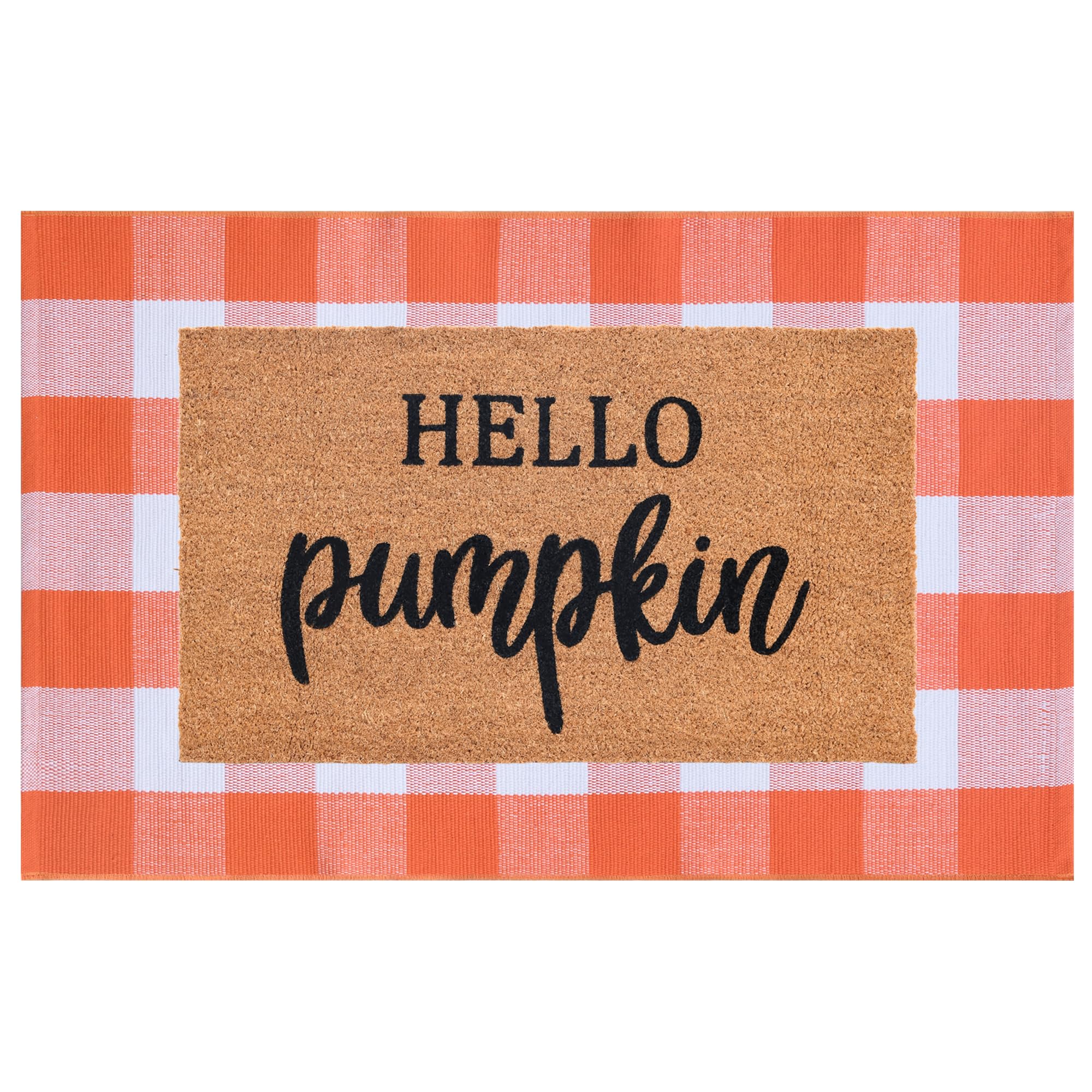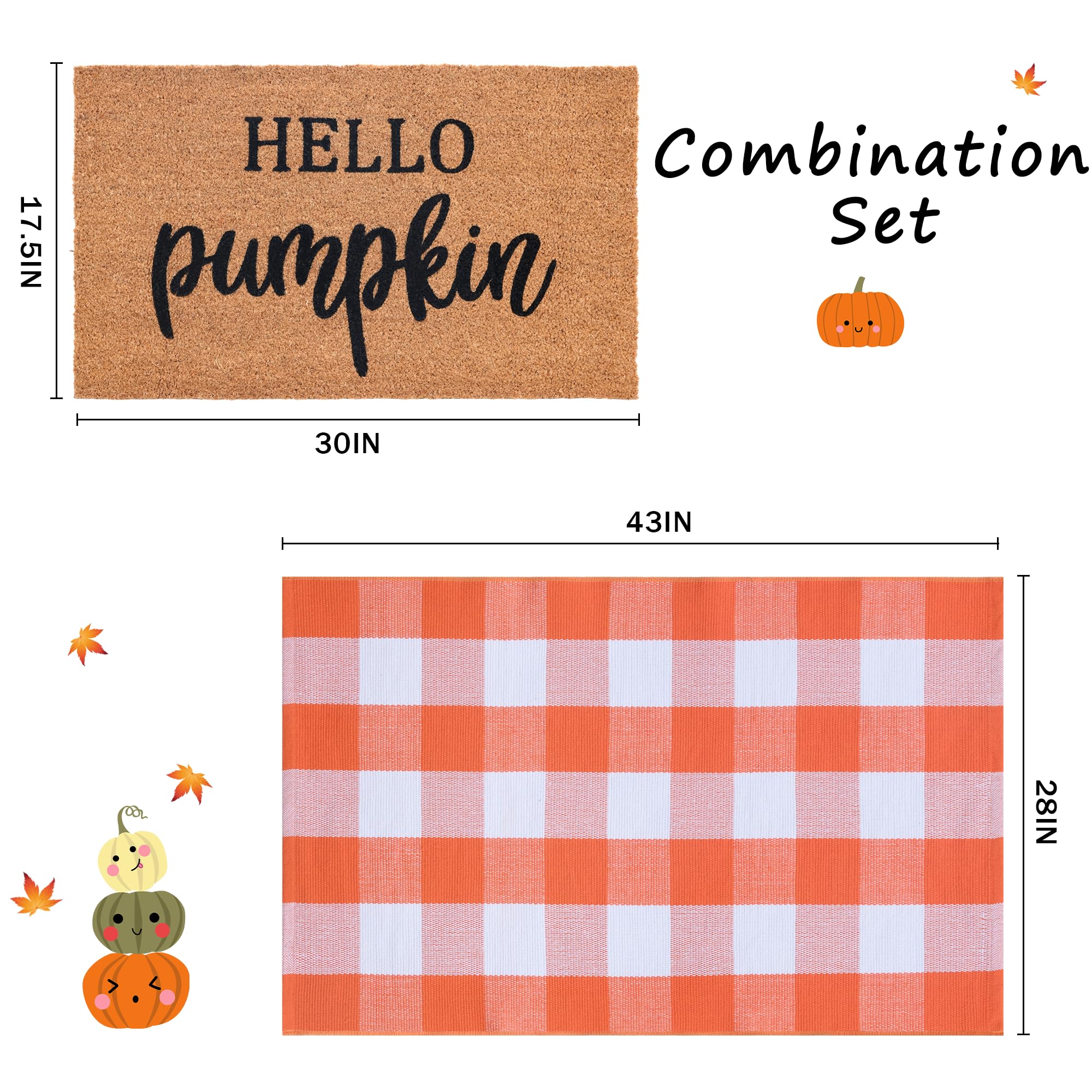 Enhance your home's style and functionality with our ideal decor set; It includes a 100% coco coir welcome mat and orange white plaid outdoor rug, perfect for upgrading your front porch; Elevate your fall front porch with these versatile door mats