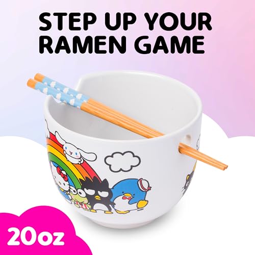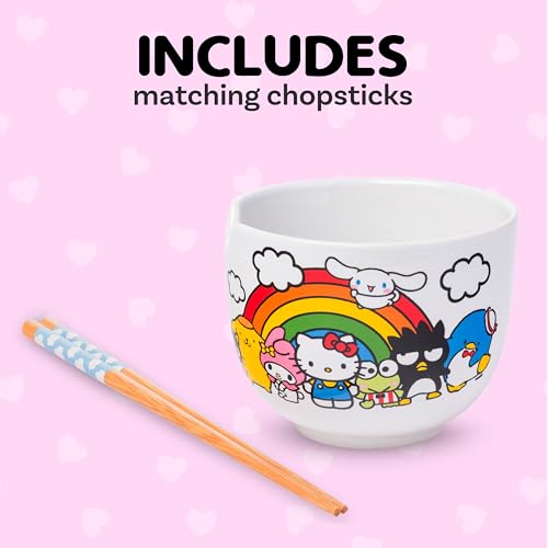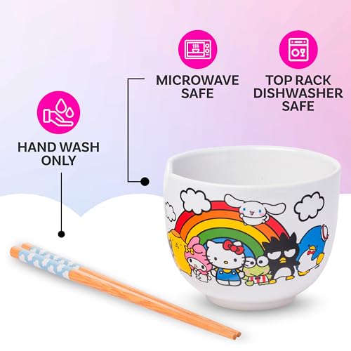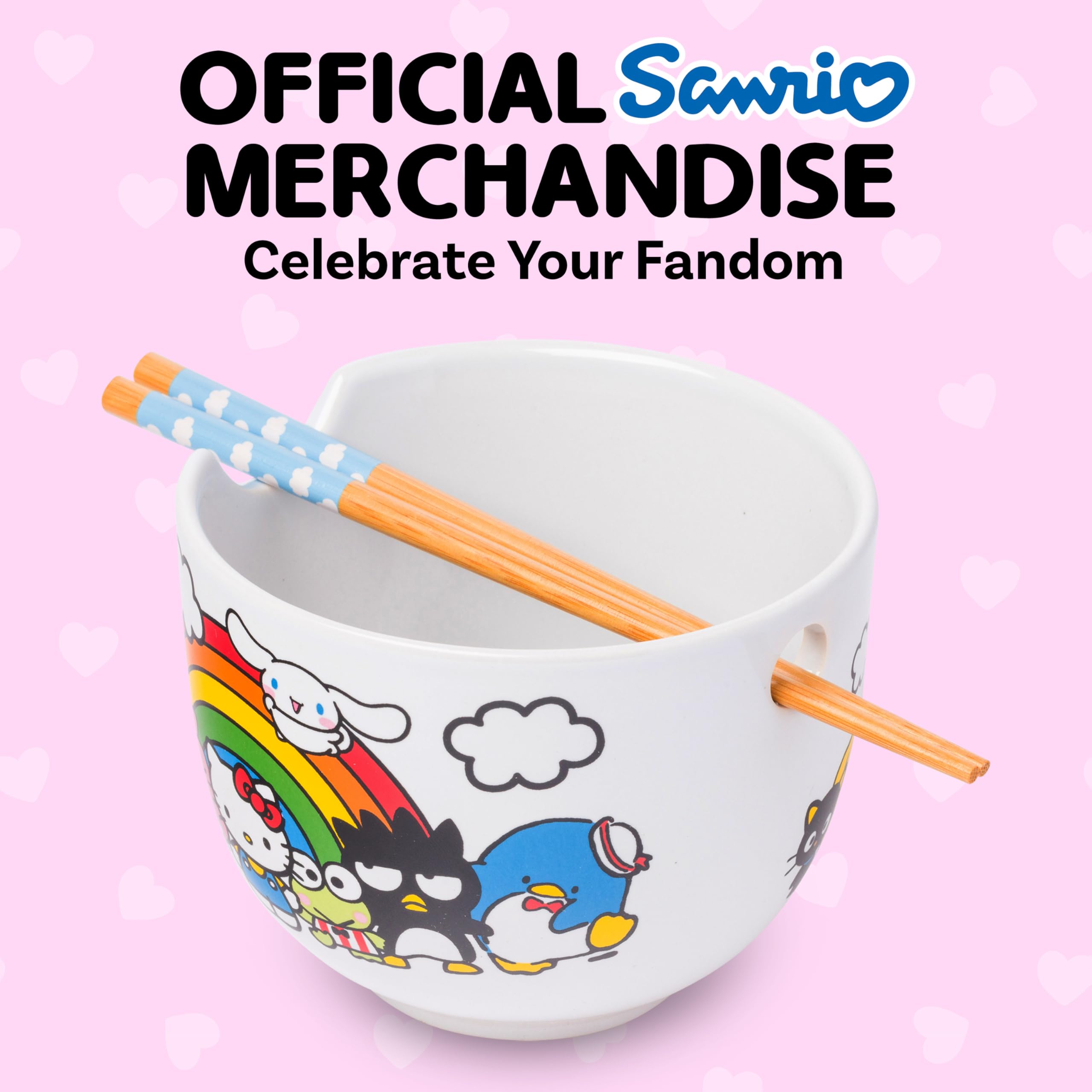 Enjoy a steaming bowl of ramen, soup, rice and more in this adorable 20 oz white Hello Kitty ramen bowl. This microwave-safe, dishwasher-friendly bowl comes with a pair of matching chopsticks. Ramen dish features Hello Kitty, Keroppi, Badtz-Maru, My Melody and other Sanrio friends infront of an adorable rainbow background. It makes a perfect Christmas, birthday or housewarming gift for fans of all ages. Capture the love of Japanese anime, food and culture in this uniquely designed Hello Kitty ramen and chopstick set. Silver Buffalo provides fans with their favorite official character merch. Working in collaboration with licensors and brands, Silver Buffalo develops unique, creative, and ground-breaking products with a devotion to detail and innovation. Silver Buffalo prides itself on manufacturing and distributing playful products that connect fans with their favorite cartoon characters, superheroes, movies, tv-series and more. Celebrate your fandom!