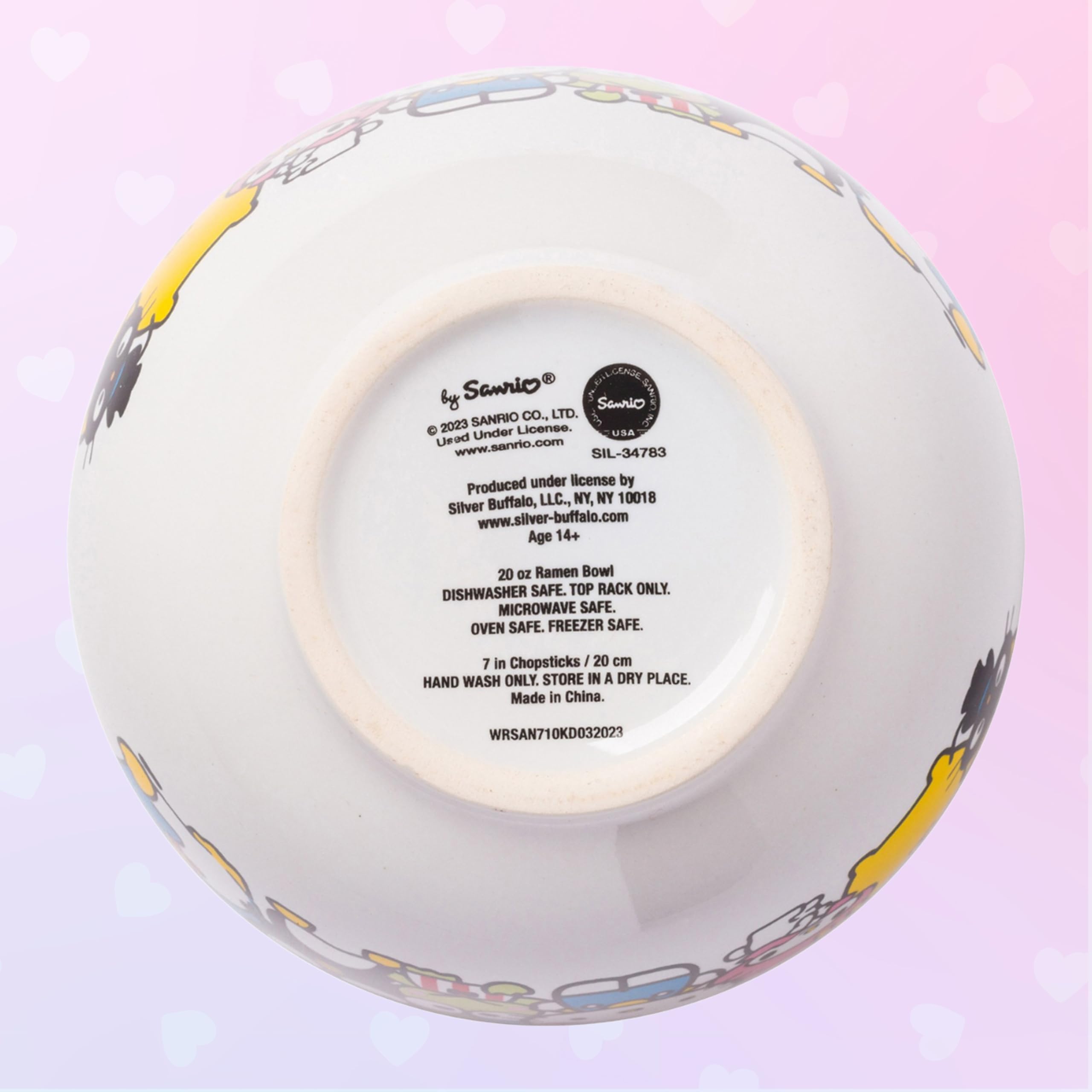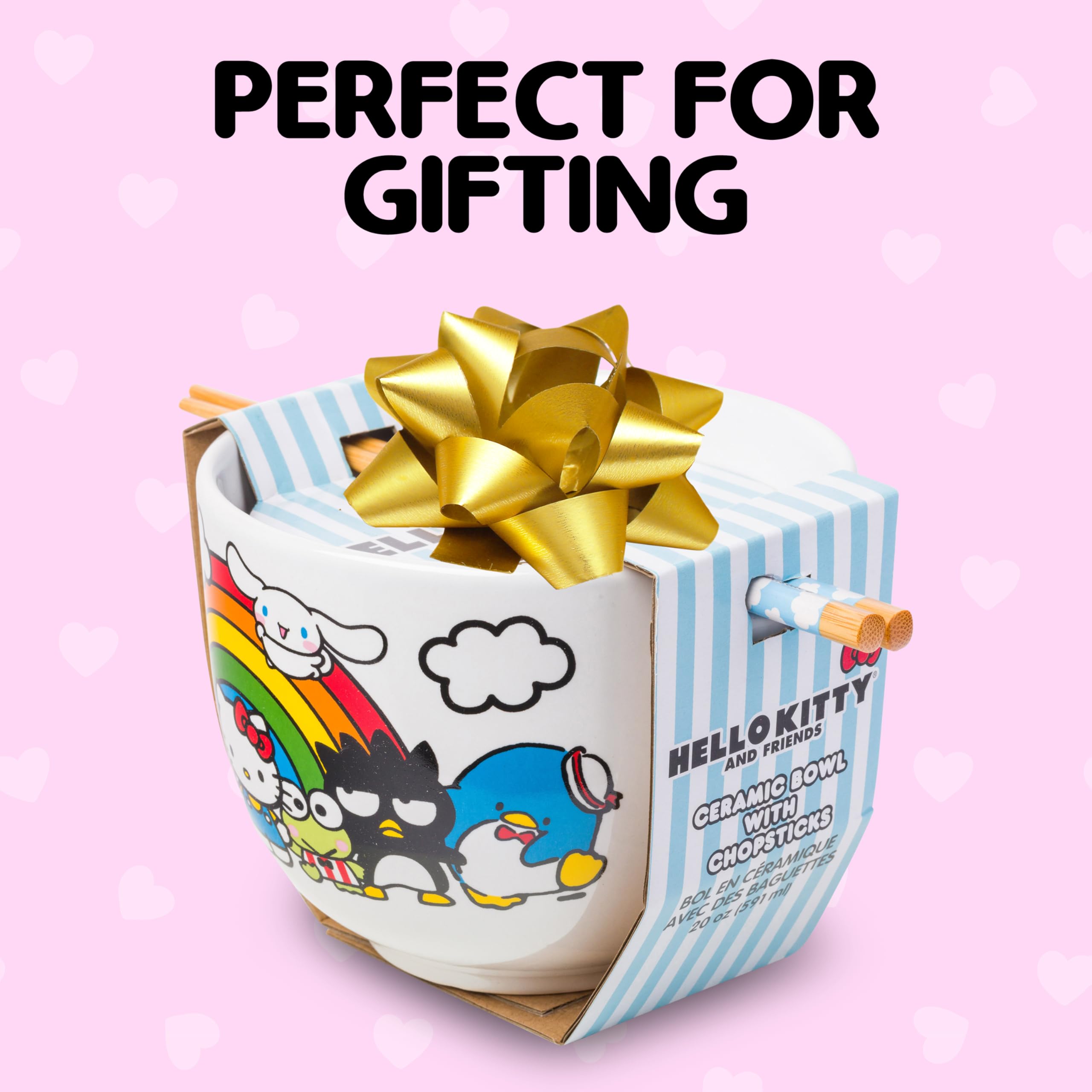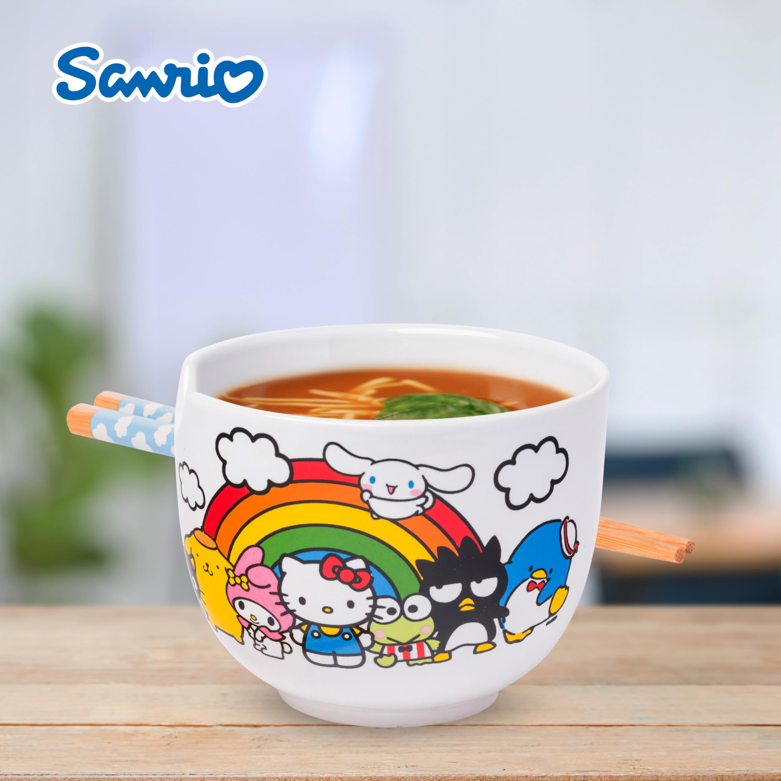 HELLO KITTY BOWL: Adorable white ramen bowl features Hello Kitty, Keroppi, My Melody, Badtz-Maru and other friends in front of an adorable rainbow background.