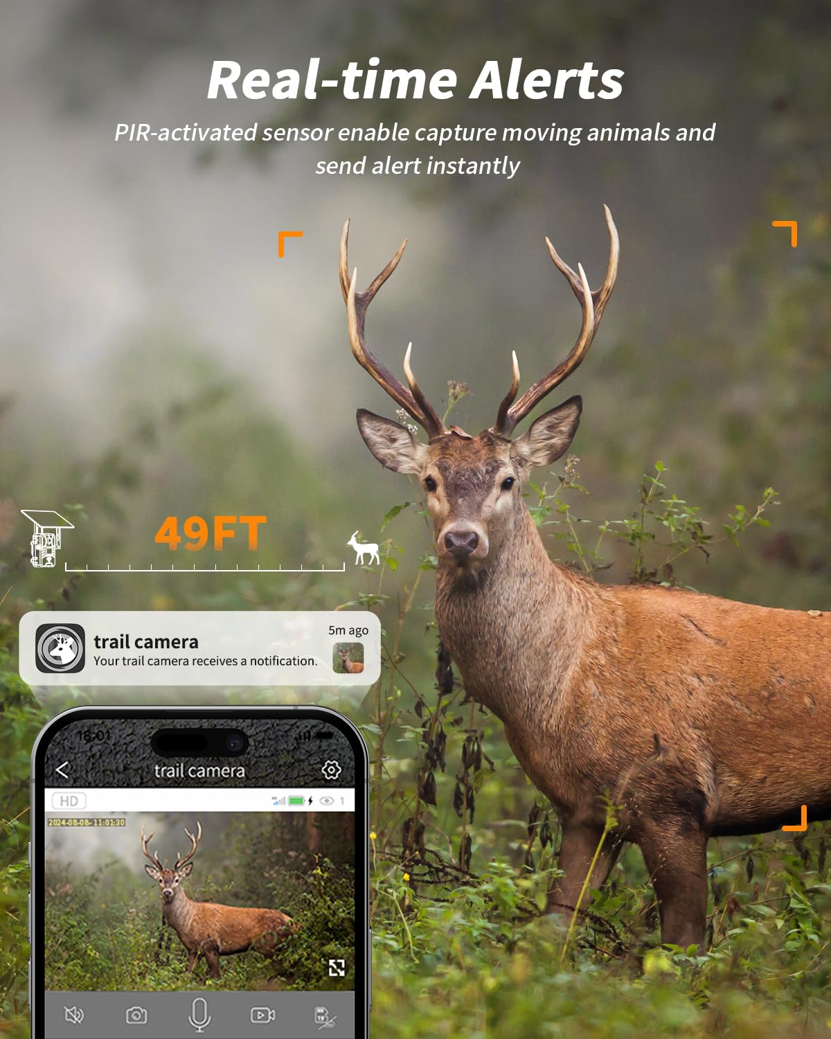 【0.2s Trigger Time & Versatile Storage】The cellular trail camera features an adjustable PIR sensor and a rapid 0.2-second trigger speed for precise detection and quick capture of photos and videos. Users receive timely alerts via the Ucon app. Media can be stored on a memory card (up to 128GB, not included) or in cloud storage (30-day trial for new users, followed by a subscription). Users can easily download or playback content on phone.