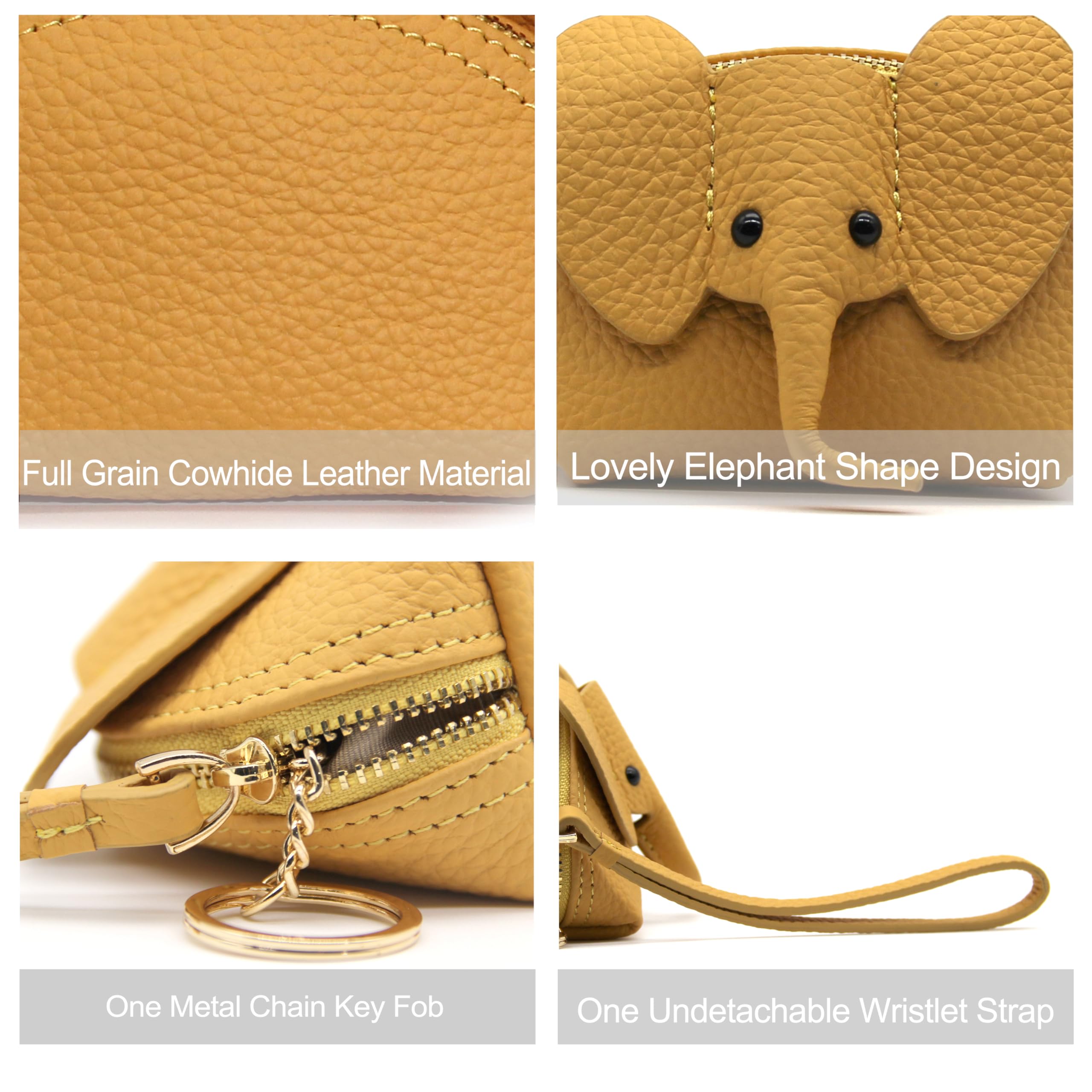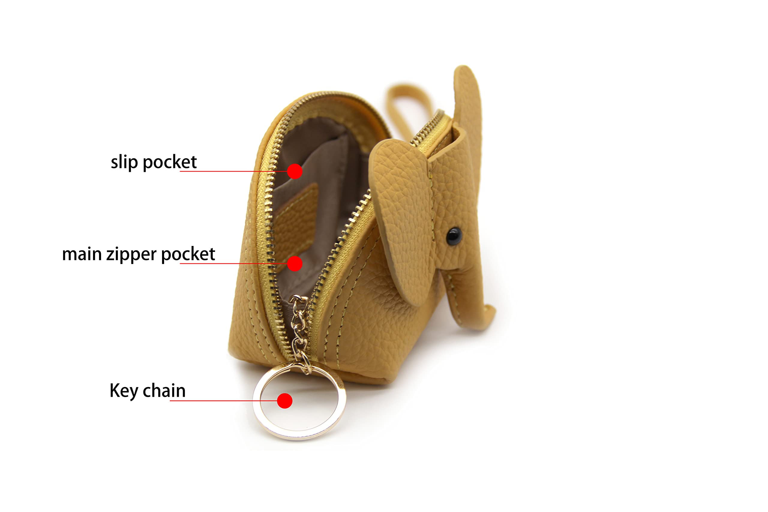 Structure: Elephant Wallets. Top Zipper Closure Opening. Zipper Coin Purses. Inside Including One Slip Pocket. One Metal Chain Key Fob. One Undetachable Wristlet Strap