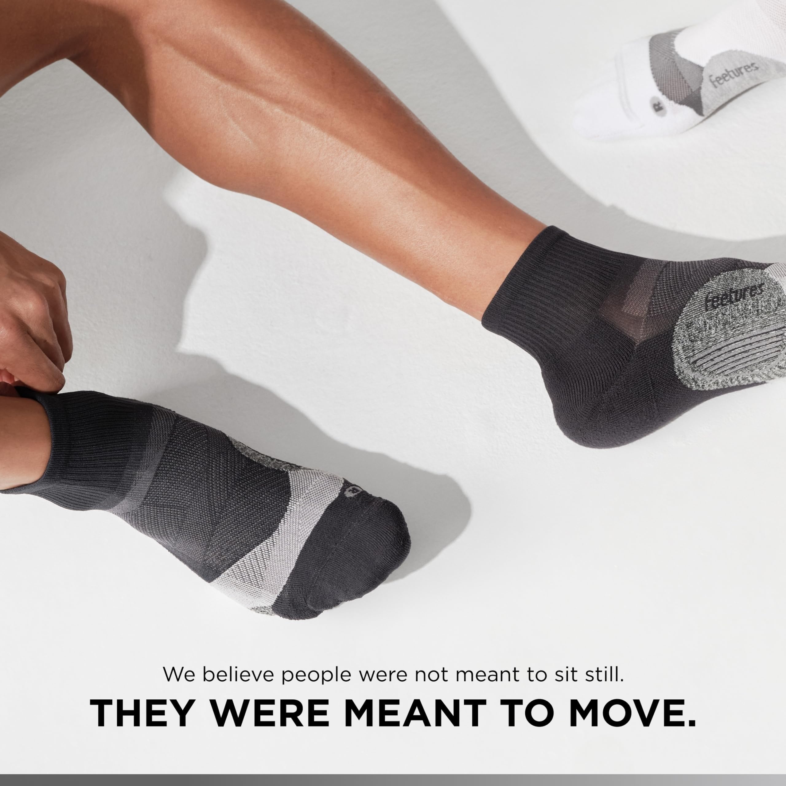 Description Feetures Elite socks are engineered with an enhanced fit and feel. If you're looking for the best performance sock on the planet, our Elite socks have it all. They feature Targeted Compression, which is zone-specific compression where you need it most for superior comfort and support. As a result, they have an anatomical design, meaning they conform to the left and right structures of the foot. This design provides a custom-like fit and reduced risk of blisters. Plus, our Ultra Light Cushion is our thinnest cushion option that provides a lighter, cooler feel. These quarter socks have a 2" cuff that rests just above the ball of your ankle for more coverage. Dedicated to helping people achieve their personal best and pursue an active lifestyle, Feetures designs high-quality socks that provide comfort and support recovery. Our promise to our customers is to deliver fit, feel, and durability to ensure they have the highest quality product to support them. Feetures socks deliver this promise with a custom-like fit, anatomical design, targeted compression, seamless toe, and more features specific to our different sock lines. We strive to innovate in our category and create products that are made to last to ensure we deliver value to our customers.