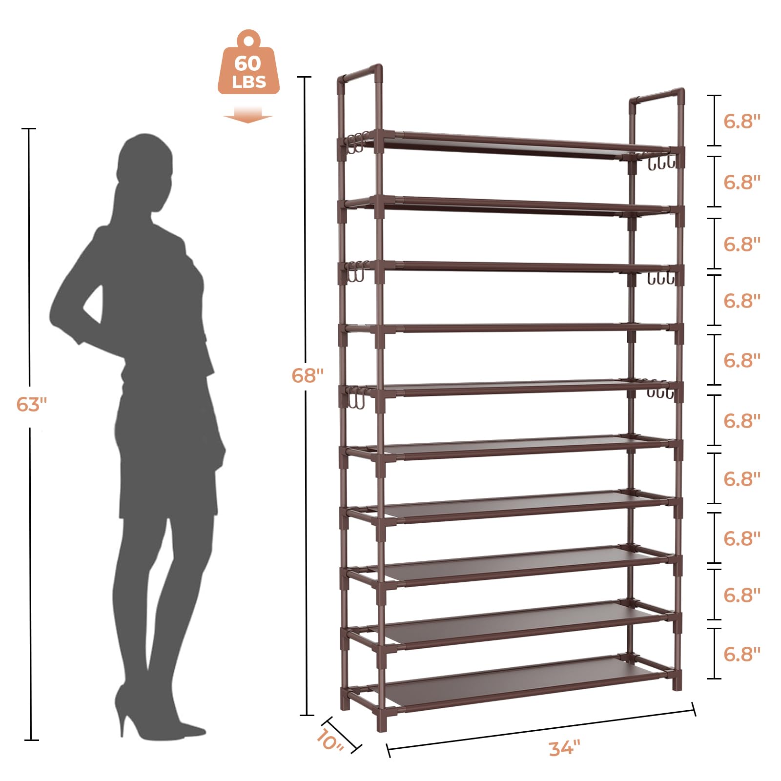 Space Saving Shoe Rack: Size of shoe storage: 34"W x 10"D x 68"H, the floor space is only 0.22m³, free standing shoe racks takes advantage of vertical space, giving an open feel to the space. The large shoe rack perfect for closet, front door entrance, dorm, hallway