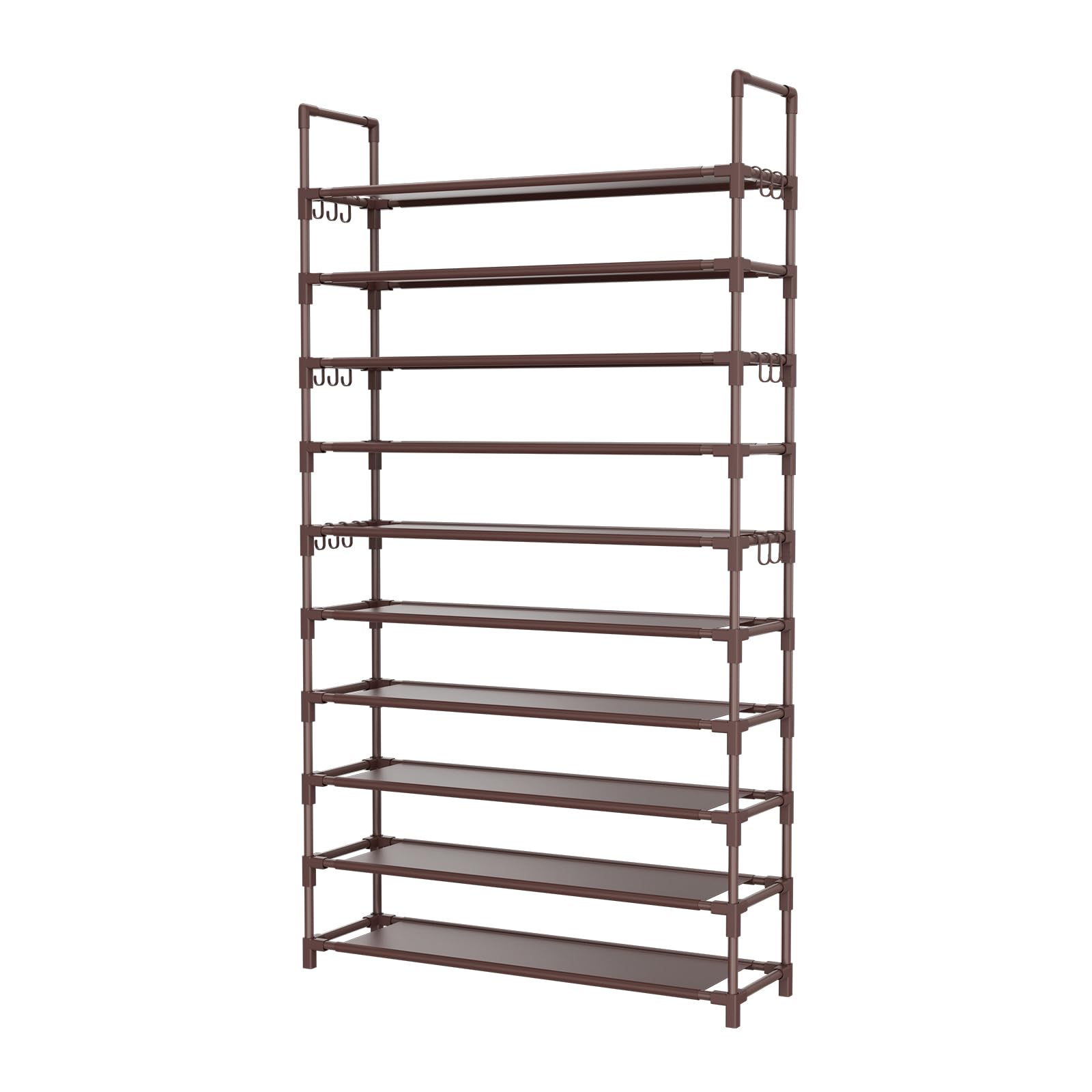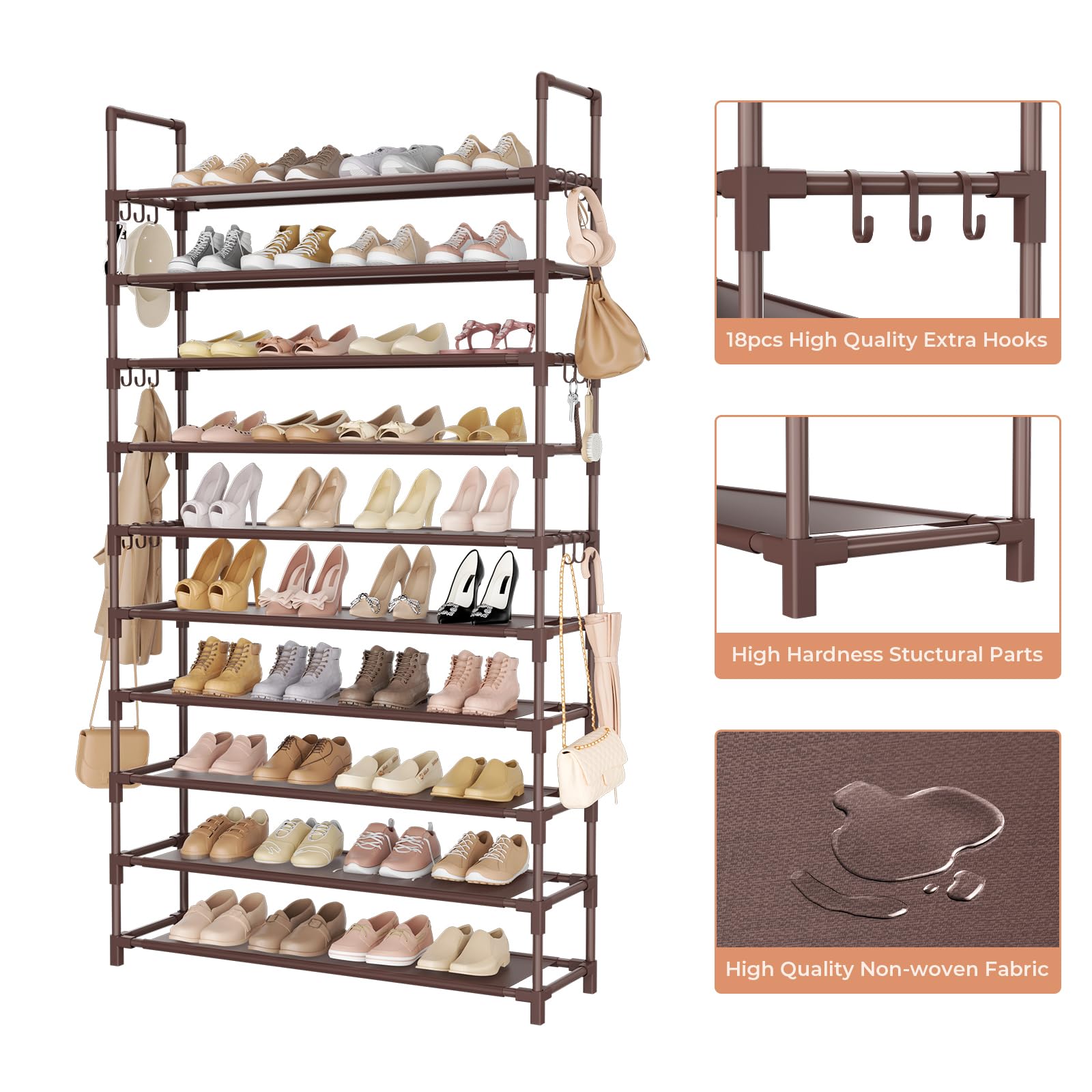 Large Capacity Shoe Rack: This 10 tier shoe rack tall, can storage for 50 pairs shoes and boots, with enough storage space. This shoe rack for closet height of each tier is 6.7", perfect for sandals, slipper, sneakers, boot, heels all types of shoes