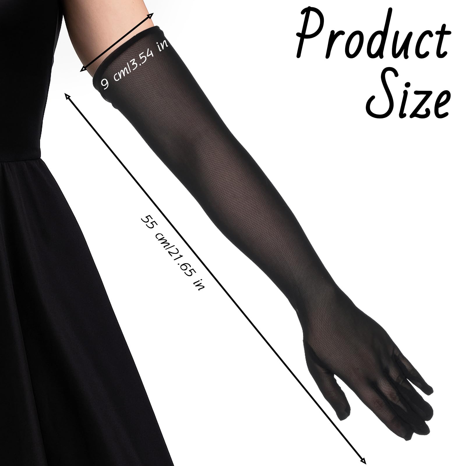 Description Packing list: 1 pair of extra-long thin mesh lace gloves 55cm Specifications: Product name: 1 pair of extra-long thin mesh lace gloves 55cm Material: polyester Color: black Gross weight (g): 40.5 Product size (cm): length 55cm/21.65inch, width 9cm/3.54inch This pair of elegant formal gloves is something that every woman would love to have in her wardrobe. Take it to your mother, sister, grandmother, or friend. They would be grateful to have it for sure.