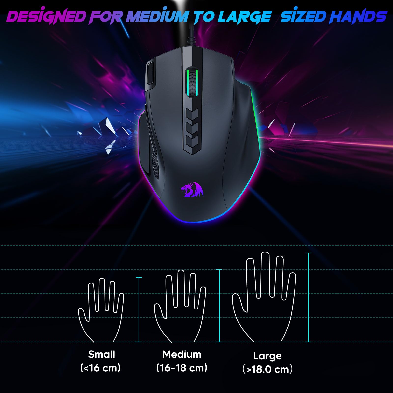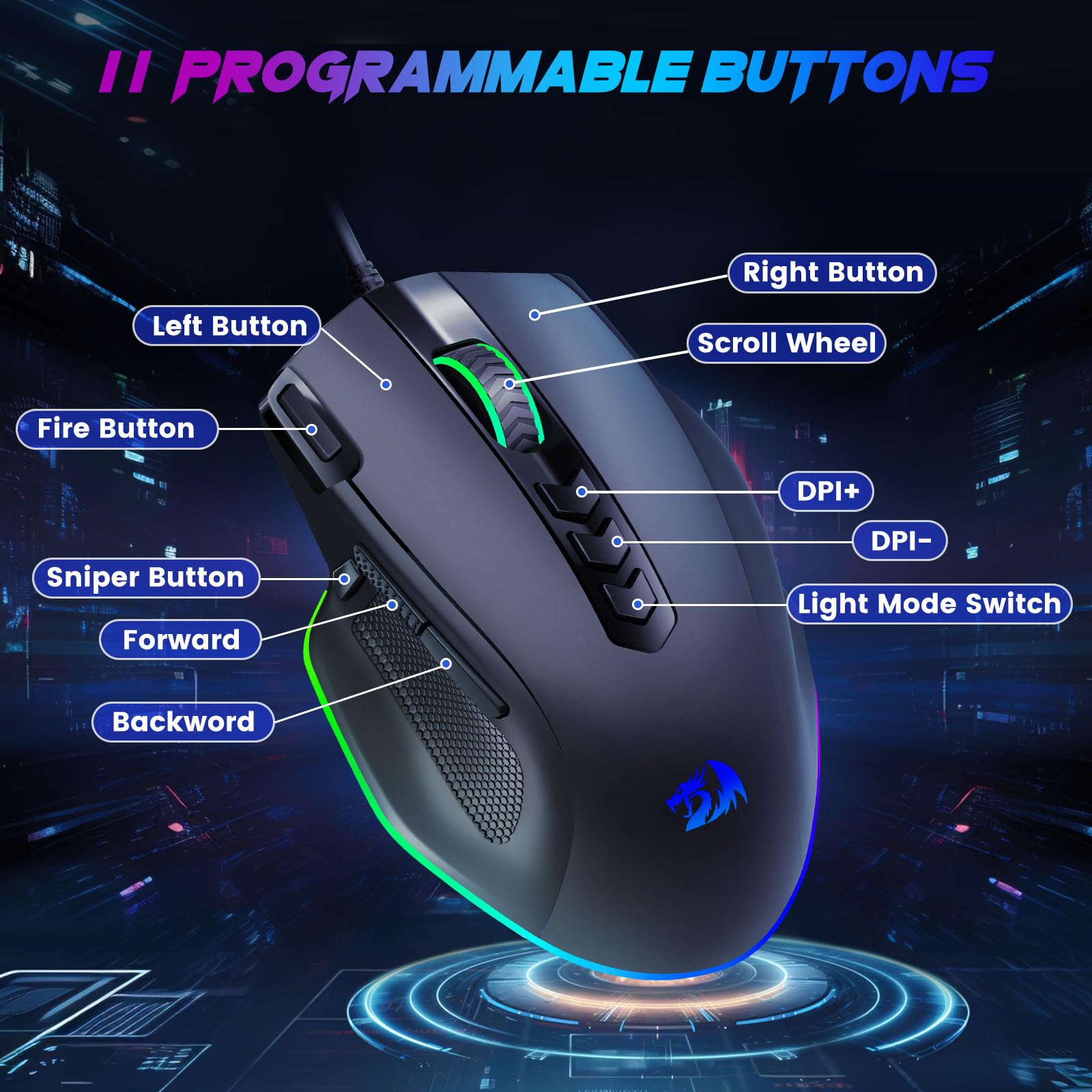 Customize Your Gaming Ambiance- Equipped with a stunning RGB backlight featuring 7 dynamic modes. With Redragon's exclusive programming software, you can effortlessly adjust the wired gaming mouse's backlight color, choosing from a breathtaking palette of 16.8 million colors. Immerse yourself in the gaming world with a personalized and vibrant gaming setup