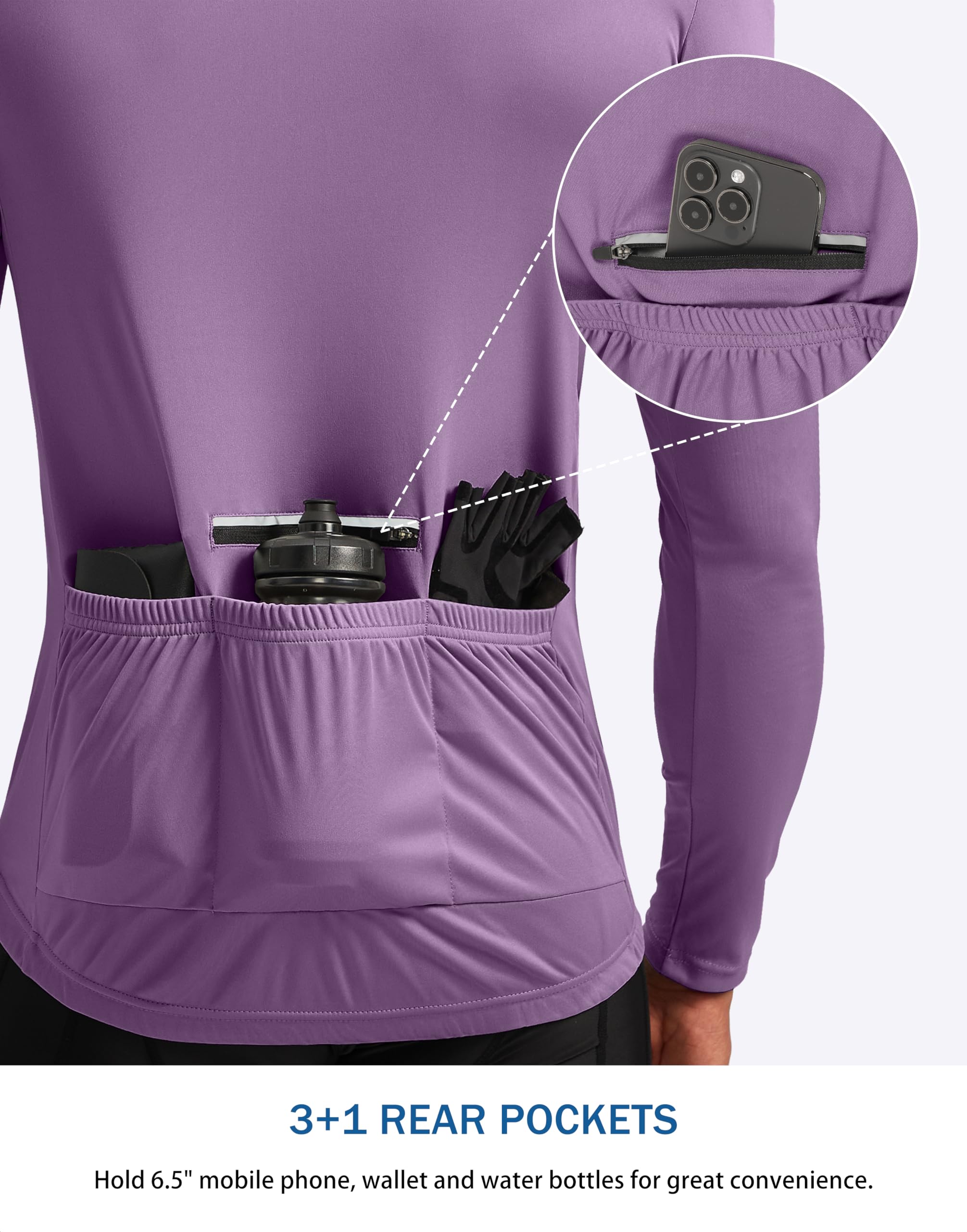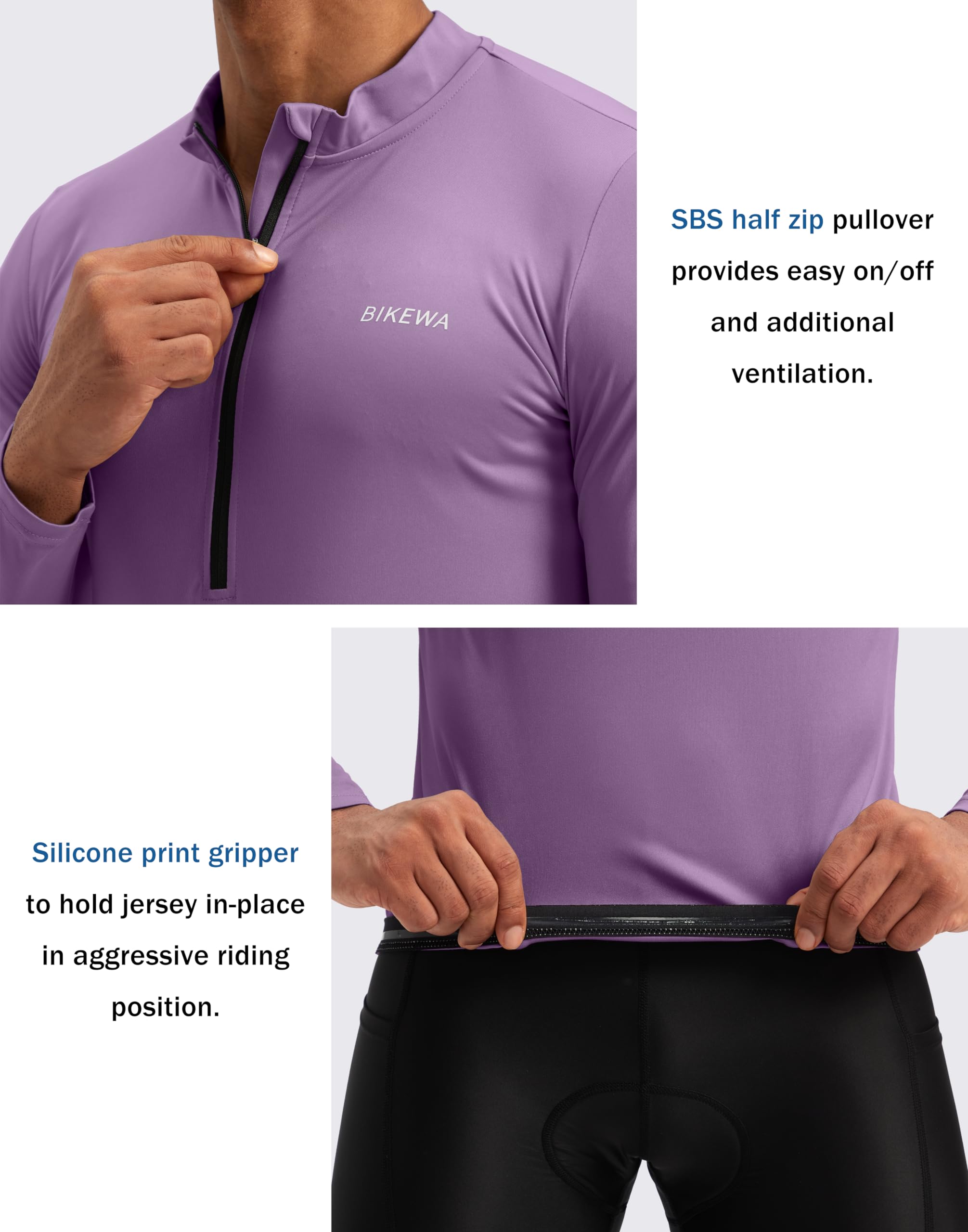 Easy Wear & Silicone Gripper Hems: 11 inch SBS half zip pullover provides easy on / off and additional ventilation, stand collar avoid pucker. Front and rear gripper to hold jersey in-place in aggressive riding position, preventing fluttering in the wind.