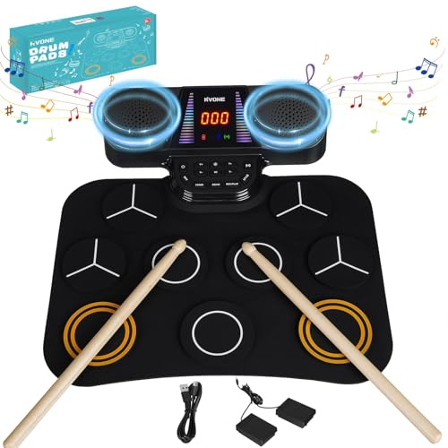 [3W Dual Stereo Speakers] Integrated left and right 2 louder speakers deliver full-range audio, RED50 electronic drum pads is really loud enough for home practice without angy additional equipment. It also supports a 3.5mm headphone output, you can wear a set of headphones to improve your technique without disturbing your others. It is so easy to store that you can roll it up, and pack it in your bag.