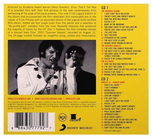 Digitally remastered and expanded two CD Legacy Edition of this classic live experience from Elvis. Disc One contains the complete original album plus four bonus studio singles and an additional five studio outtakes. Disc Two contains a complete set recorded at the August 12th, 1970 Dinner Show.